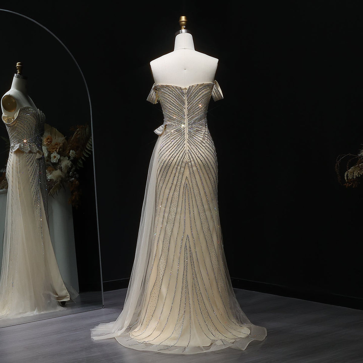 Sparkly Crystal Off Shoulder Beige Evening Dress with Slit SS104