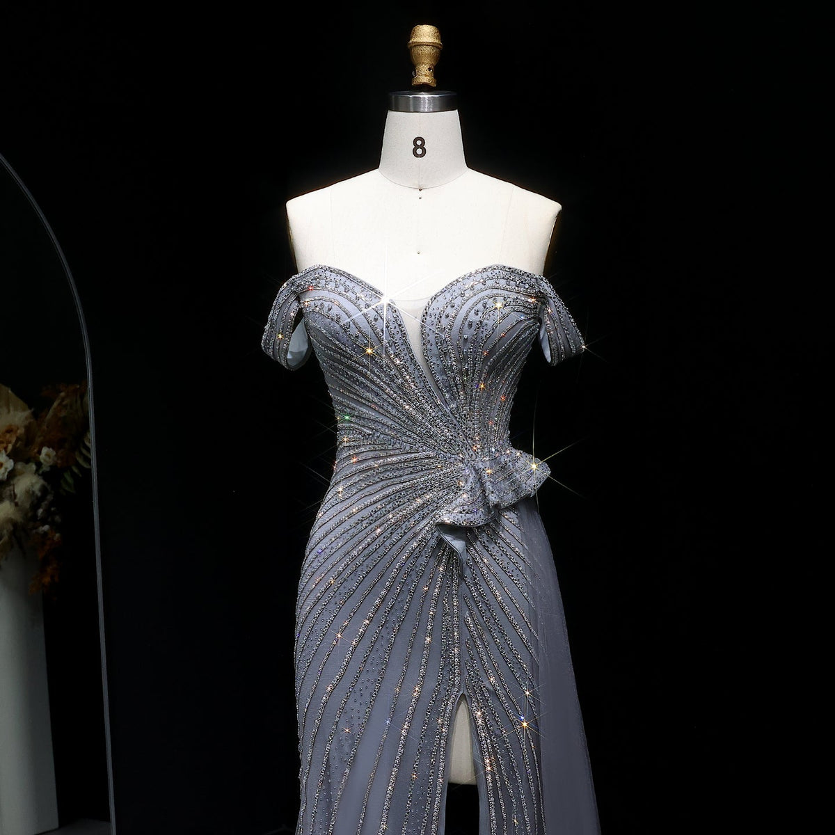 Elevate your evening elegance with this Sparkly Crystal Off Shoulder Beige Evening Dress. Featuring a sophisticated off-shoulder design and a graceful slit, it combines subtle shimmer with refined tailoring. The beige hue complements a variety of skin tones, while the crystal embellishments add a touch of glamour, perfect for formal occasions or special events. Crafted to enhance your silhouette, this dress offers both style and comfort for a confident, polished look.