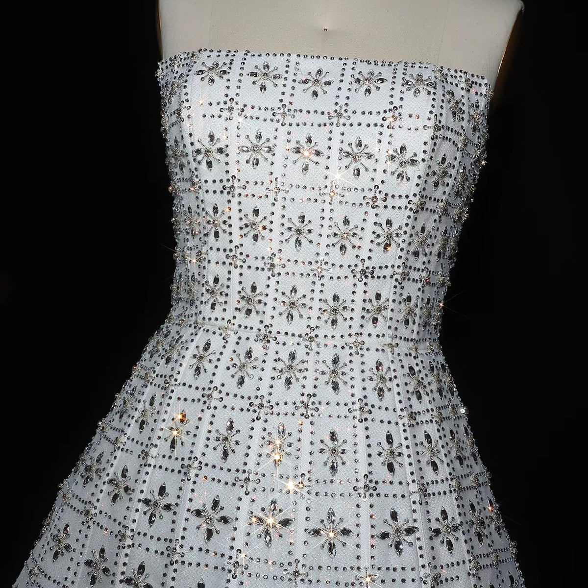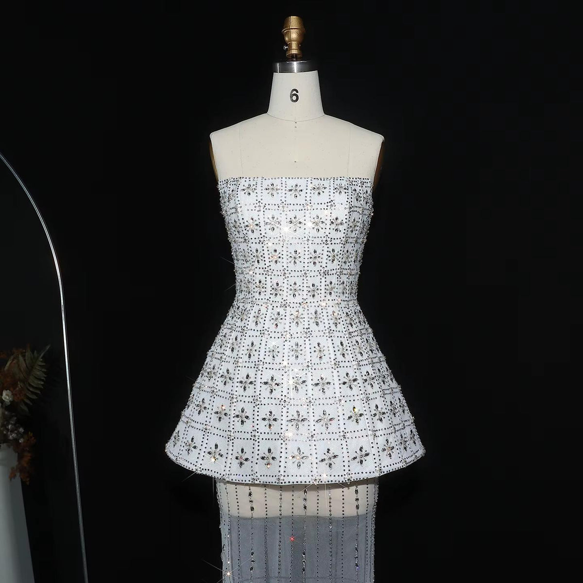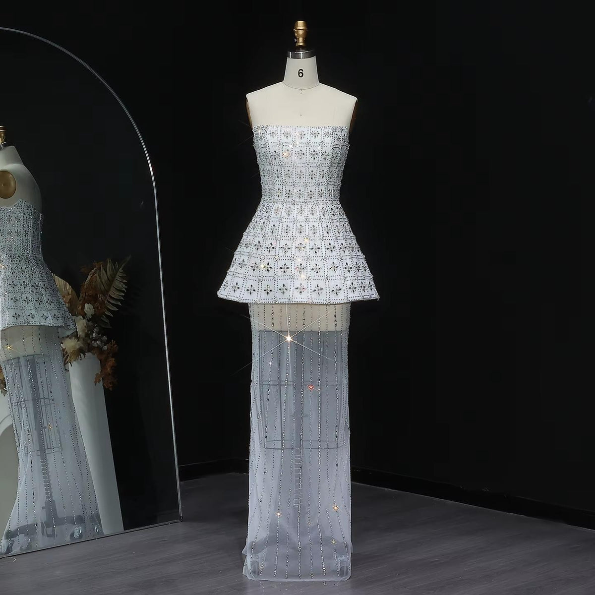 Make a statement in this Stunning Strapless Luxury Crystal Dubai White Evening Gown with Flowing Cape for Women Wedding Party SS545. The flowing cape adds a touch of elegance to this strapless gown, while the crystal detailing adds a touch of luxury. Perfect for making a glamorous impression at any wedding party.