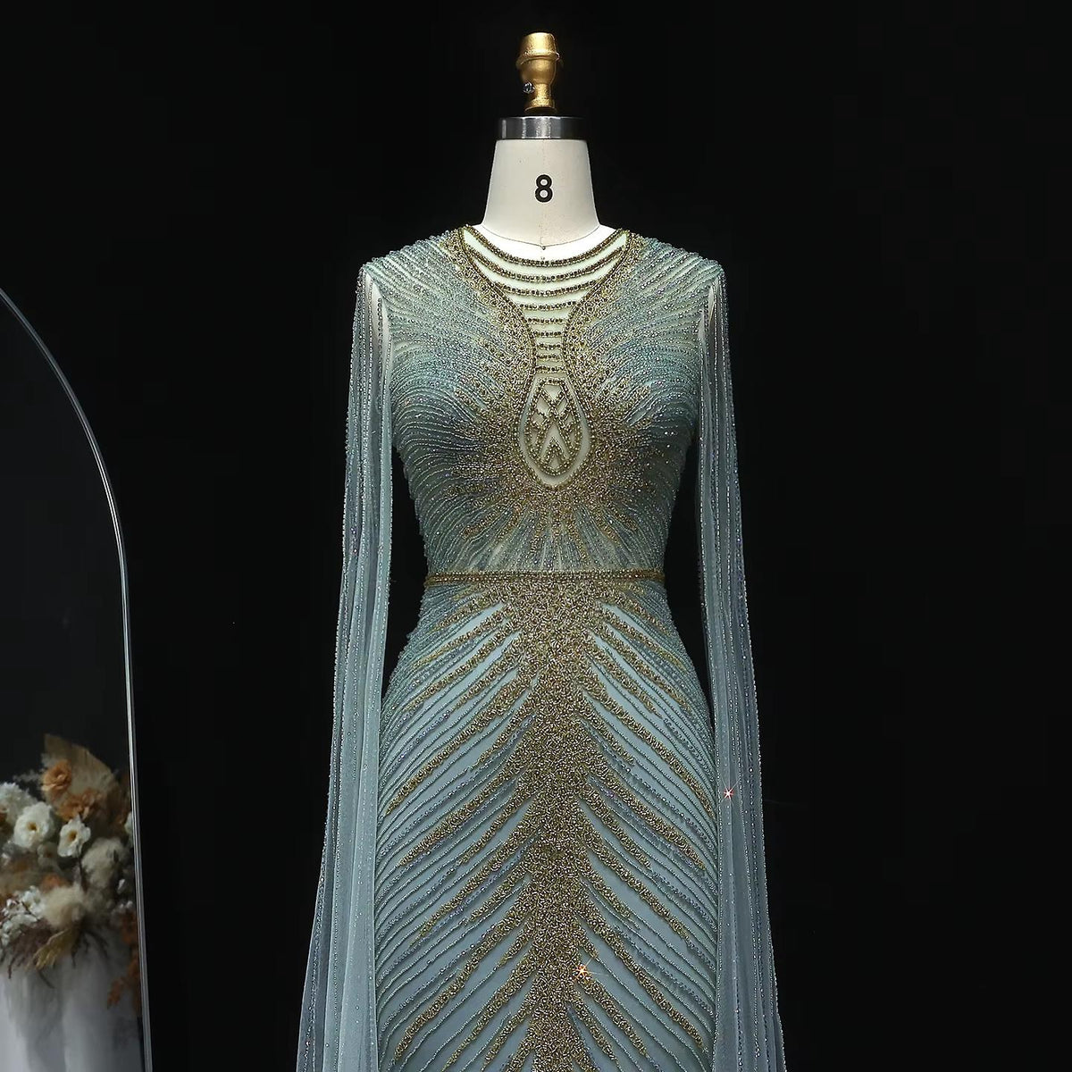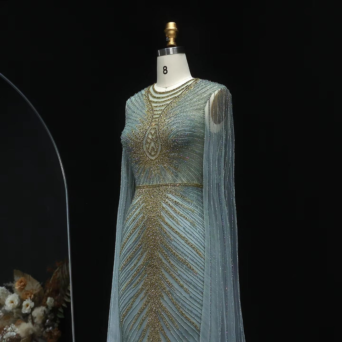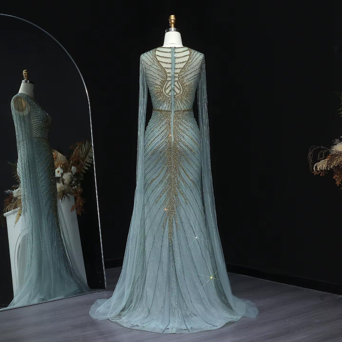 Turquoise Beaded Mermaid Evening Dress with Cape Sleeves SS028