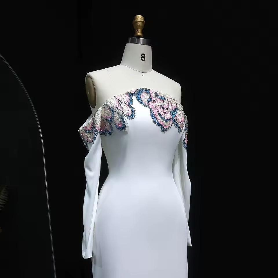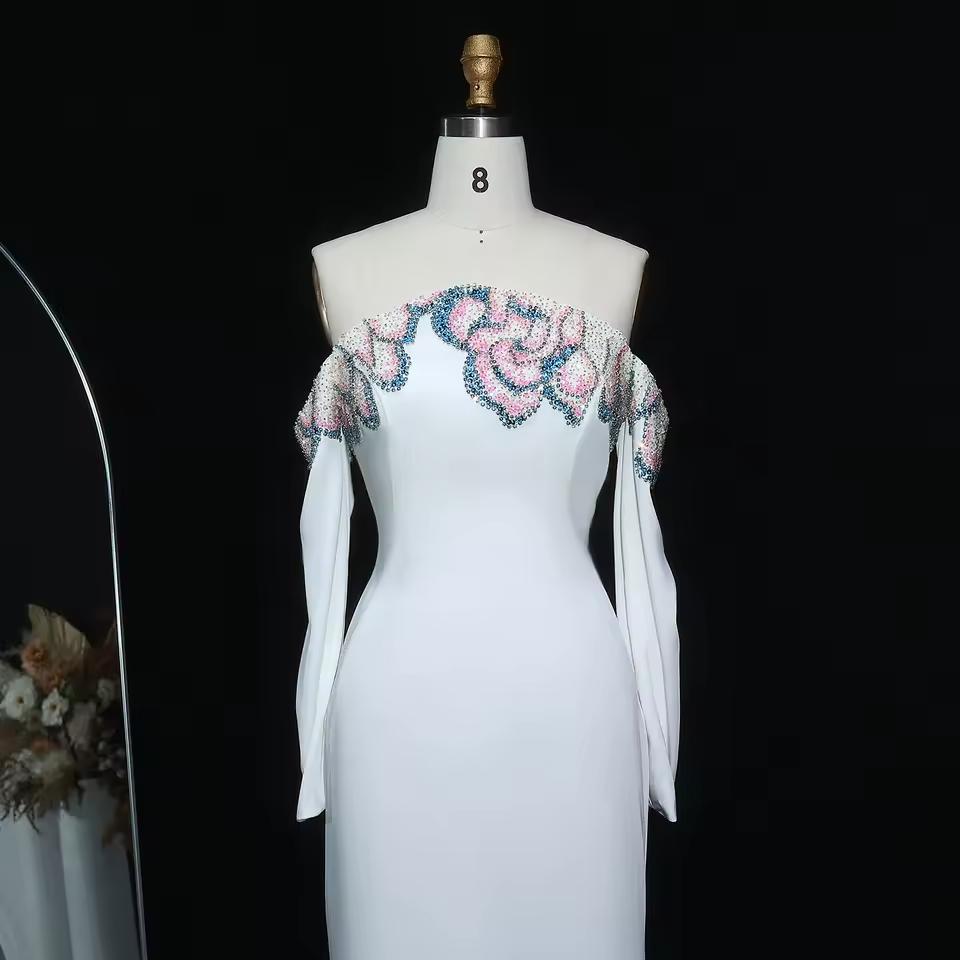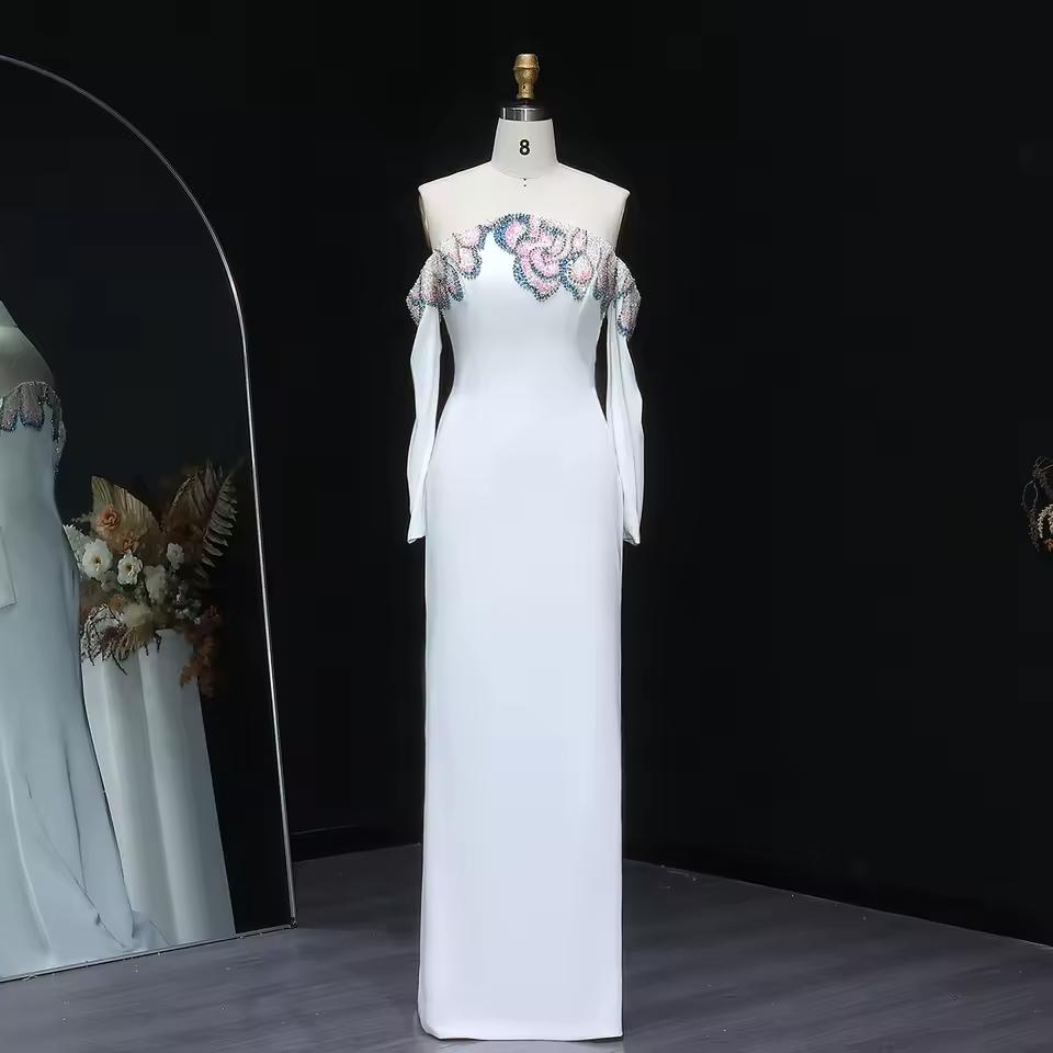 Expertly crafted and designed, our White Off Shoulder Beaded Evening Dress SS512 is the epitome of elegance. The off-shoulder neckline and intricate beading add a touch of sophistication, while the flowy silhouette provides a flattering fit. Perfect for any special occasion, this dress is sure to make you stand out in a crowd.