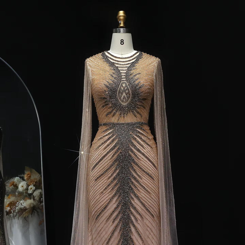 Turquoise Beaded Mermaid Evening Dress with Cape Sleeves SS028