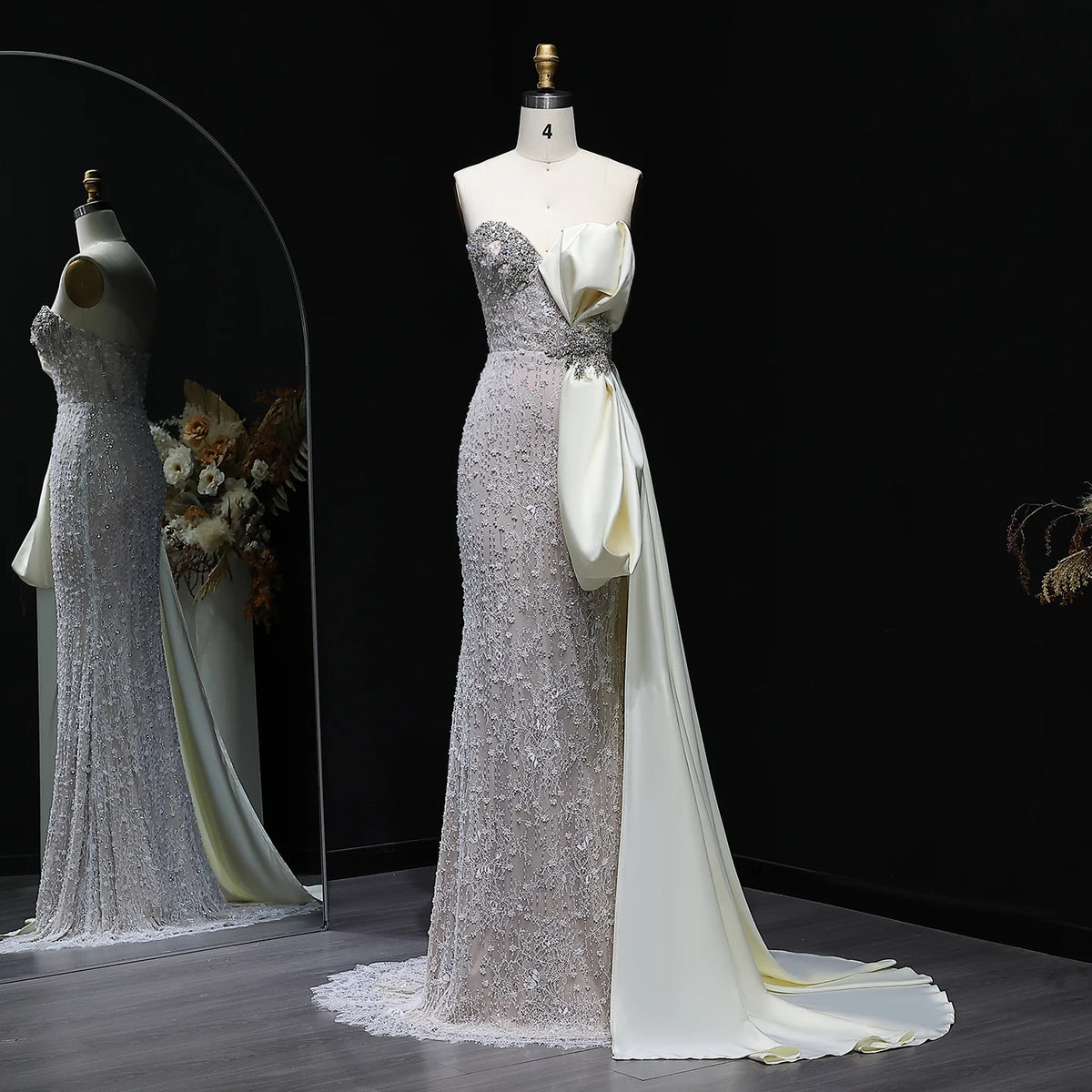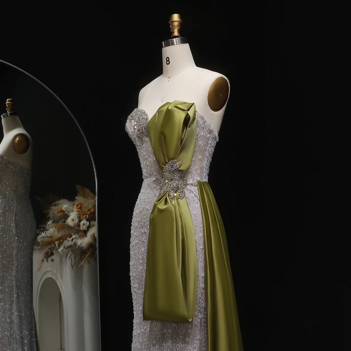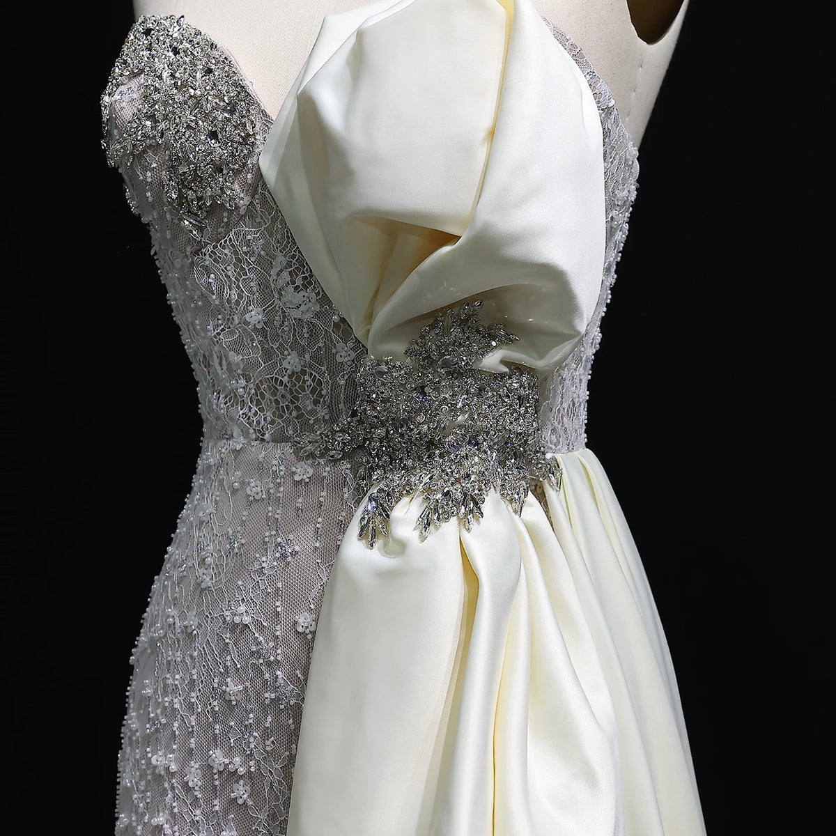 Elevate your evening presence with this Glamorous Crystal Embellished Evening Gown featuring a flowing overskirt. Expertly crafted, the gown combines sparkling crystal details with elegant draping to enhance your silhouette and create a striking, graceful movement. Ideal for formal events, it balances refined sophistication with a touch of drama, ensuring you make a memorable impression.