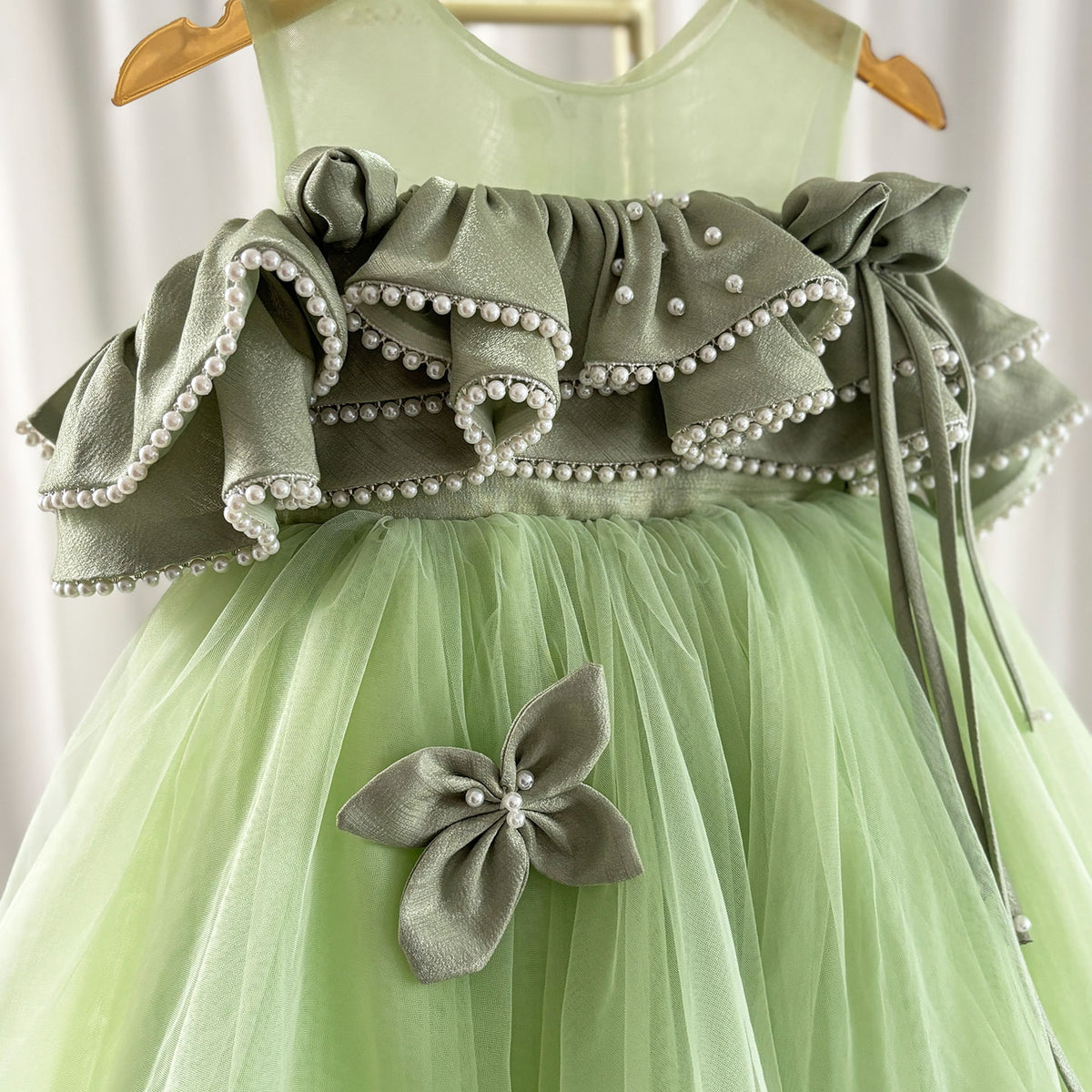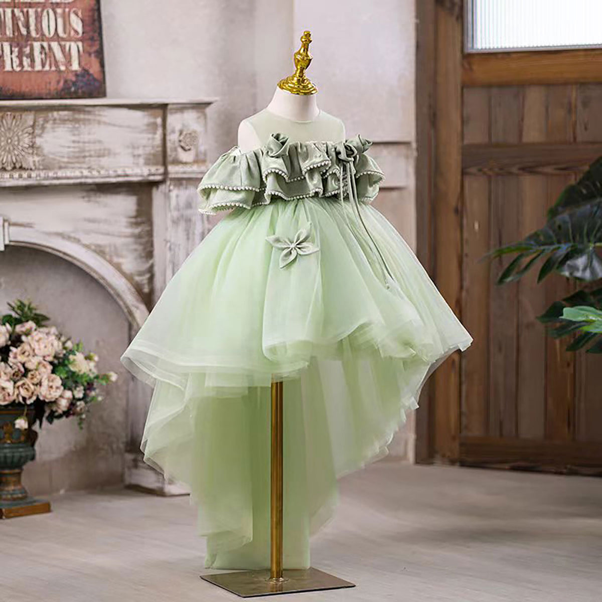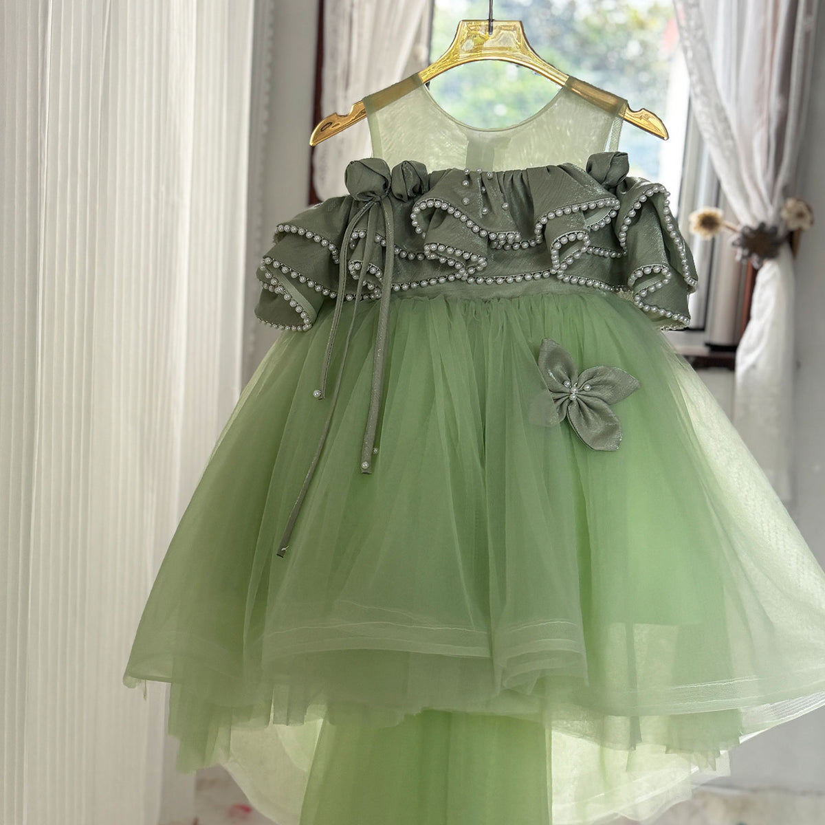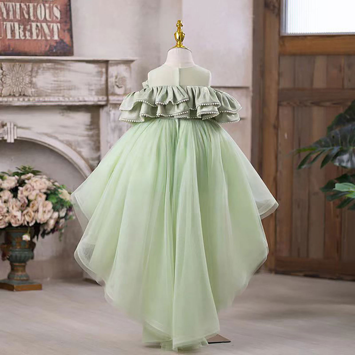 Off-Shoulder Ruffled Pearled Green Tulle Flower Girl Dress J551
