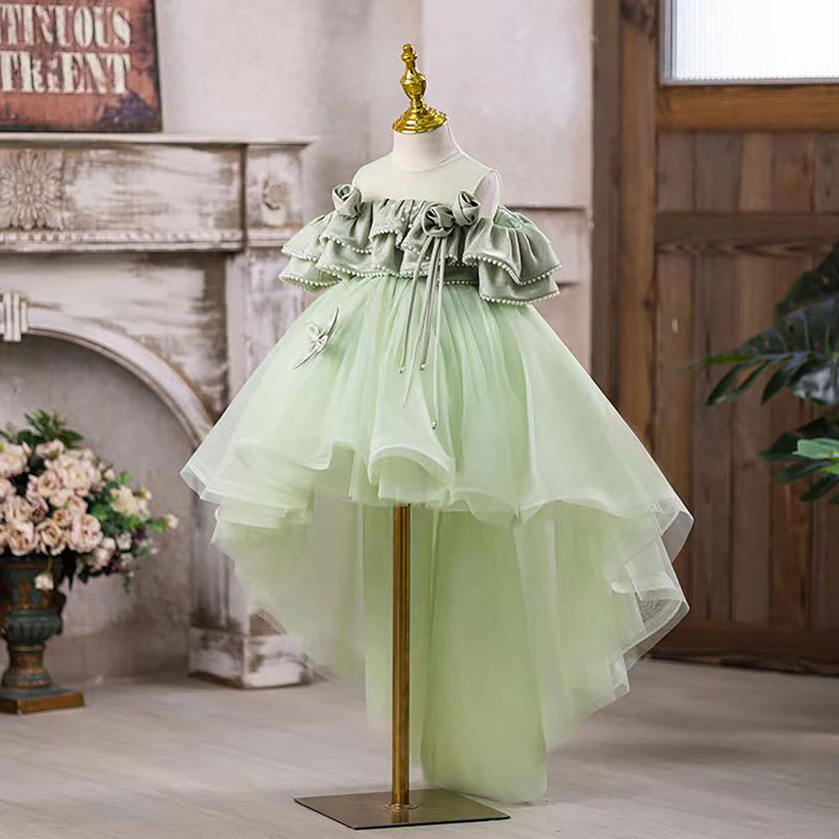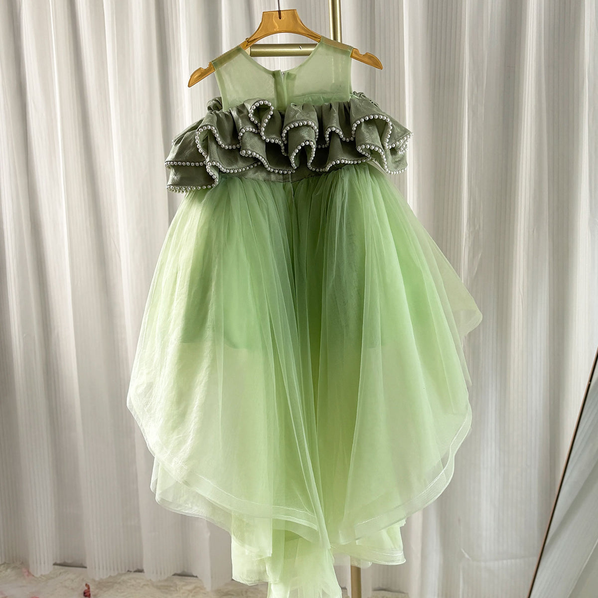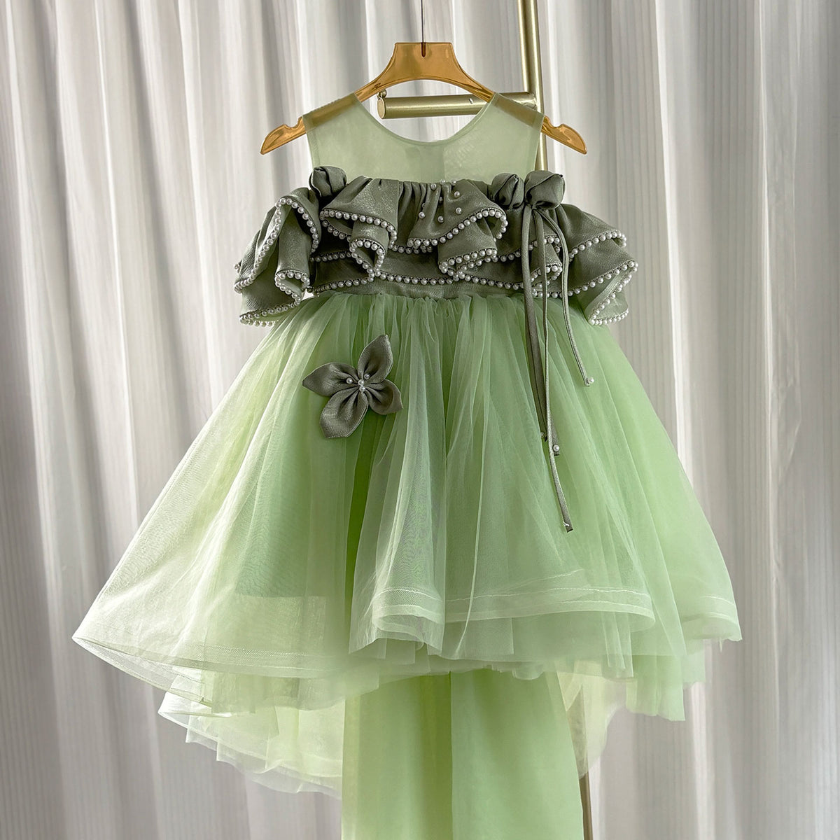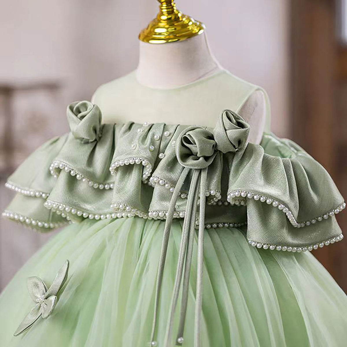 Off-Shoulder Ruffled Pearled Green Tulle Flower Girl Dress J551