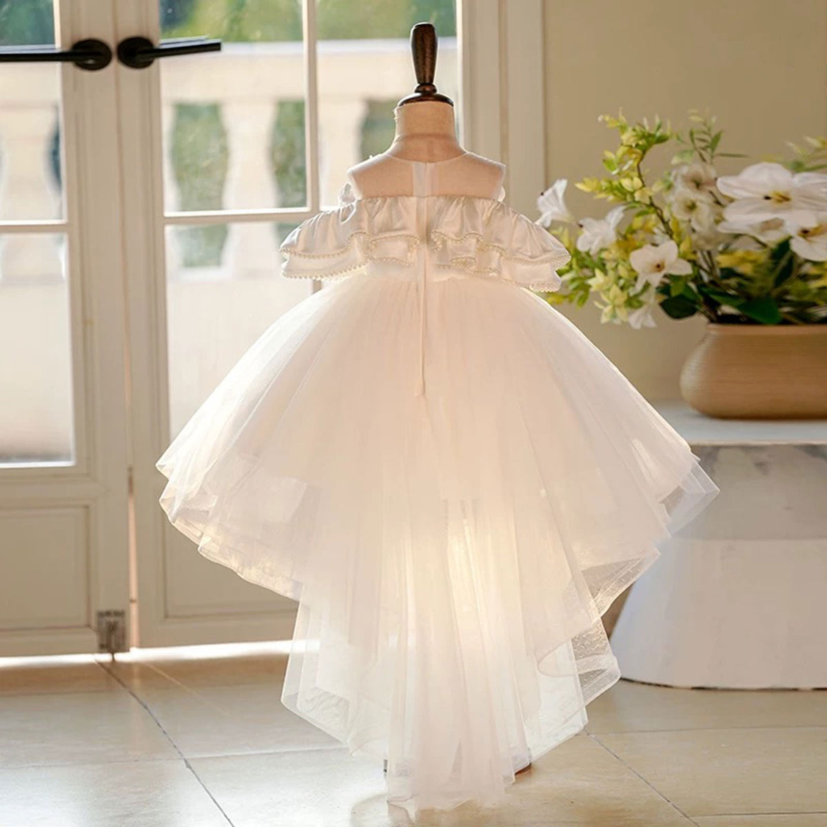 Introducing the Jill Off-Shoulder Ruffled Pearled Green Tulle Flower Girl Dress J551, the perfect combination of elegance and playfulness. The off-shoulder design and delicate ruffles create a charming look, while the pearls and tulle add a touch of sophistication. Dress your little one in this dress for a picture-perfect moment.