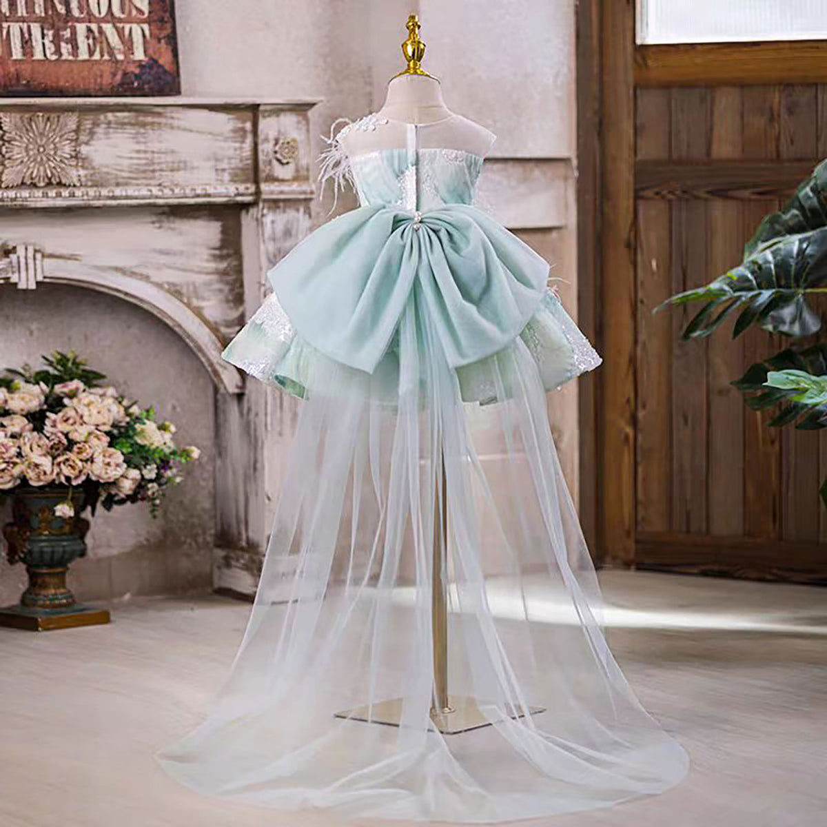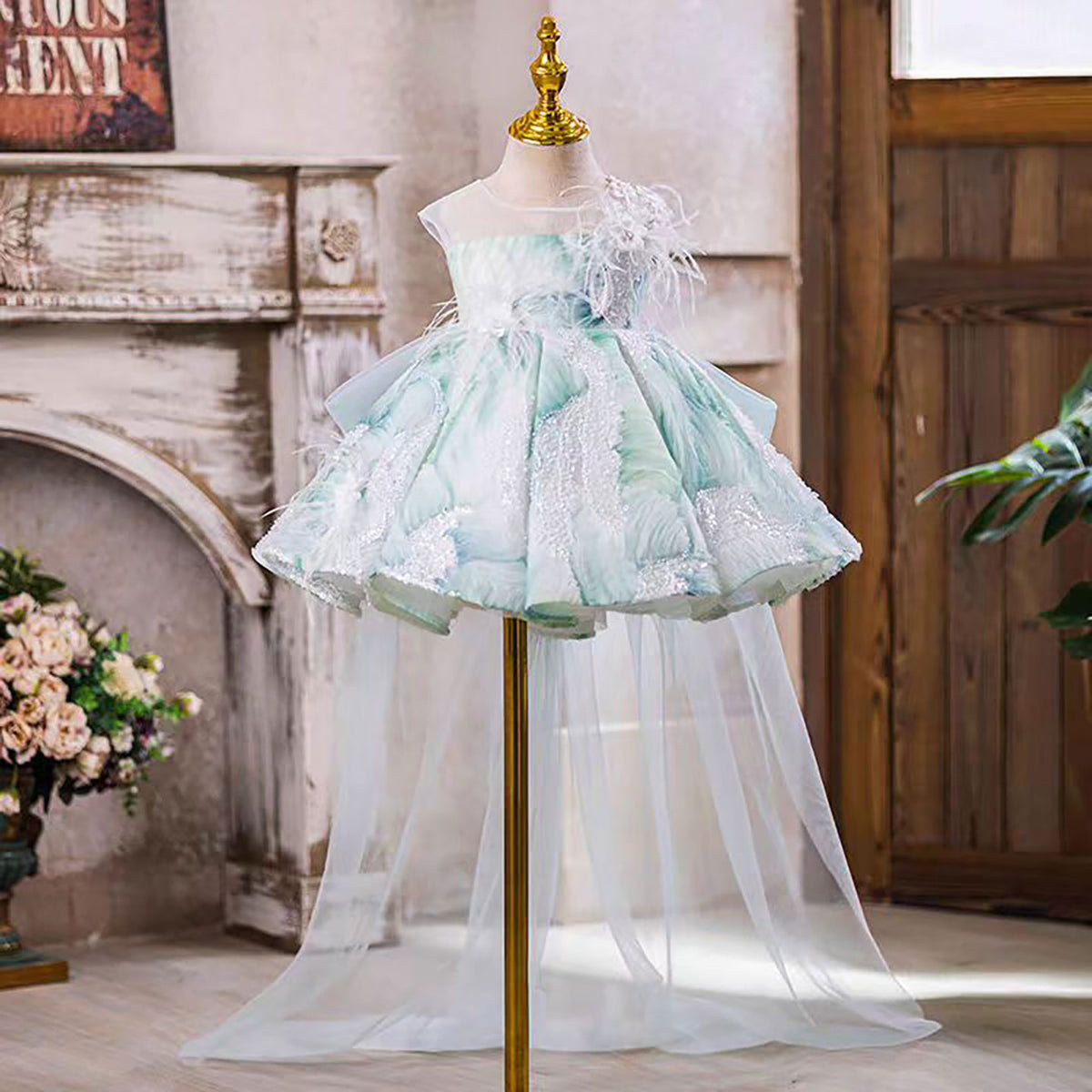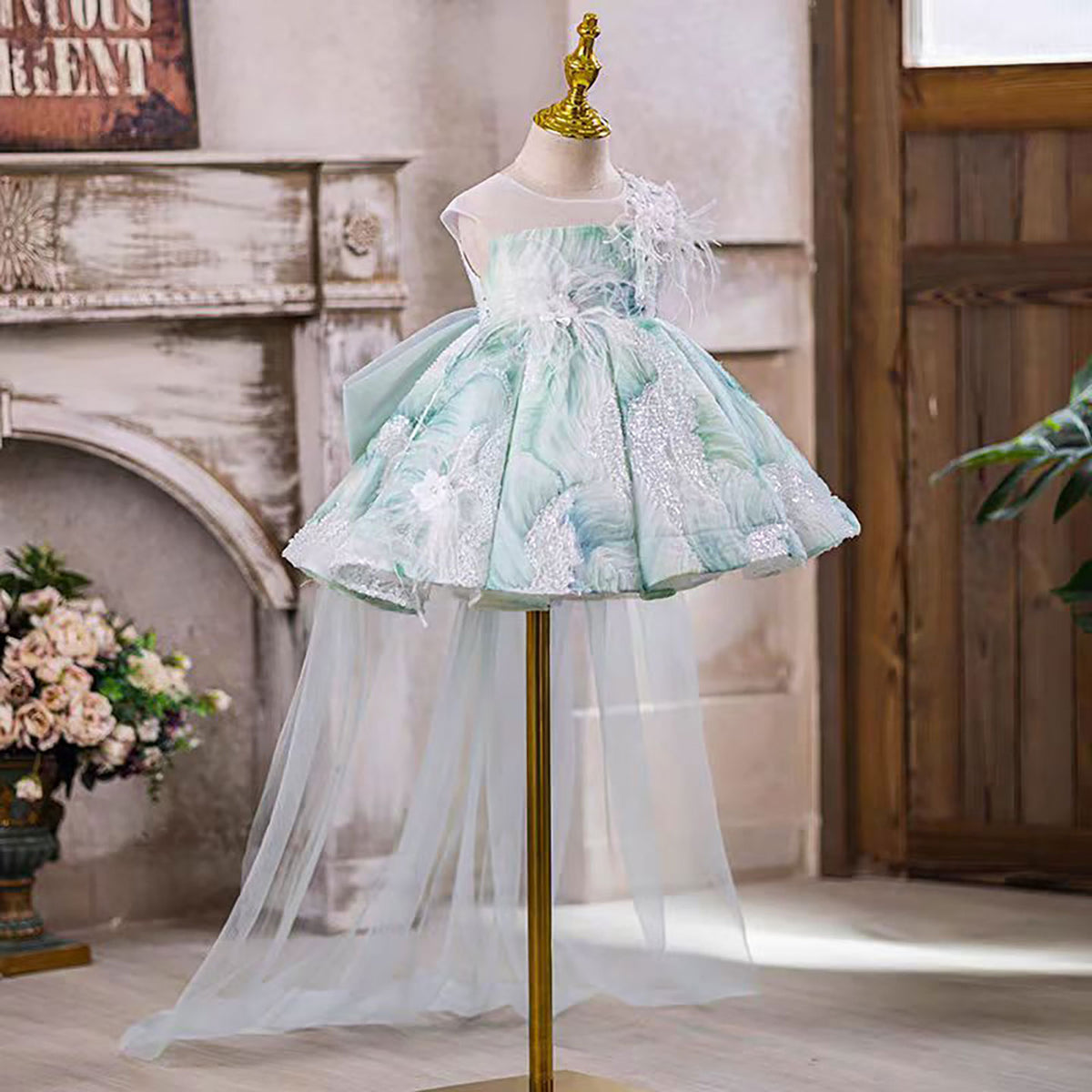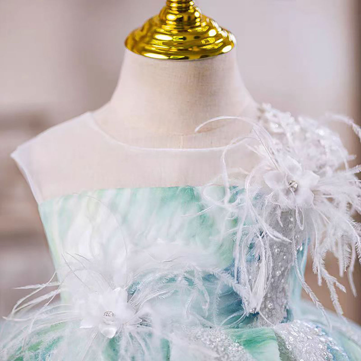Sleeveless Fur Sequined Flower Girl Dress With Trailing Teal J545