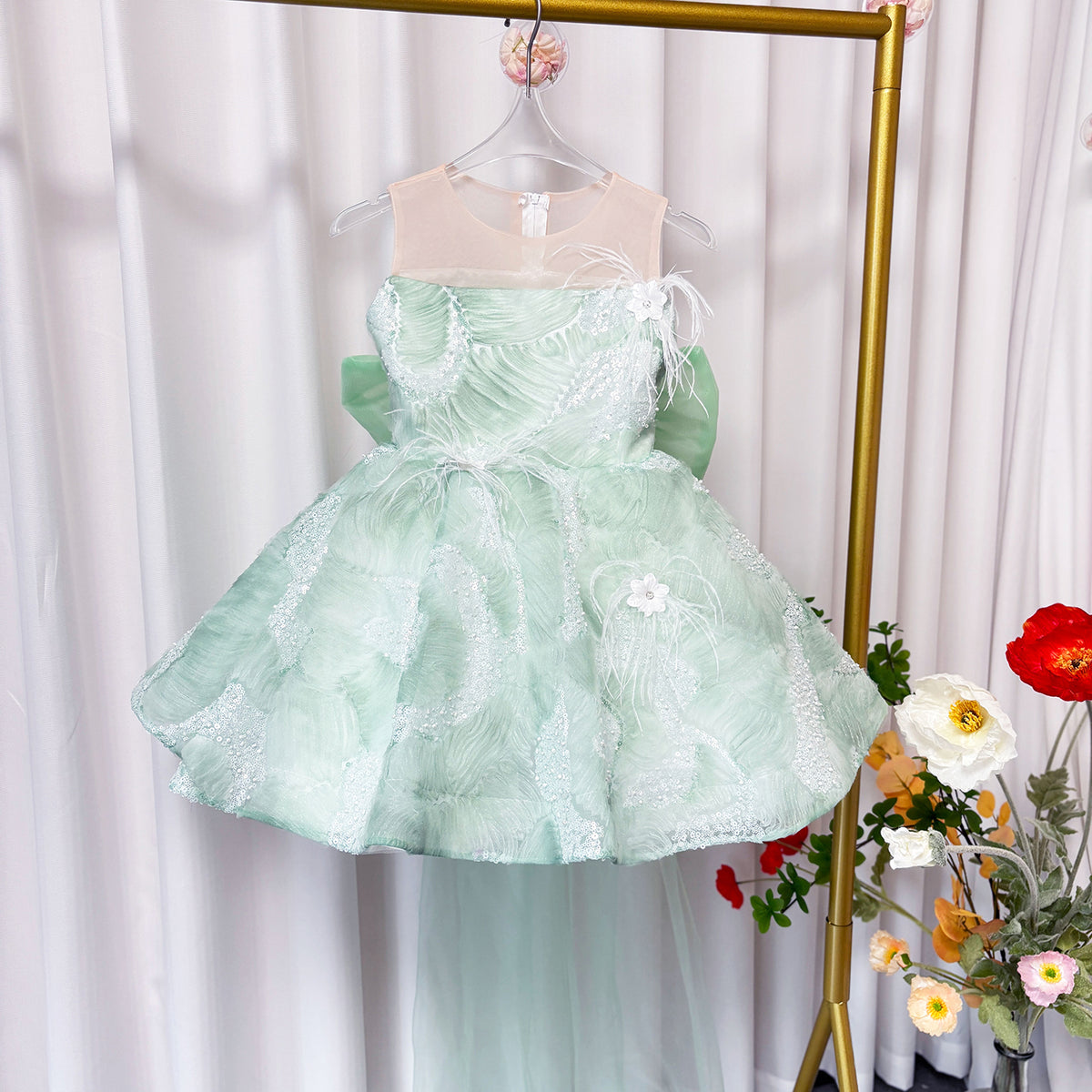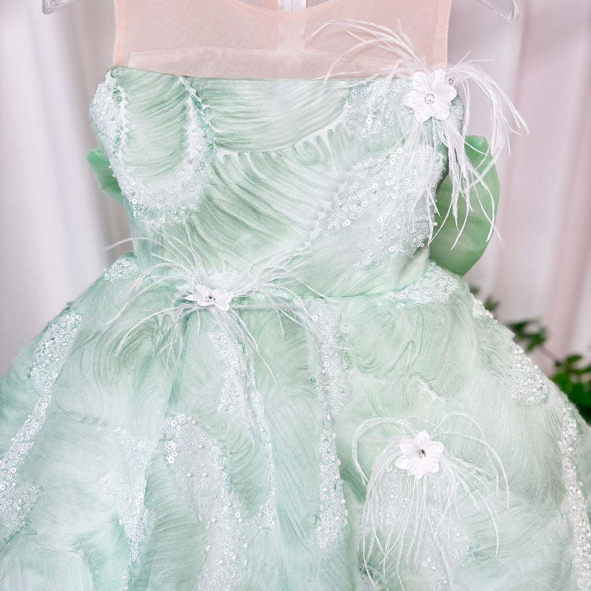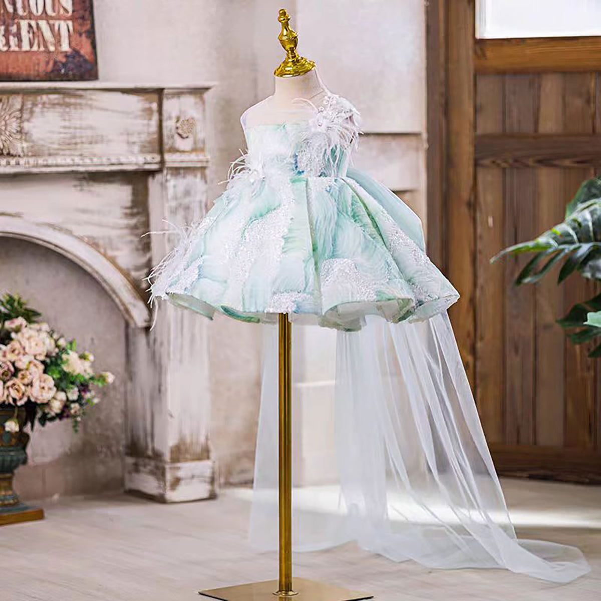Sleeveless Fur Sequined Flower Girl Dress With Trailing Teal J545