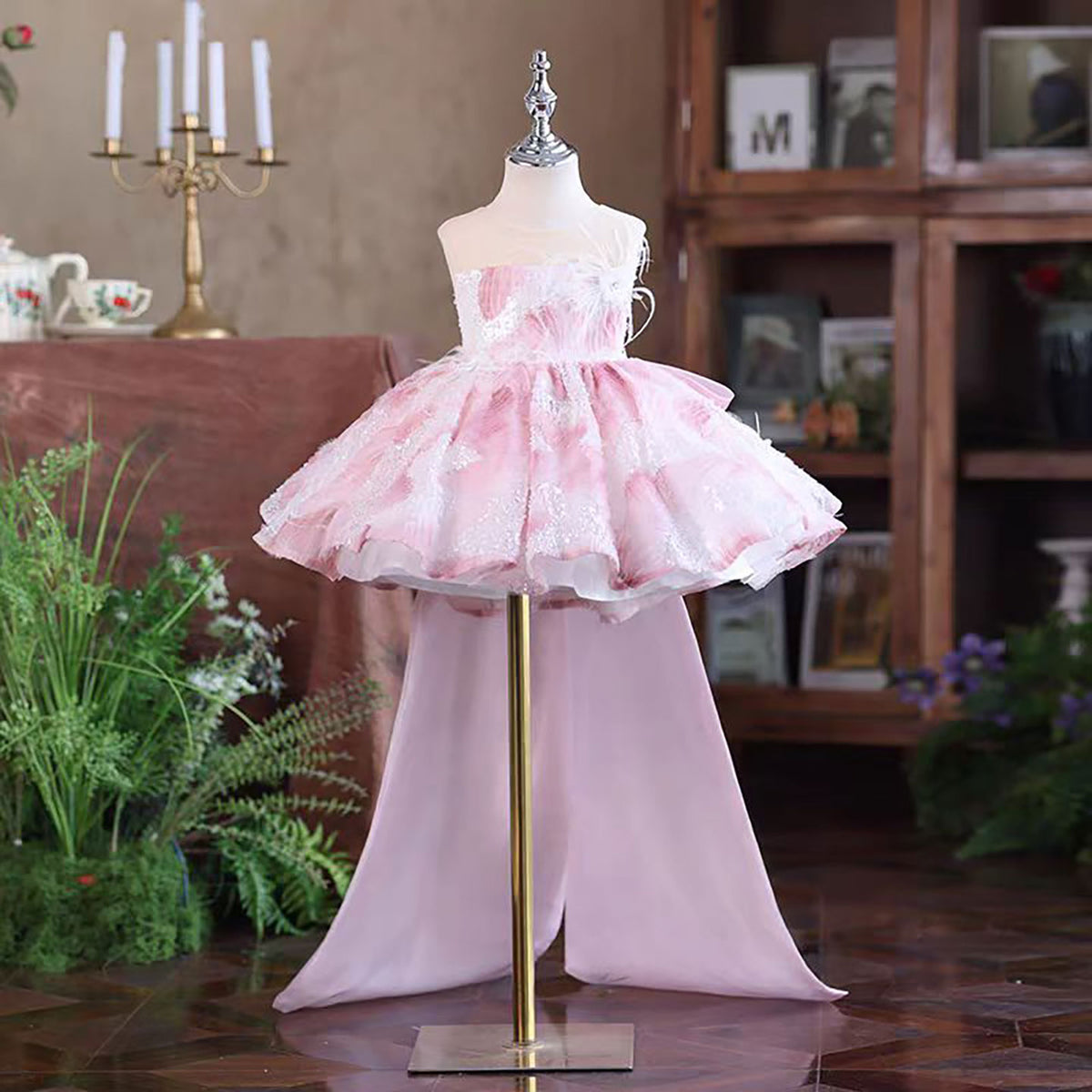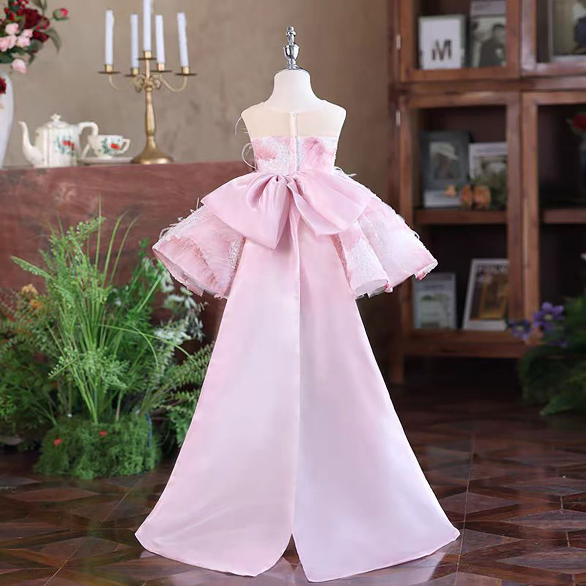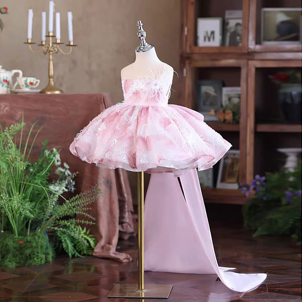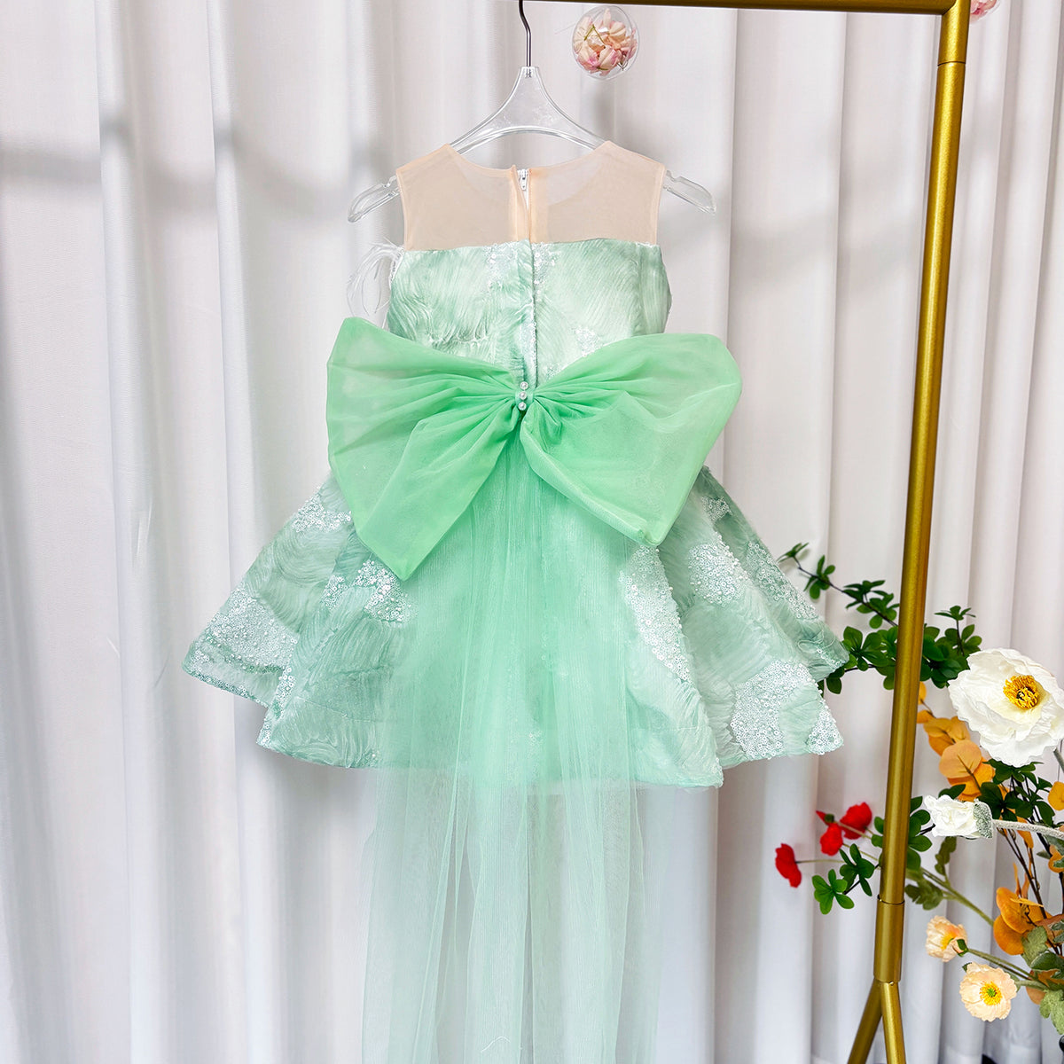 Sleeveless Fur Sequined Flower Girl Dress With Trailing Teal J545