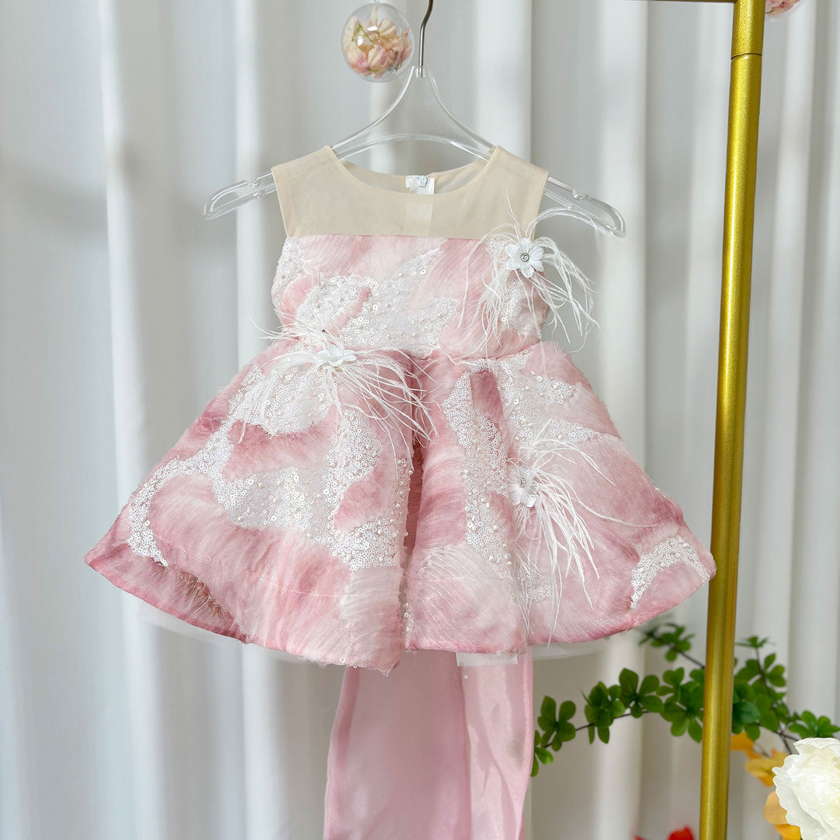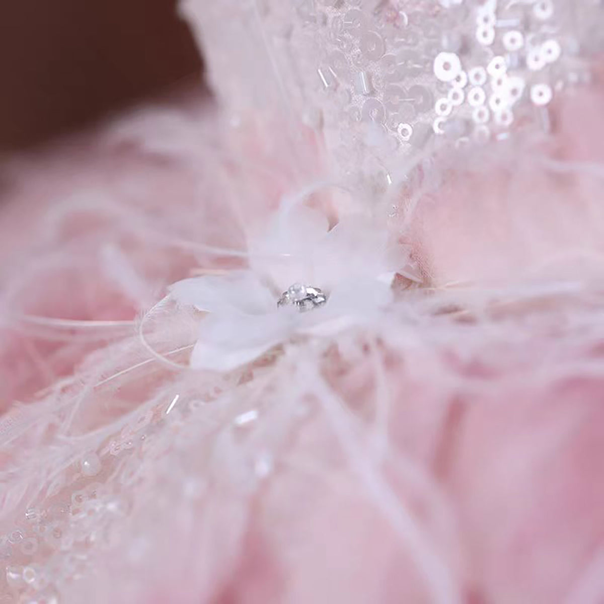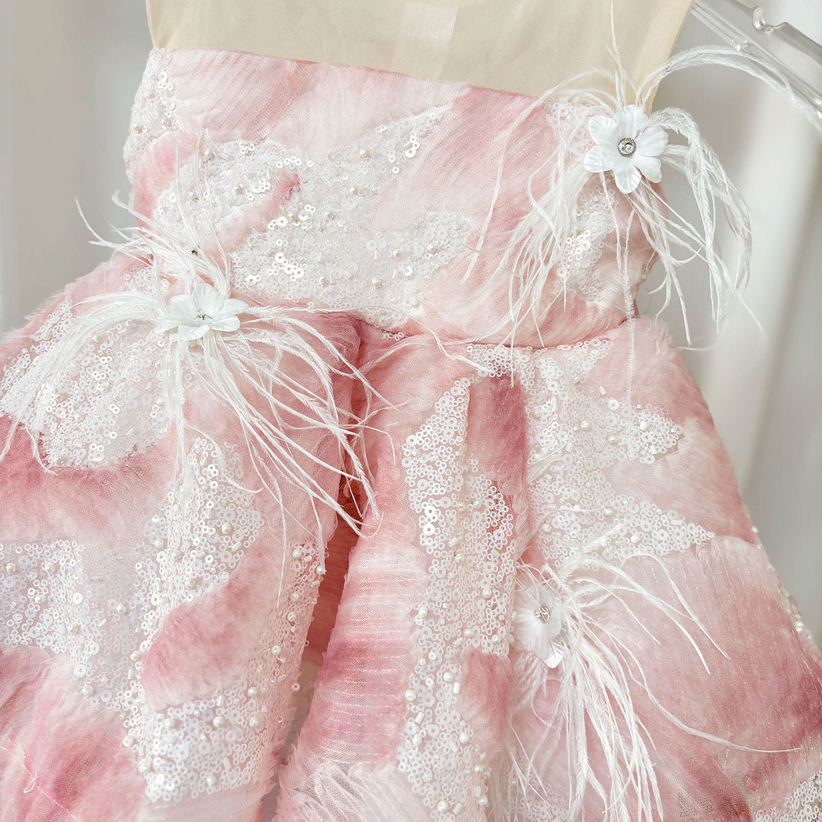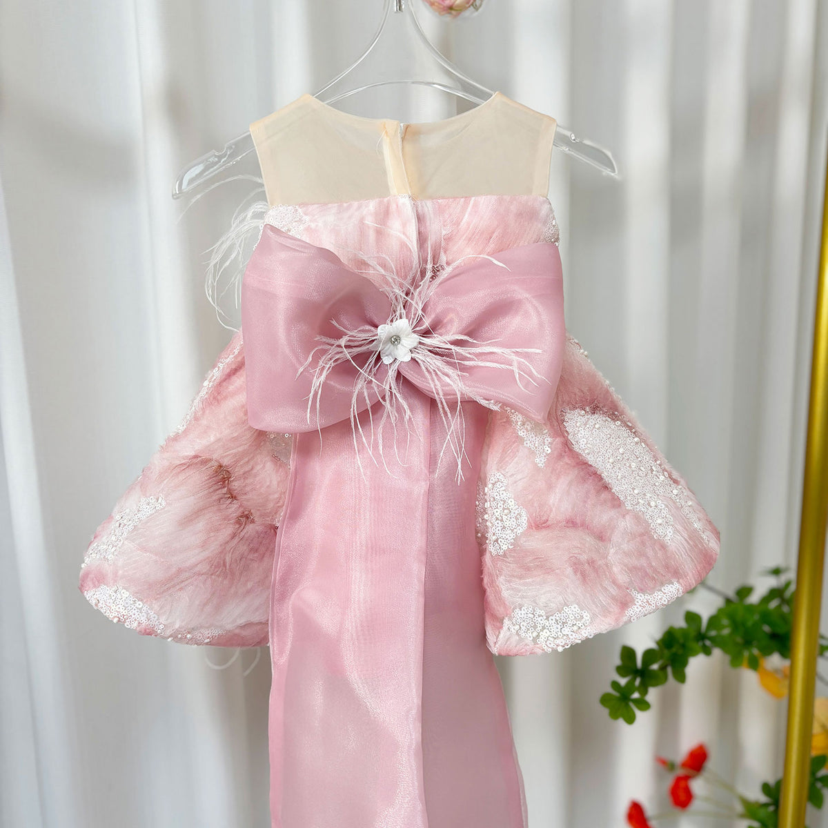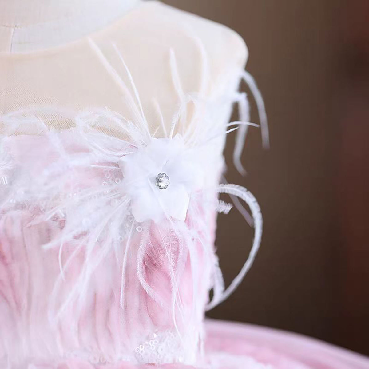 This elegant Jill sleeveless fur sequined flower girl dress is the perfect addition to any wedding party. With its stunning teal color and detailed sequined flower design, your little girl will shine as she walks down the aisle. The flowing tail adds a touch of whimsy, making it a truly magical dress for any special occasion.