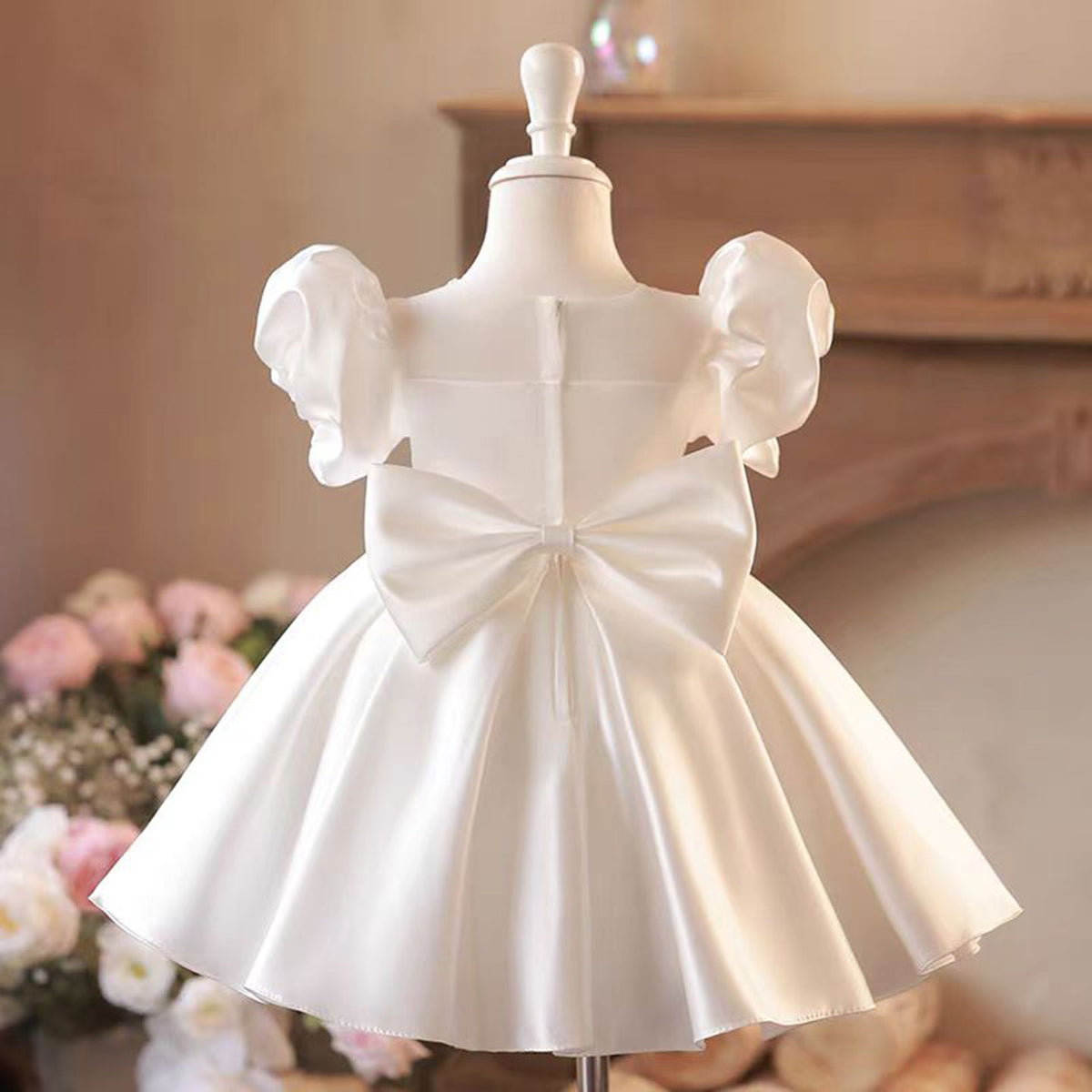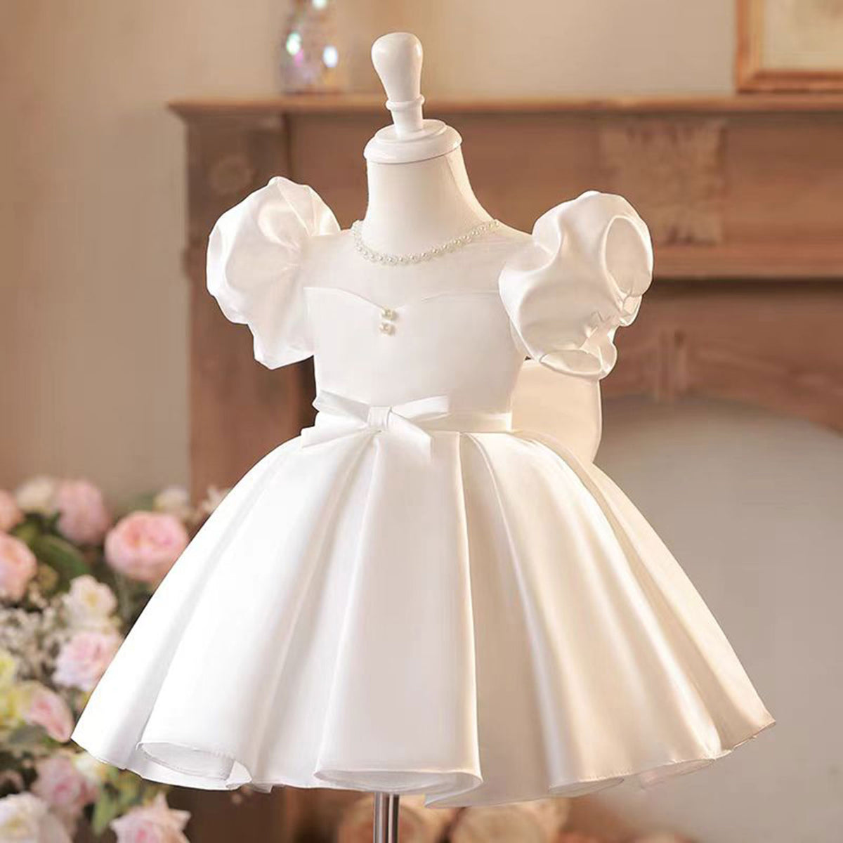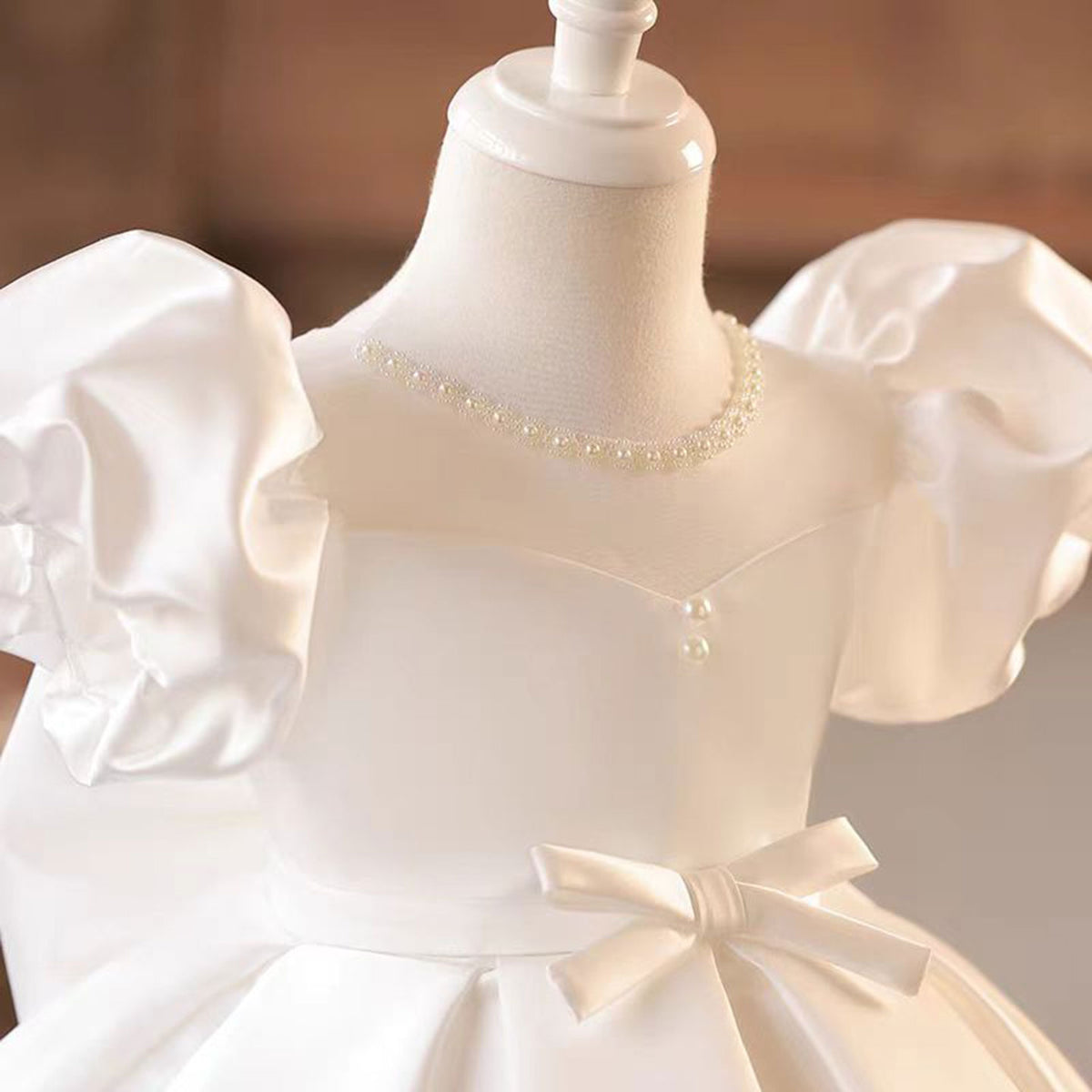 Pearl-decorated Neckline Satin Flower Girl Dress With Bow J791