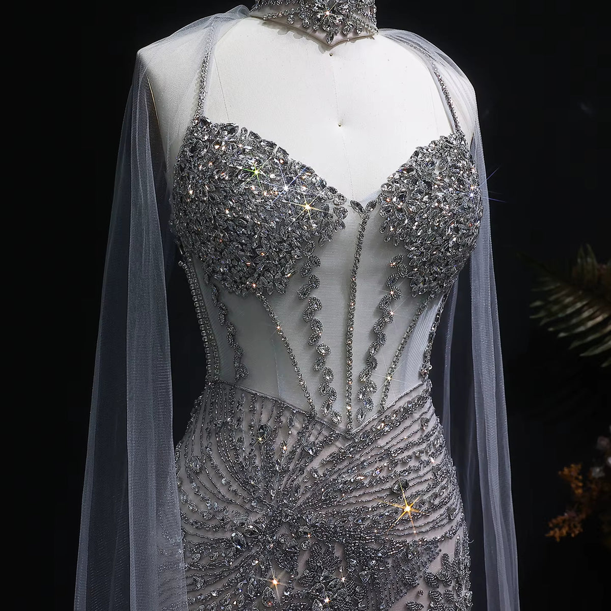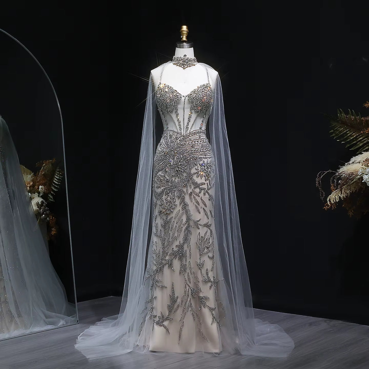 Luxury Champagne Beaded Party Evening Dress with Dramatic Cape SS071