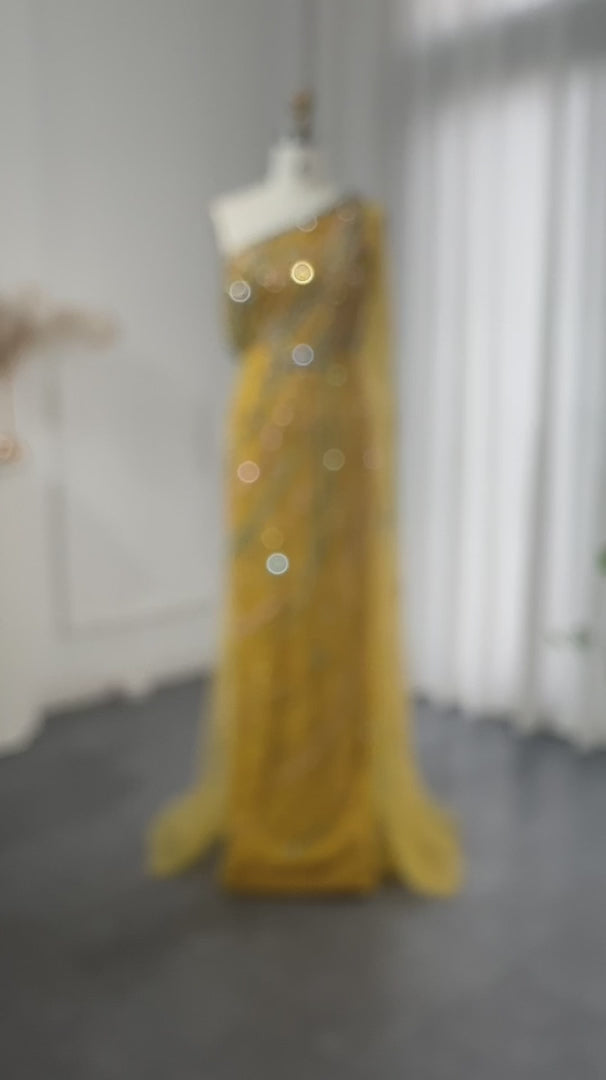 Luxury Yellow Beaded One Shoulder Yellow Evening Dress with Cape SS423