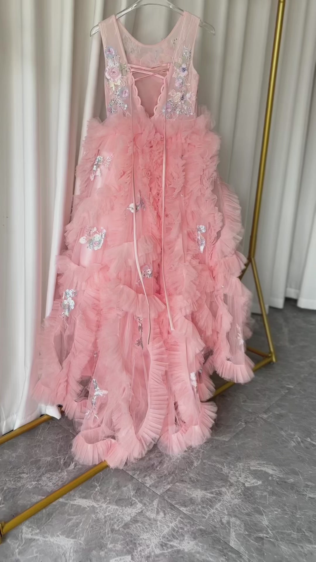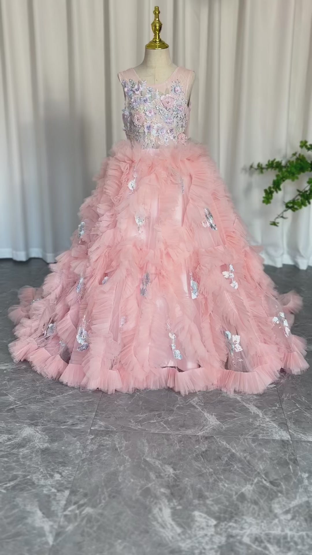 Indulge your little girl's royalty with our Dreamy Vow Pink Luxury Dubai Kids Girl Dress. This stunning ball gown features intricate Arabic appliques and tiered layers, perfect for weddings, parties, birthdays, or pageants. Give her the spotlight she deserves with this princess-worthy dress.