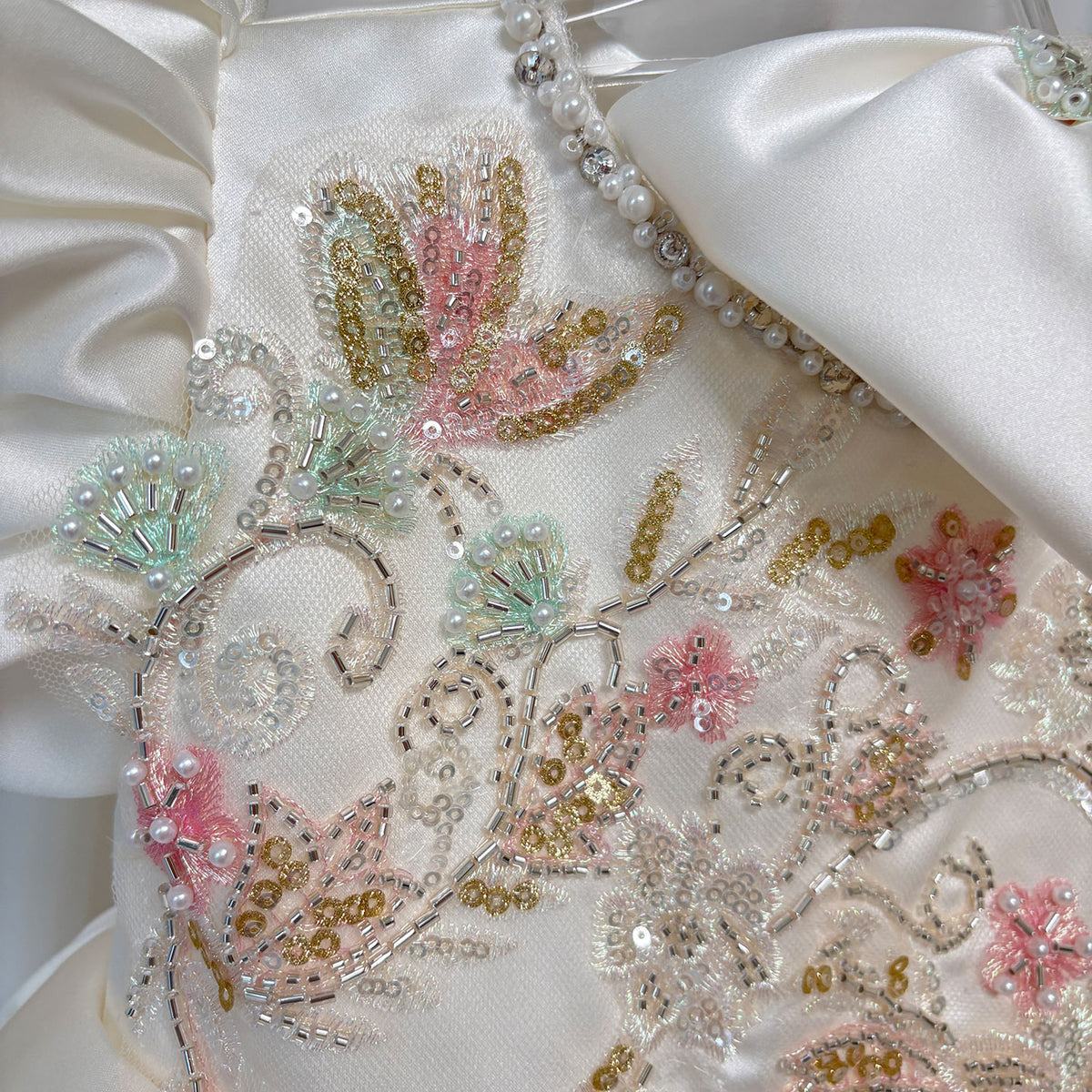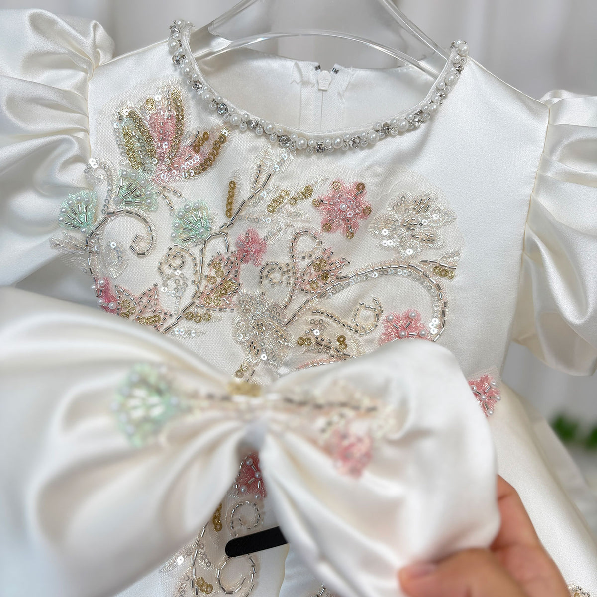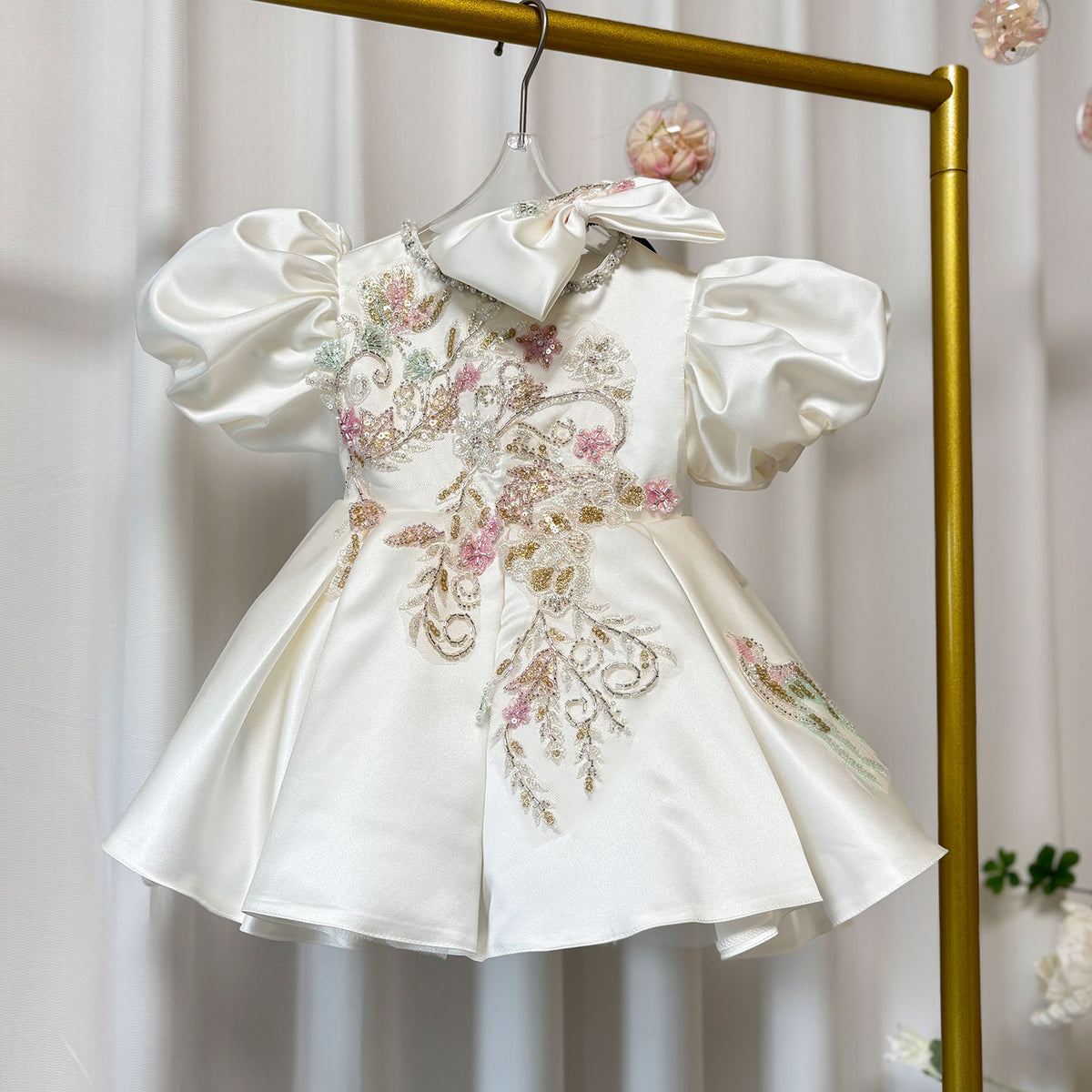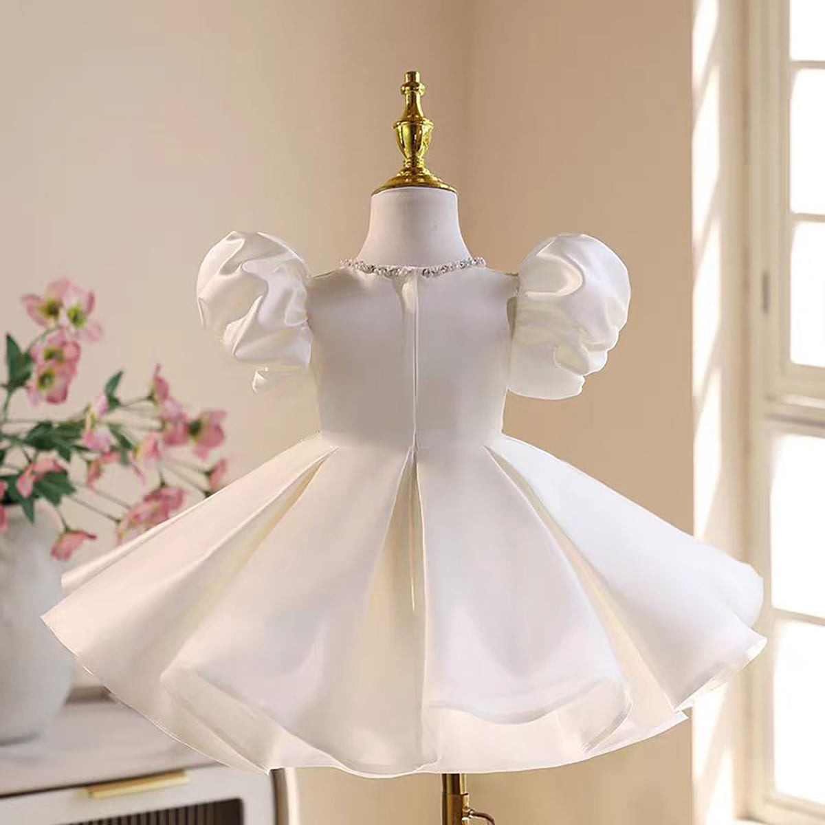Luxury O-Neck Pearled Short Sleeve Satin Girl Dress White J543