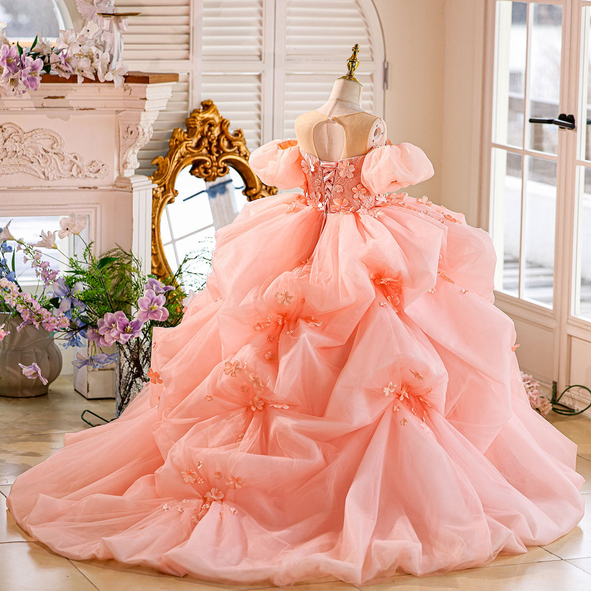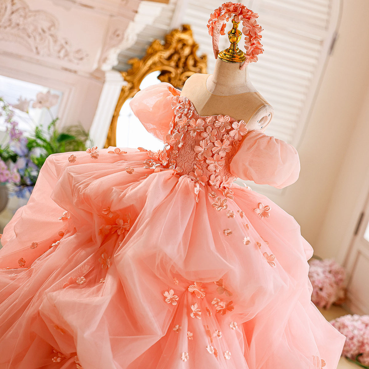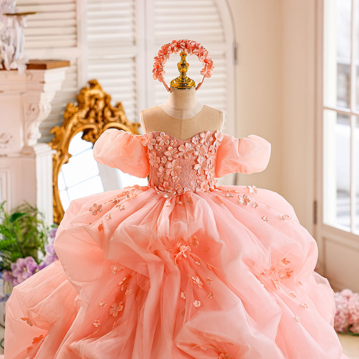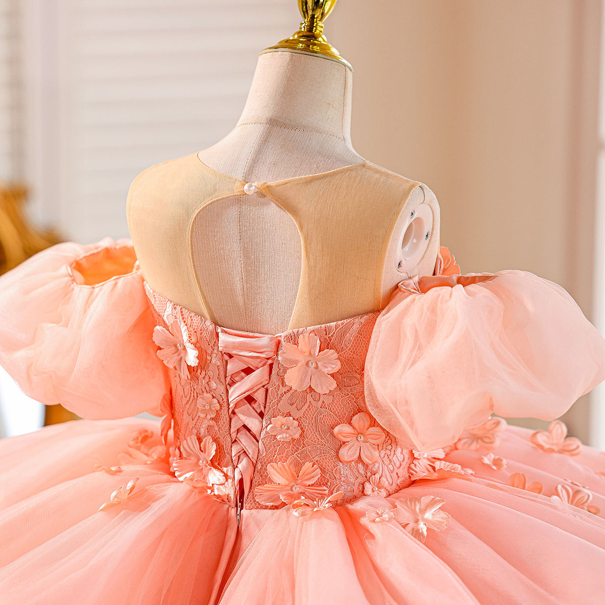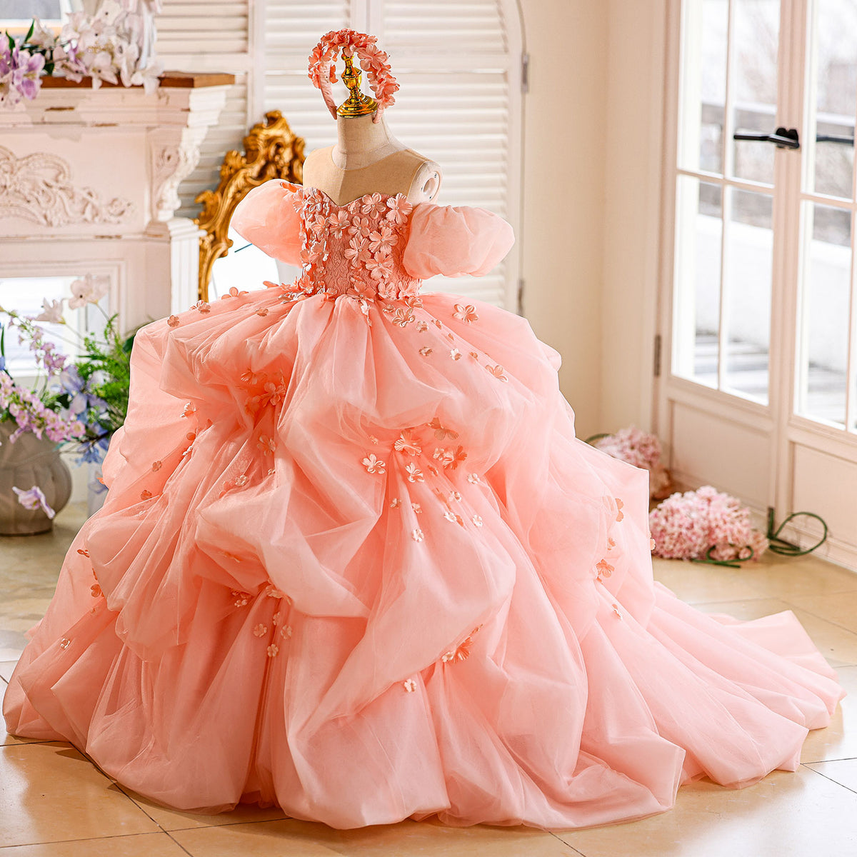 Luxury Pleat Off Shoulder Applique Pink Girl Princess Dress J855