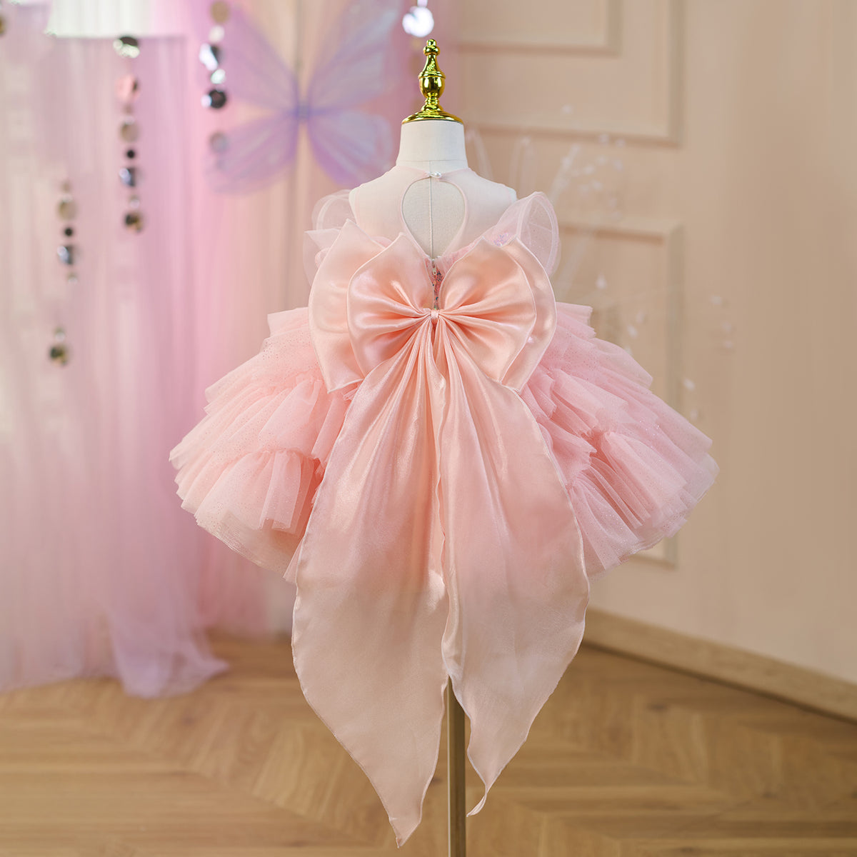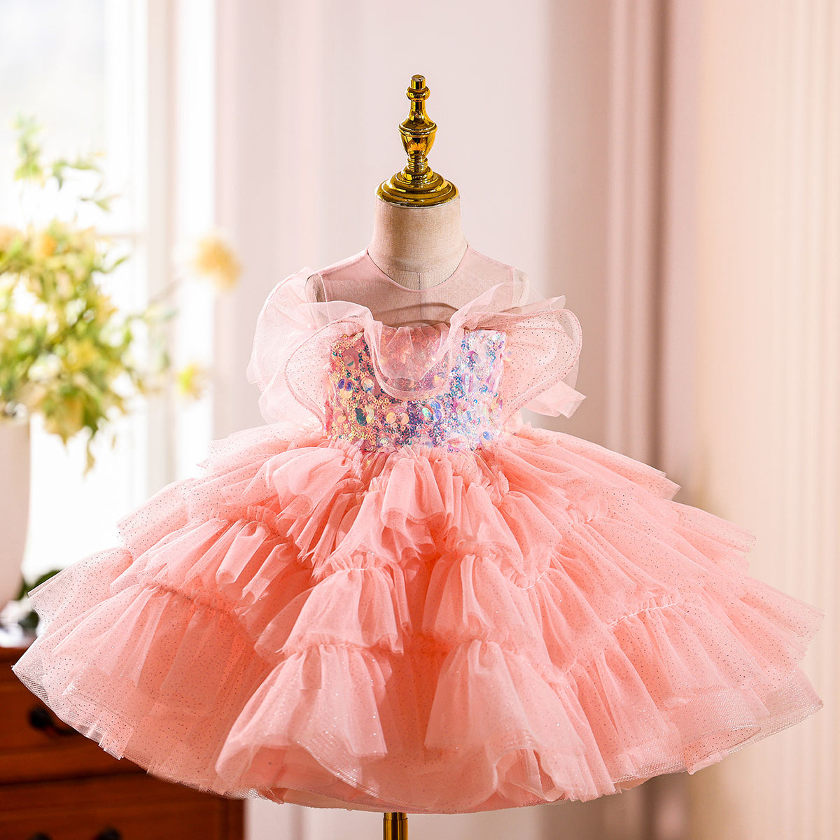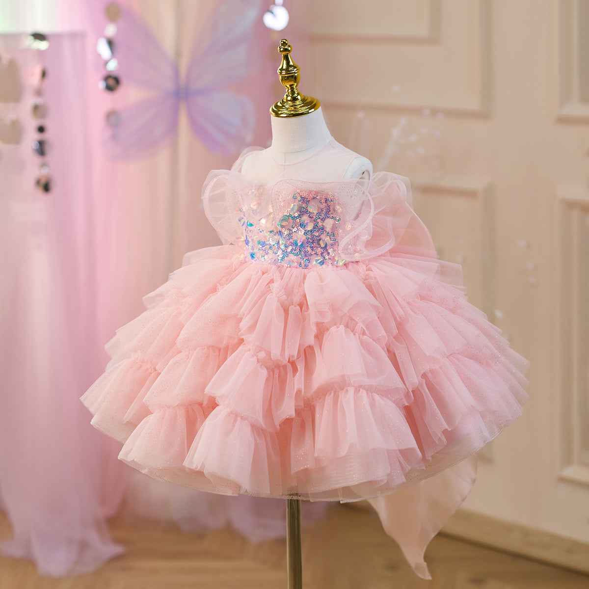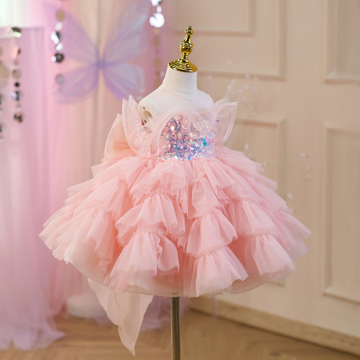O-Neck Sequined Tulle Pink Flower Girl Dress With Bow J824