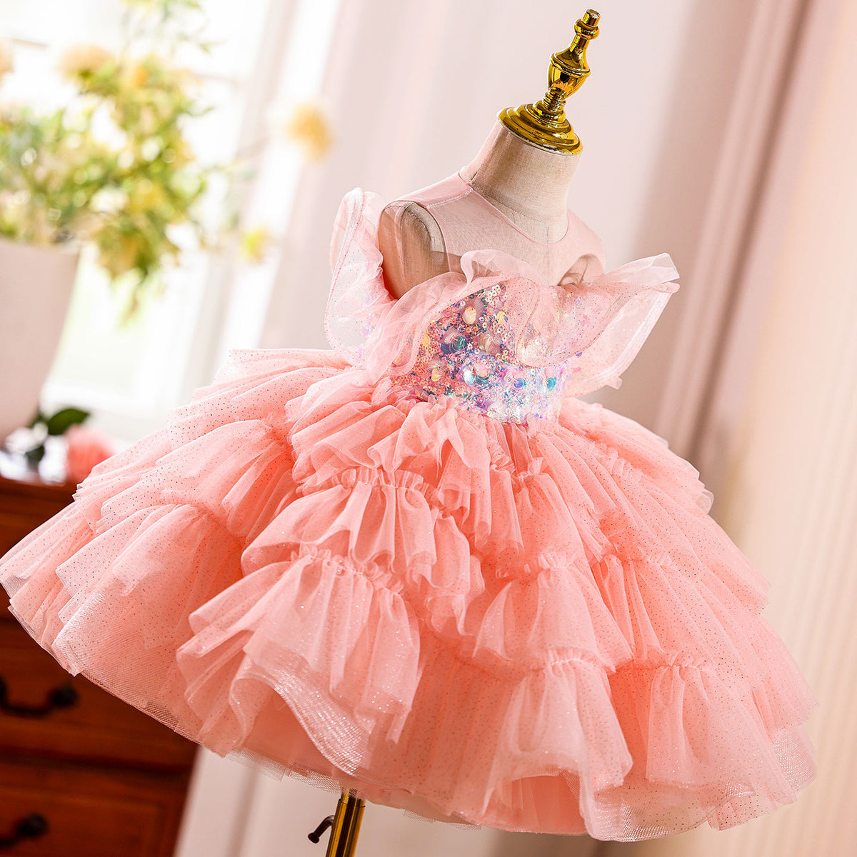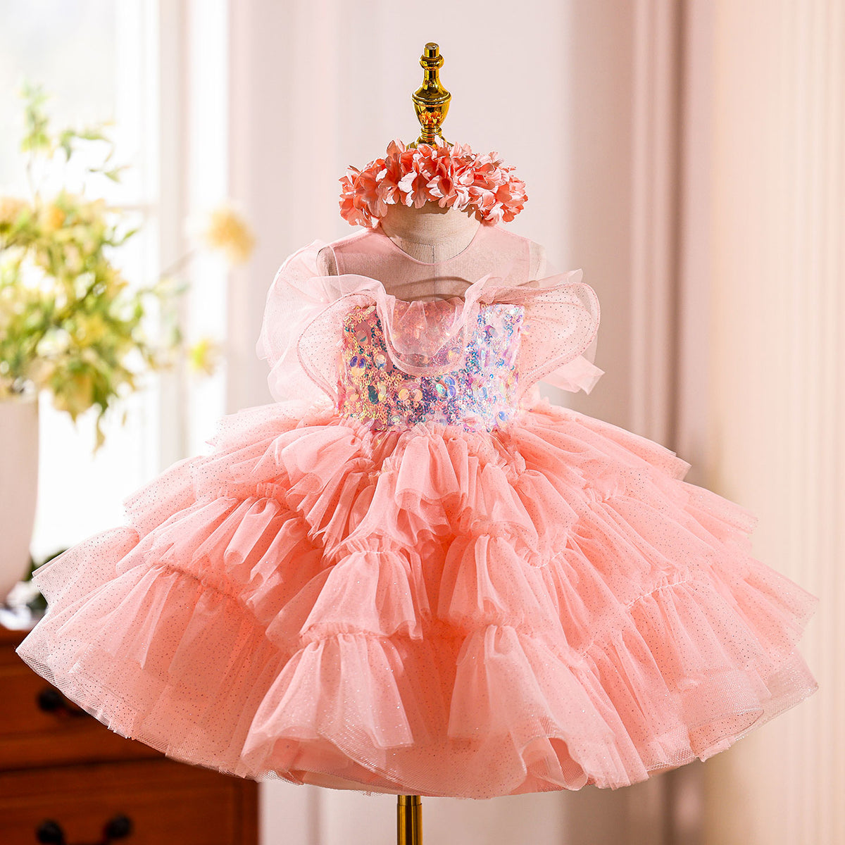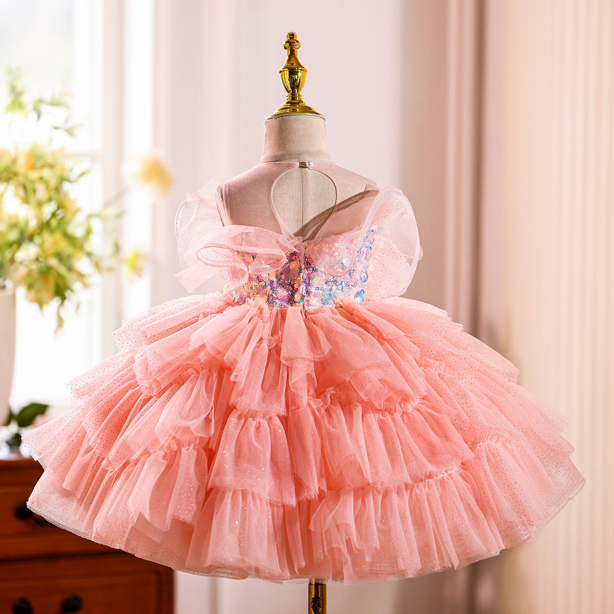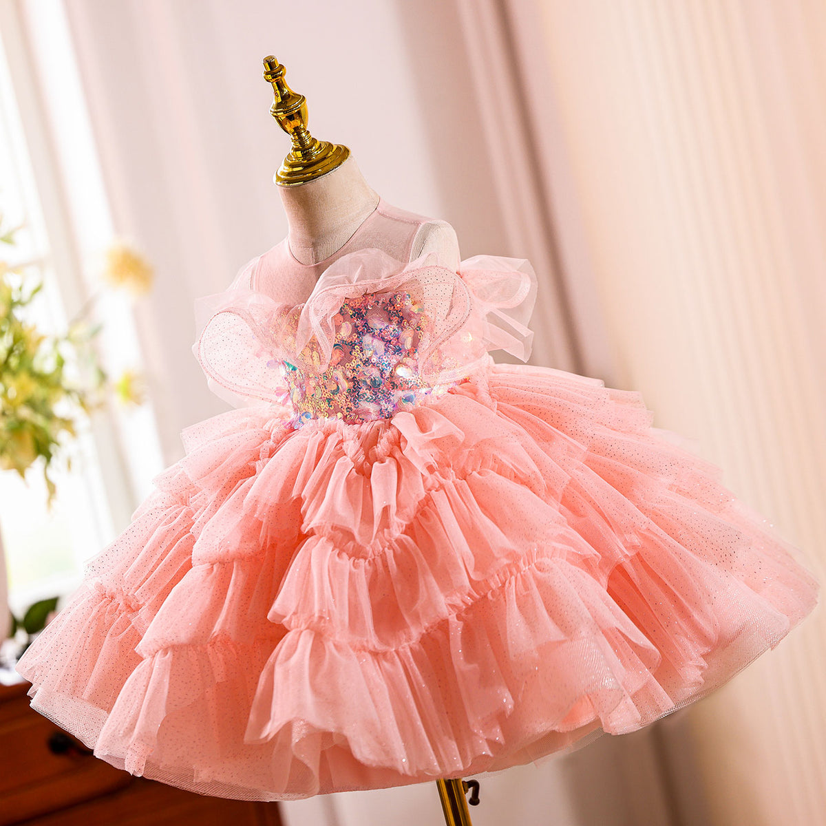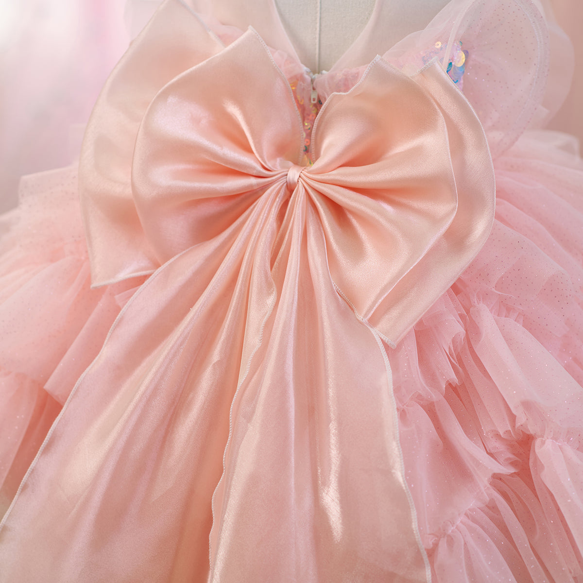O-Neck Sequined Tulle Pink Flower Girl Dress With Bow J824