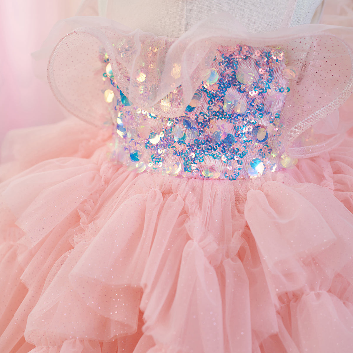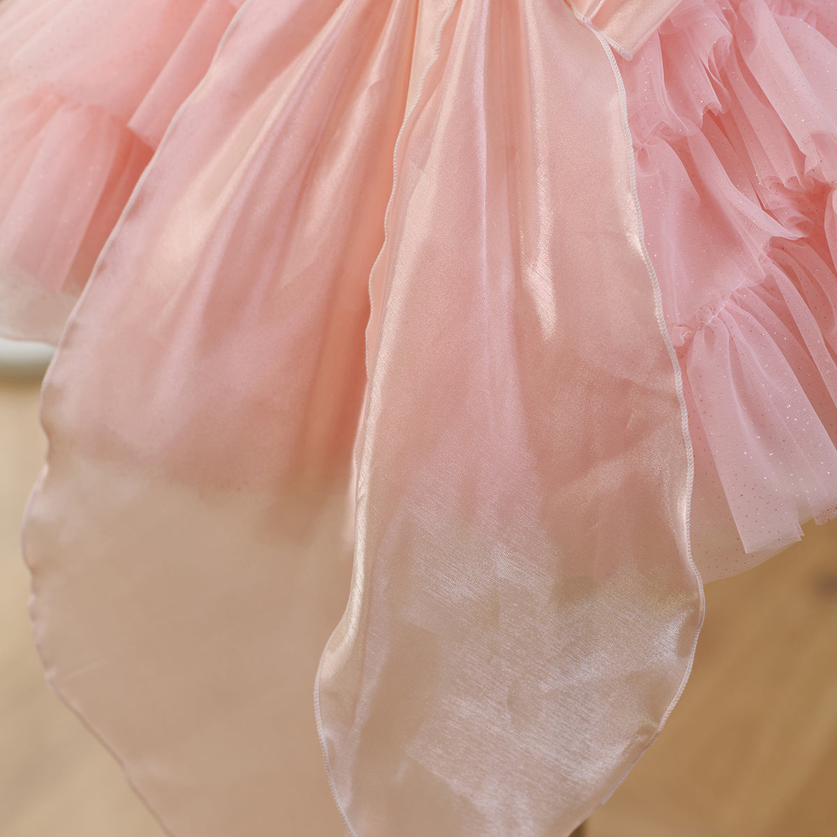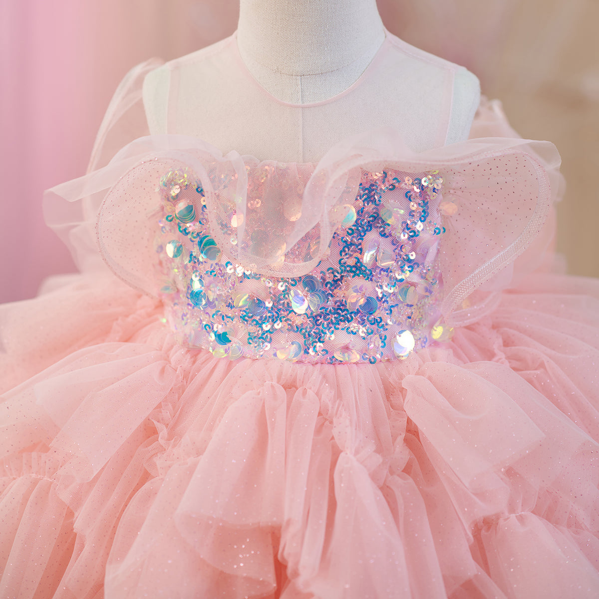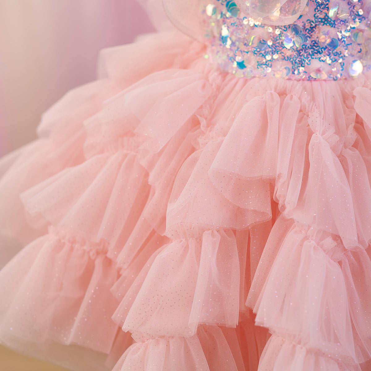 Expertly crafted with delicate sequined tulle, the Jill O-Neck Pink Flower Girl Dress adds a touch of elegance to any occasion. The bow detail not only adds a charming finish, but also provides a secure fit for your little one. Perfect for weddings, parties, and special events.