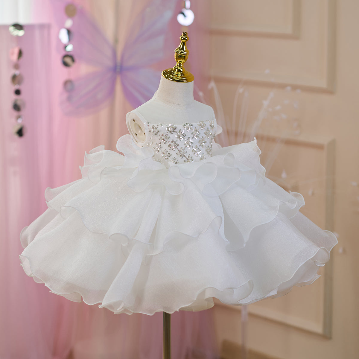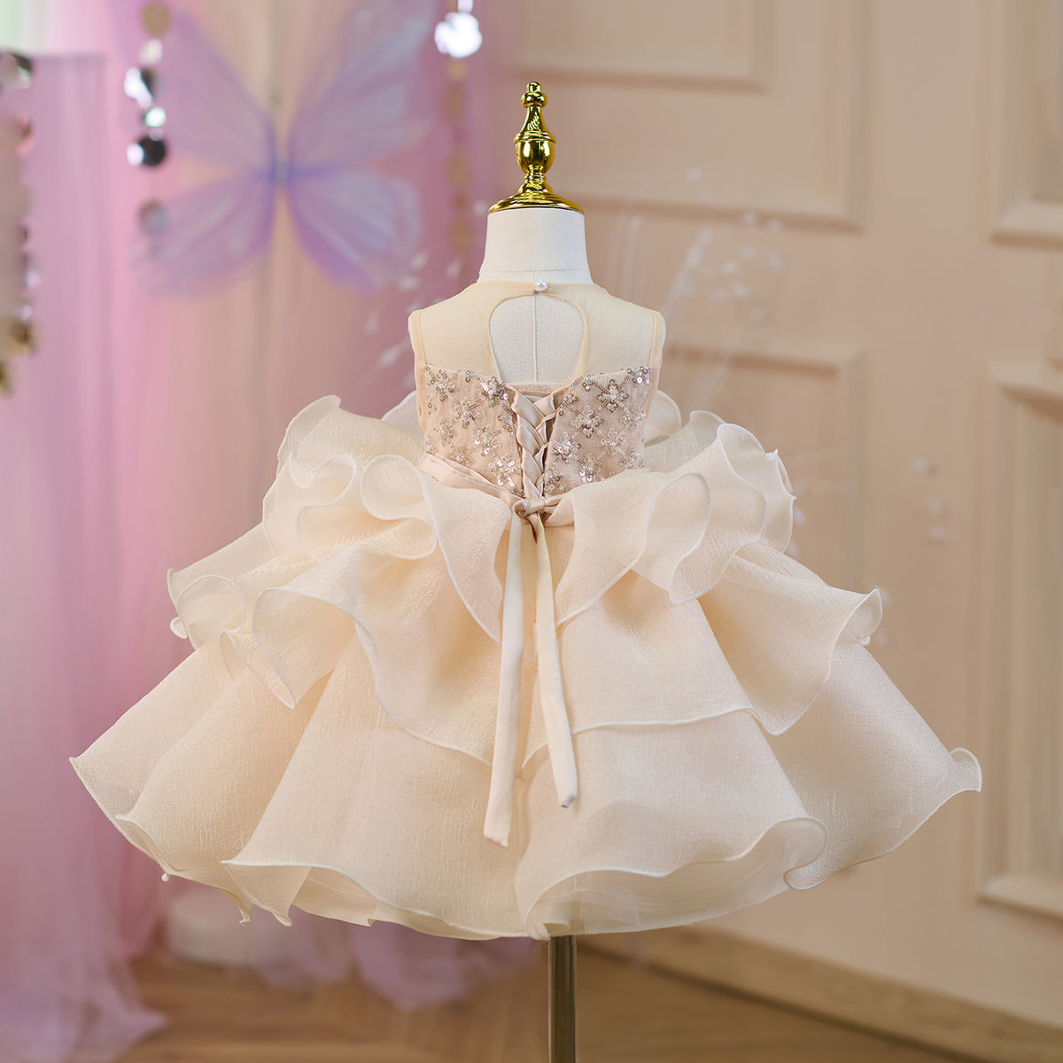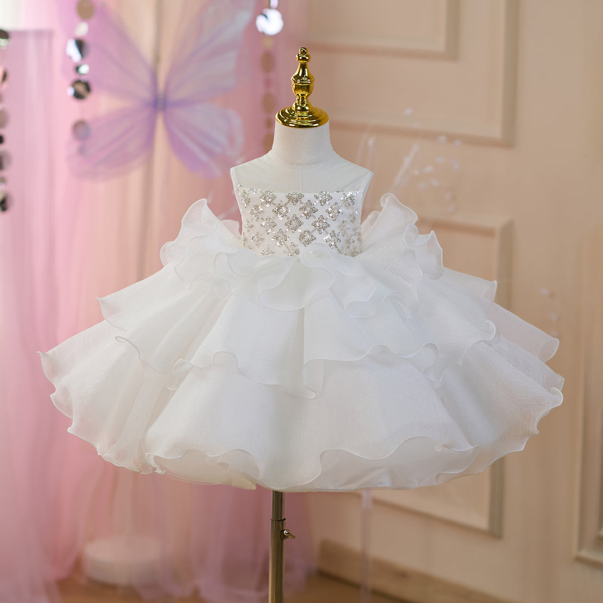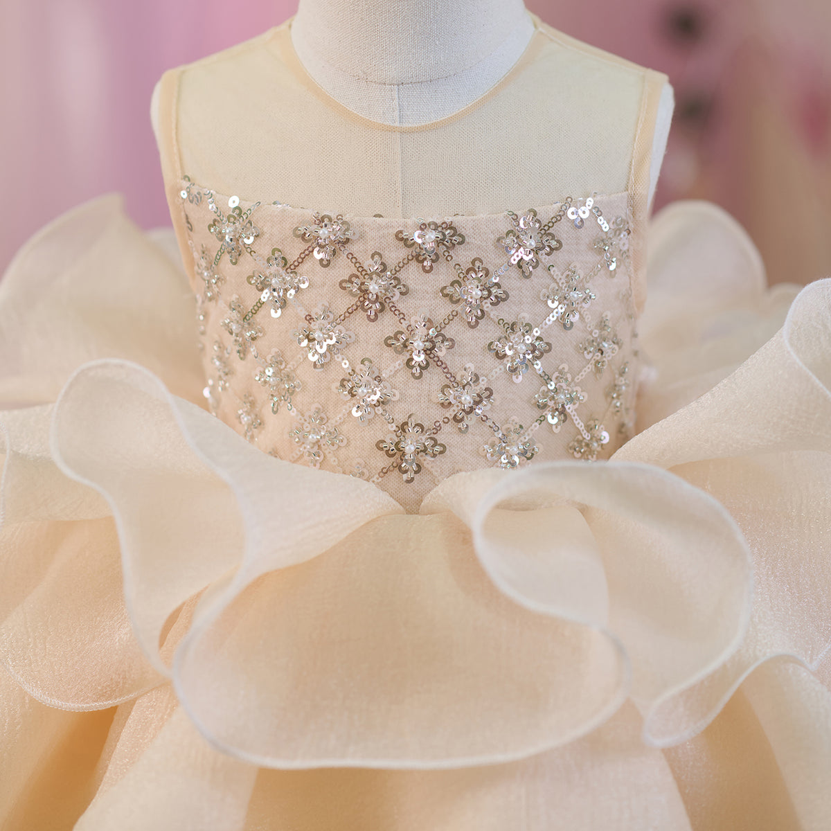 Sequined Tiered Tulle Girl Dress Bow Sleeveless J821
