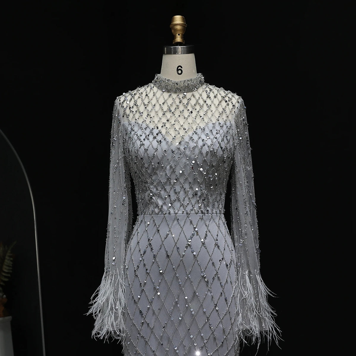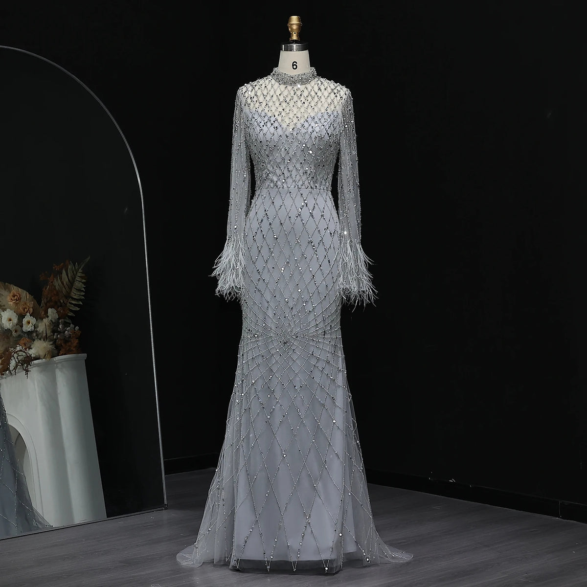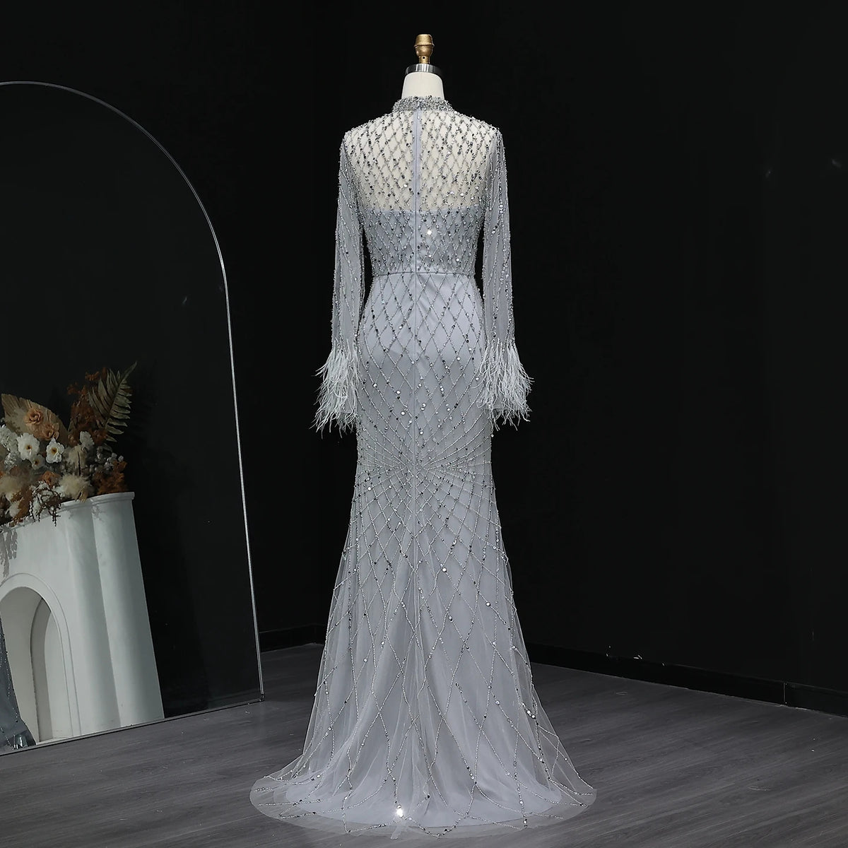 This elegant evening dress features intricate beaded and feather details, adding a touch of luxury to your look. The sage green color and long sleeves provide a classic and sophisticated style. Perfect for formal events, this dress is sure to make a statement and turn heads.