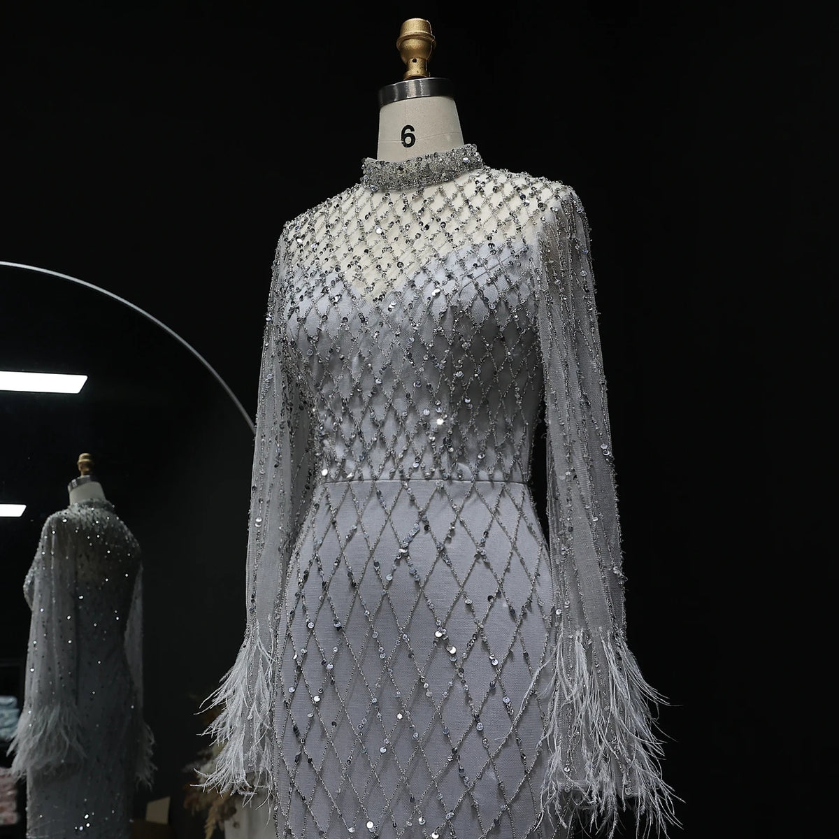 Luxury Beaded Feathers Sage Green Evening Dress Long Sleeves SS144