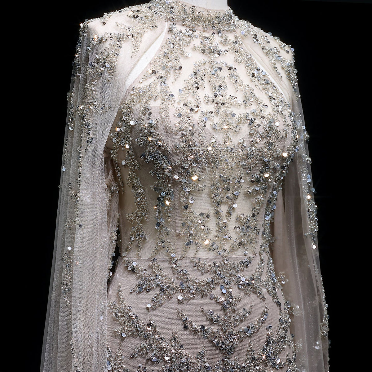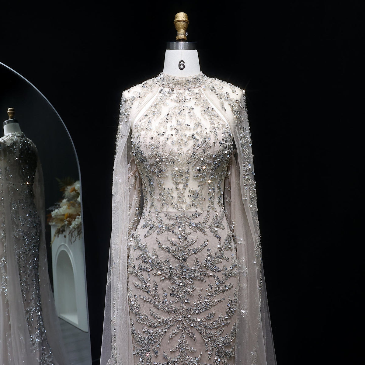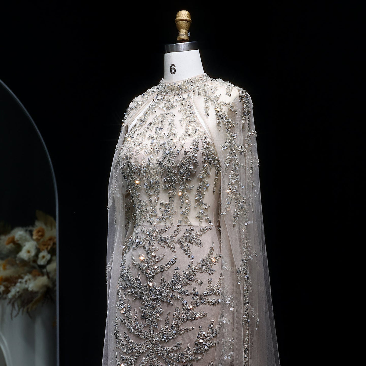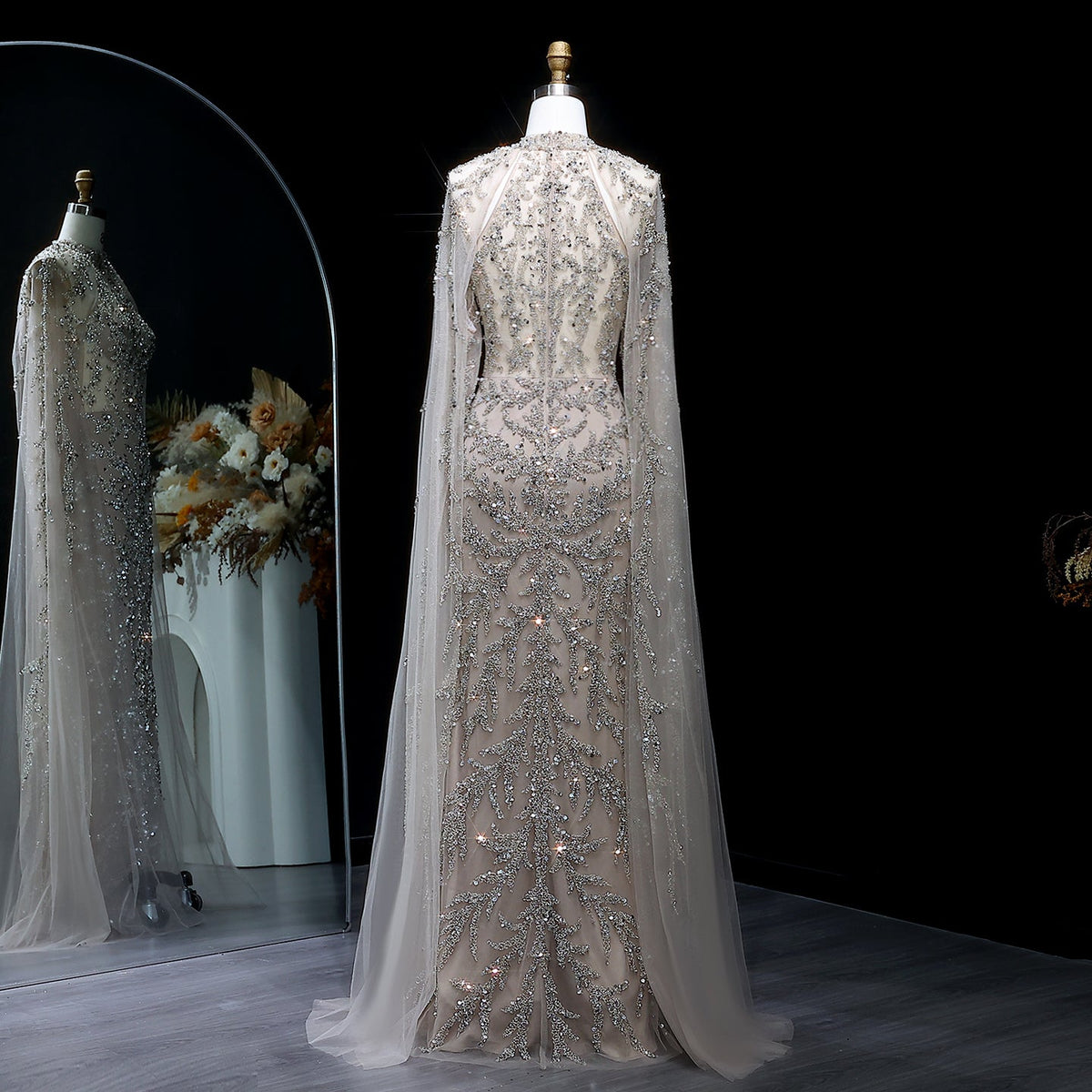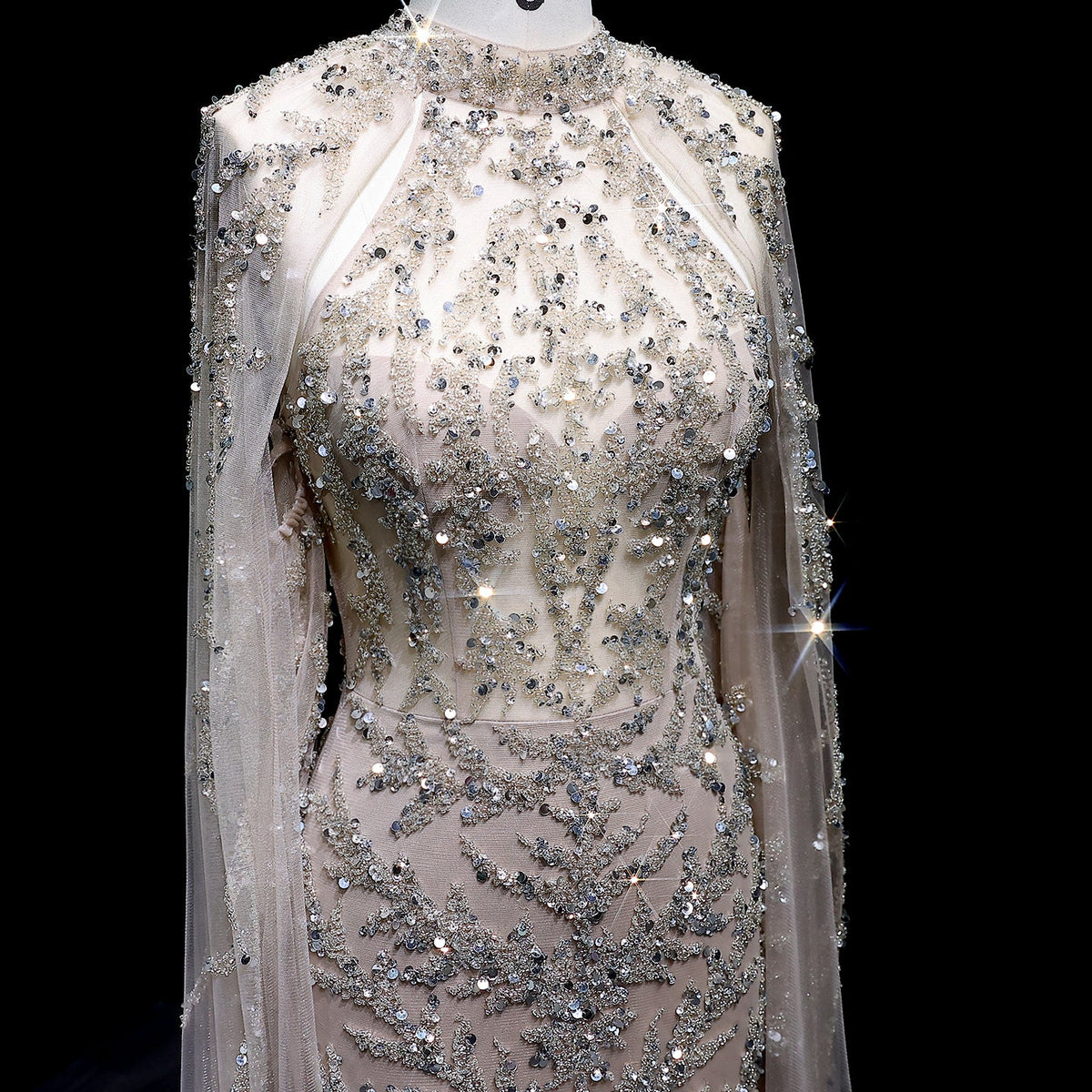 Elevate your evening wardrobe with this Luxury Beaded Turquoise Evening Dress featuring elegant cape sleeves. Expertly crafted, the dress showcases intricate beadwork that adds a refined shimmer, while the cape sleeves provide a graceful silhouette. Perfect for formal occasions, this dress combines sophisticated design with a striking turquoise hue to ensure you stand out with timeless elegance.