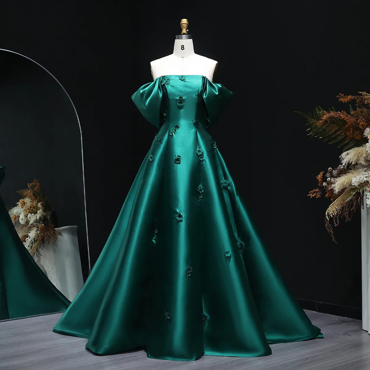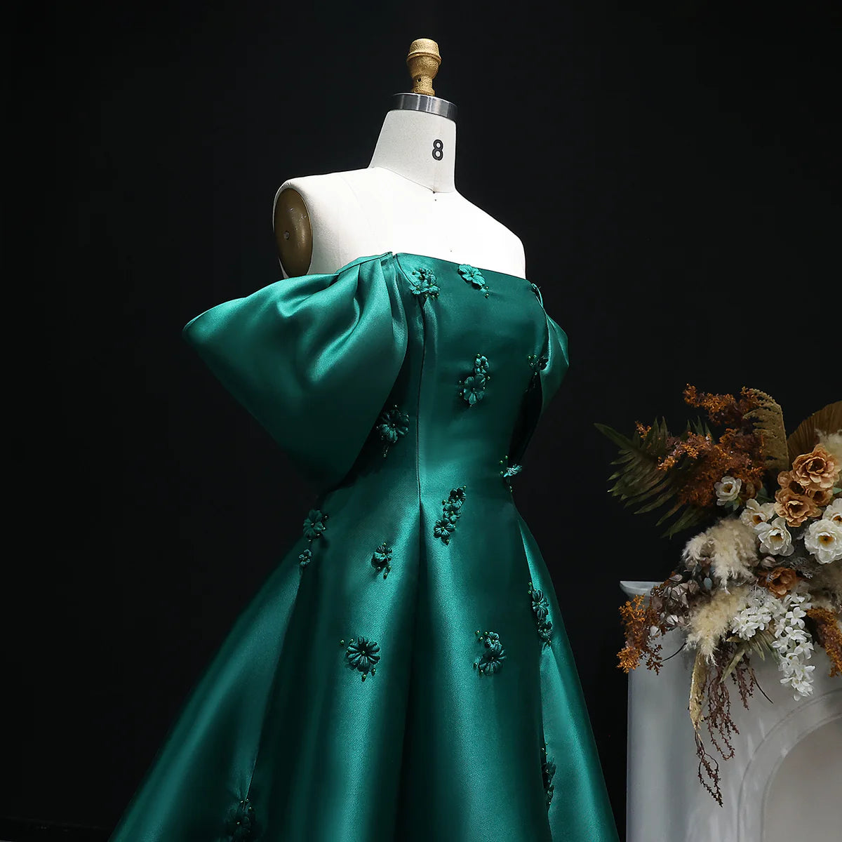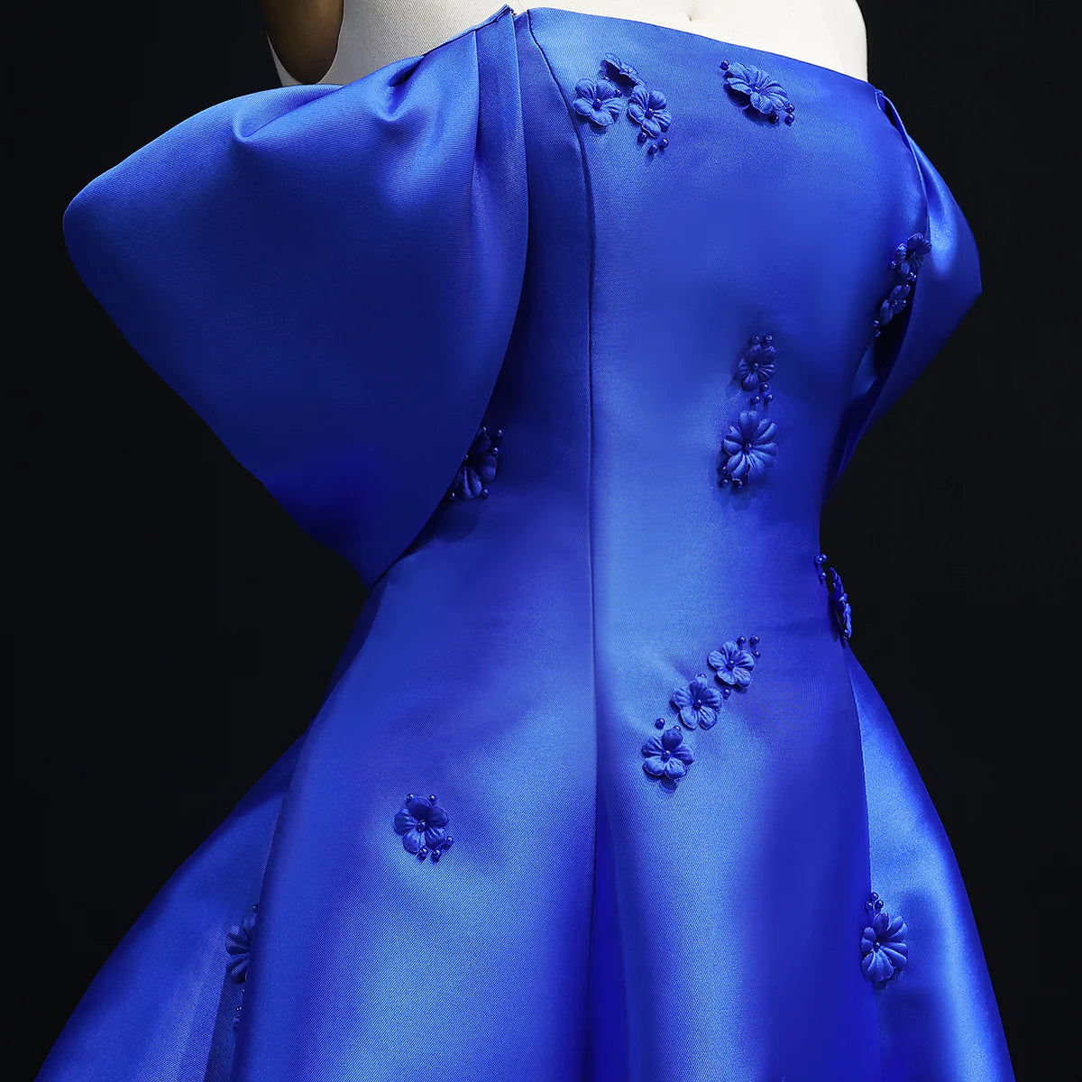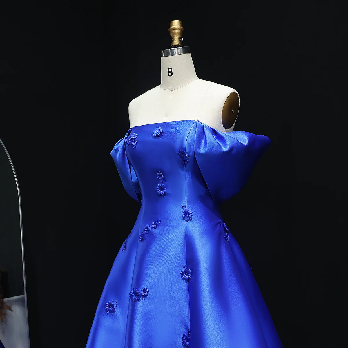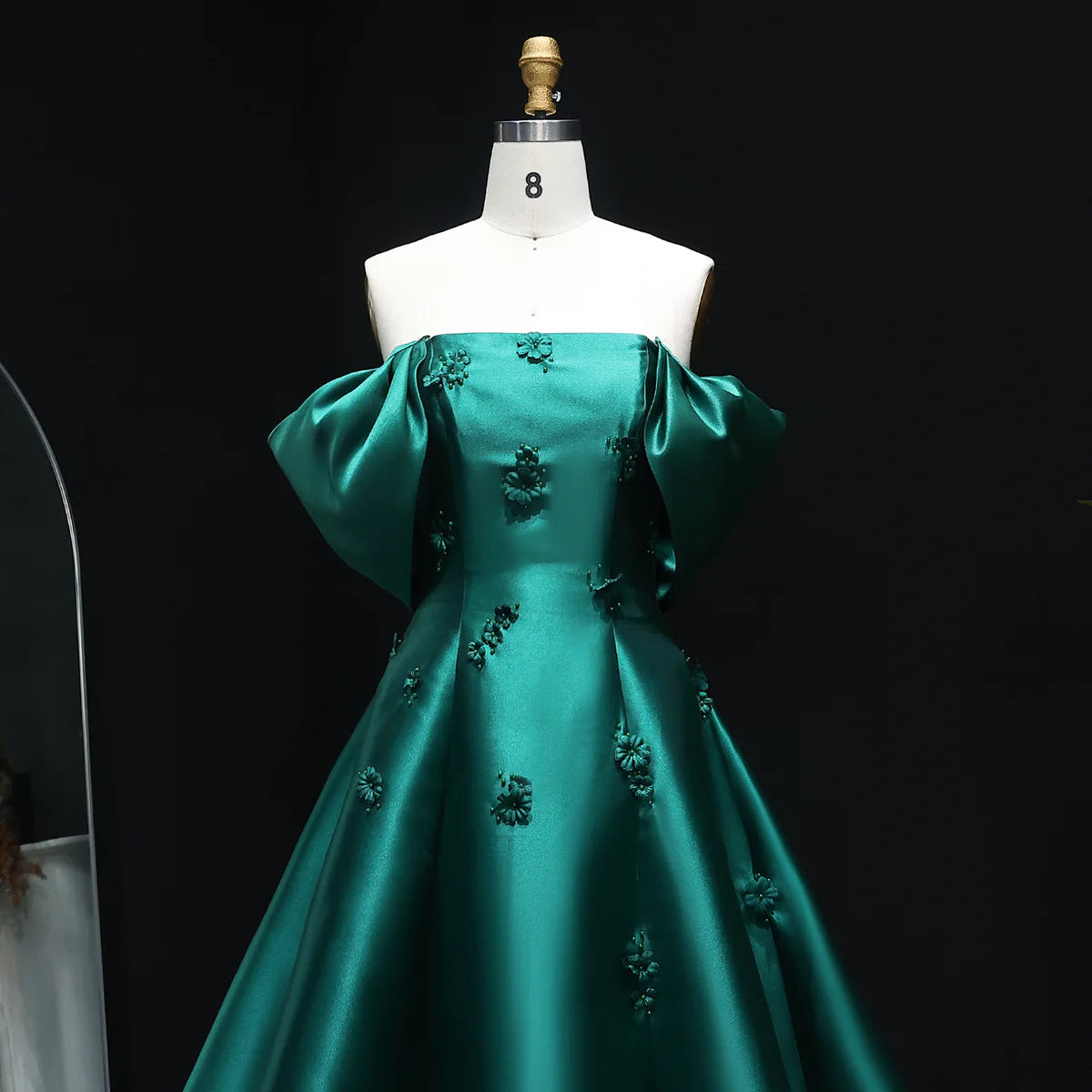 This elegant evening dress features intricate 3D flowers and a flattering off-shoulder neckline. Perfect for formal events and special occasions, it exudes a dreamy and sophisticated aura. The vibrant red color adds a touch of romance and glamour.