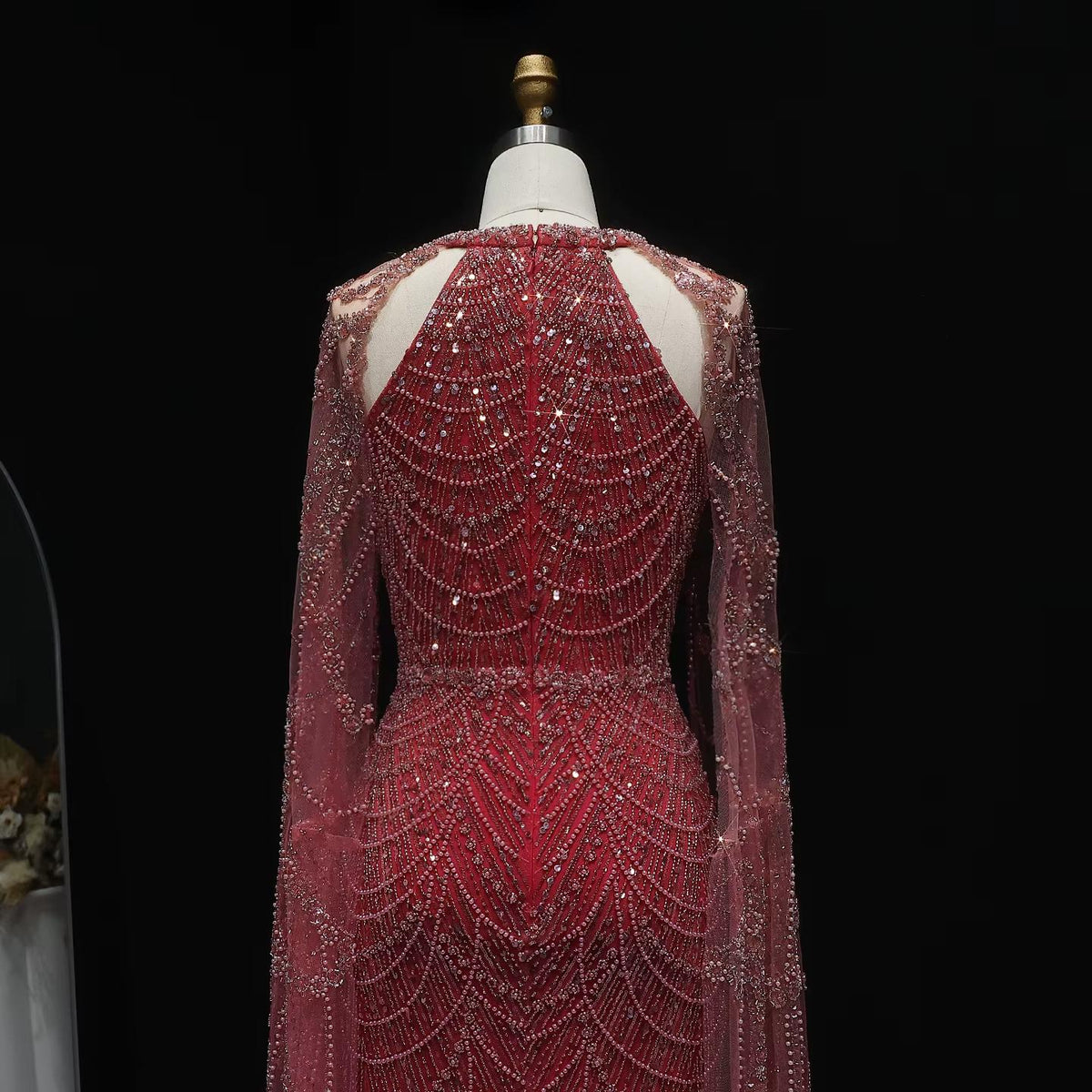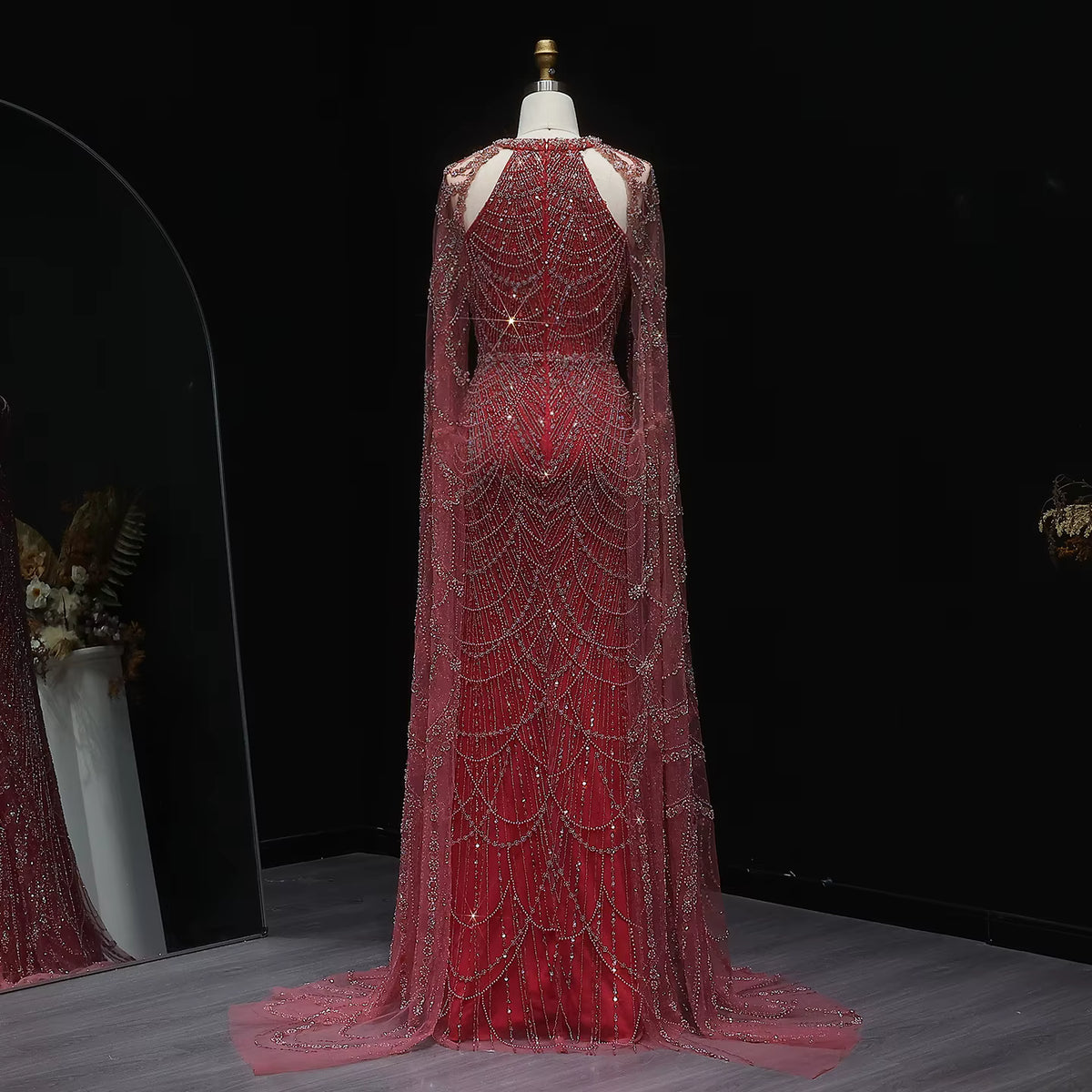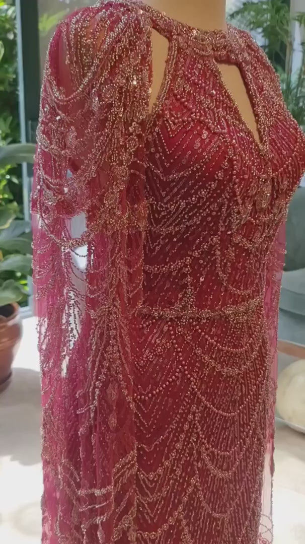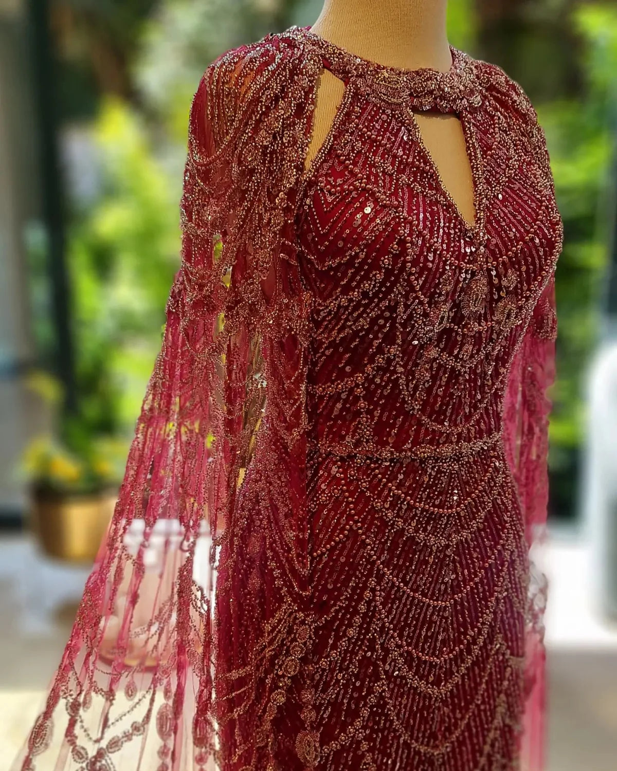 Enhance your evening look with the Elegant Burgundy Evening Gown with Cape SS089. The cascading cape adds a touch of sophistication while the deep burgundy color exudes elegance. Made with high-quality materials and expert craftsmanship, this gown is perfect for any formal occasion.