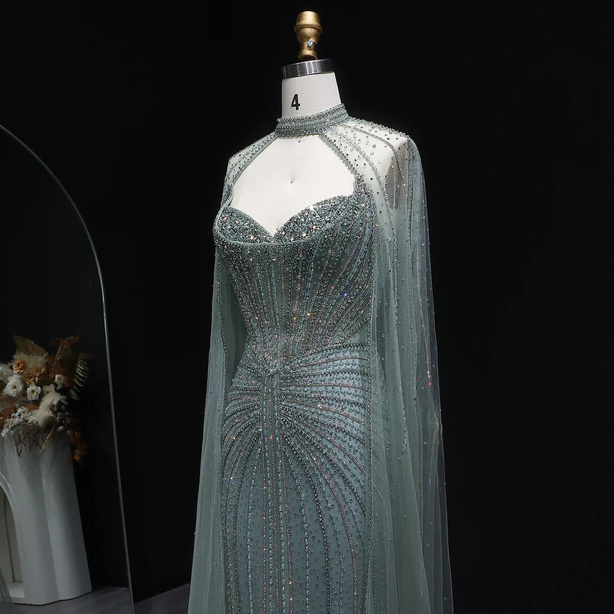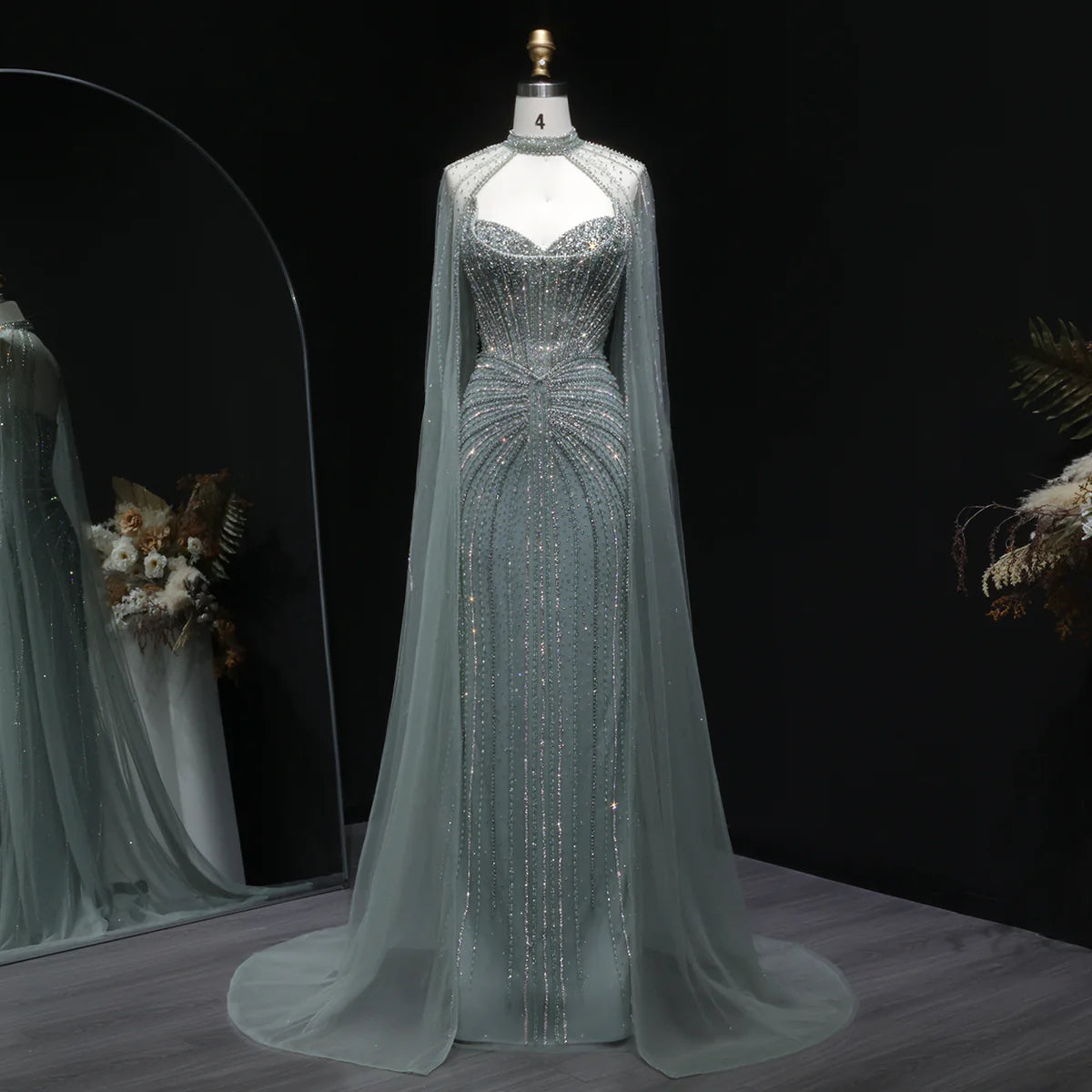 Green Luxury Beaded Evening Dress with Flowing Long Cape SS156