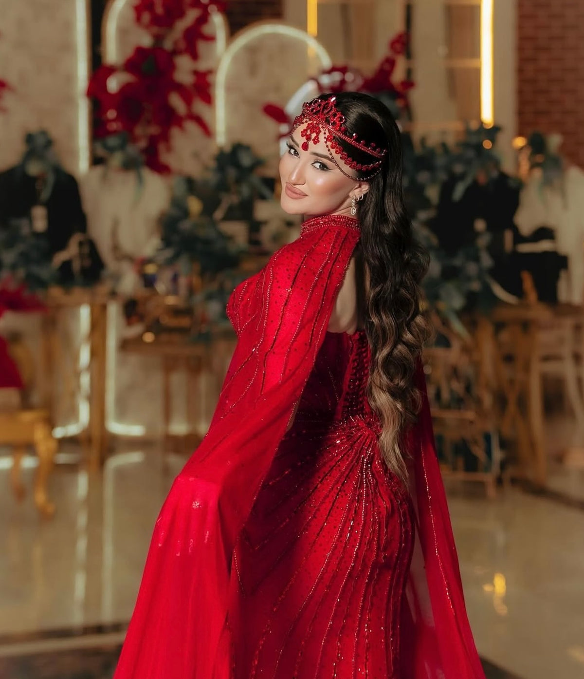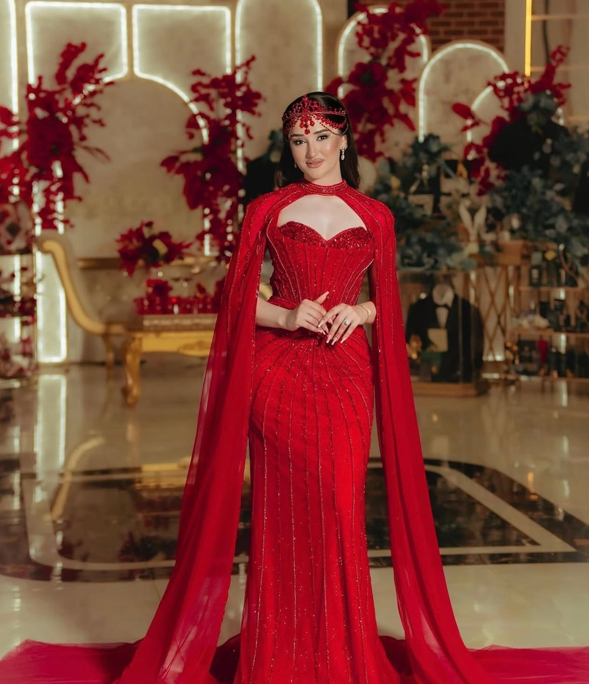 Elevate your evening elegance with this Green Luxury Beaded Evening Dress featuring a flowing long cape. Expertly crafted, the intricate beadwork adds refined texture and shimmer, while the cape creates a dramatic silhouette that moves gracefully. Perfect for formal occasions, this dress combines sophisticated design with standout style to ensure you make a memorable impression.