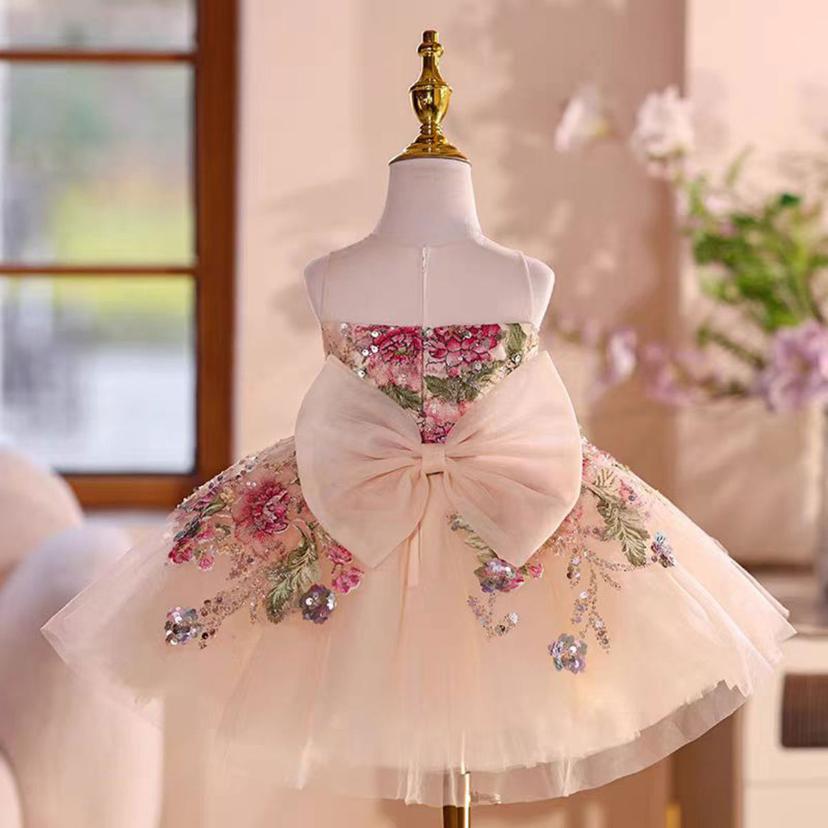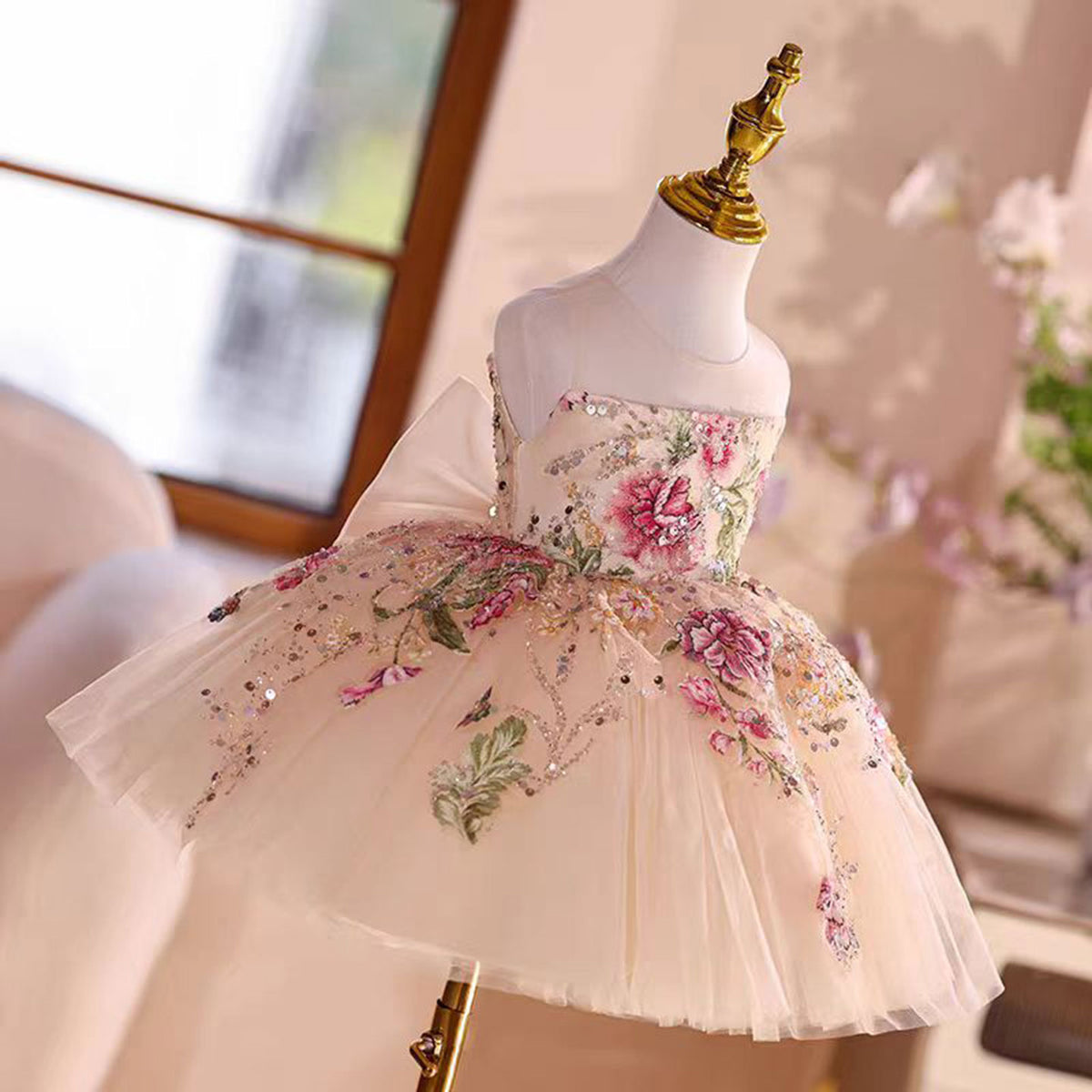 Strapless Design Embroidered Flower Girl Dress Bow Sleeveless D012