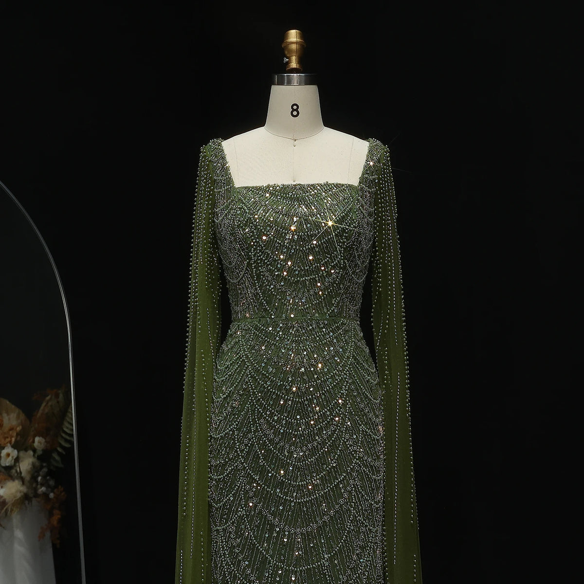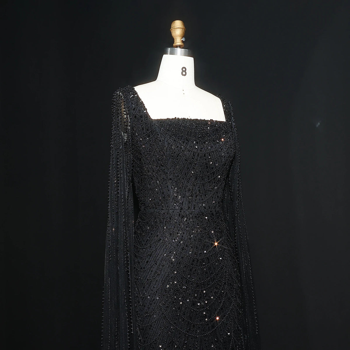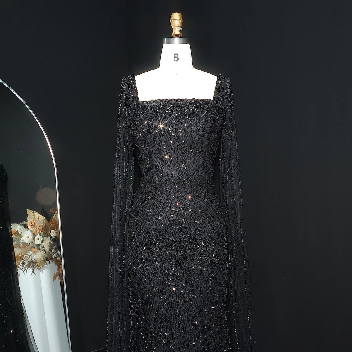 Experience elegance and glamour with our Luxury Beaded Blue Mermaid Evening Dress. The intricate beading and cape sleeves add a touch of luxury and sophistication to this stunning dress. Stand out at any event and feel confident in this timeless and figure-flattering silhouette.