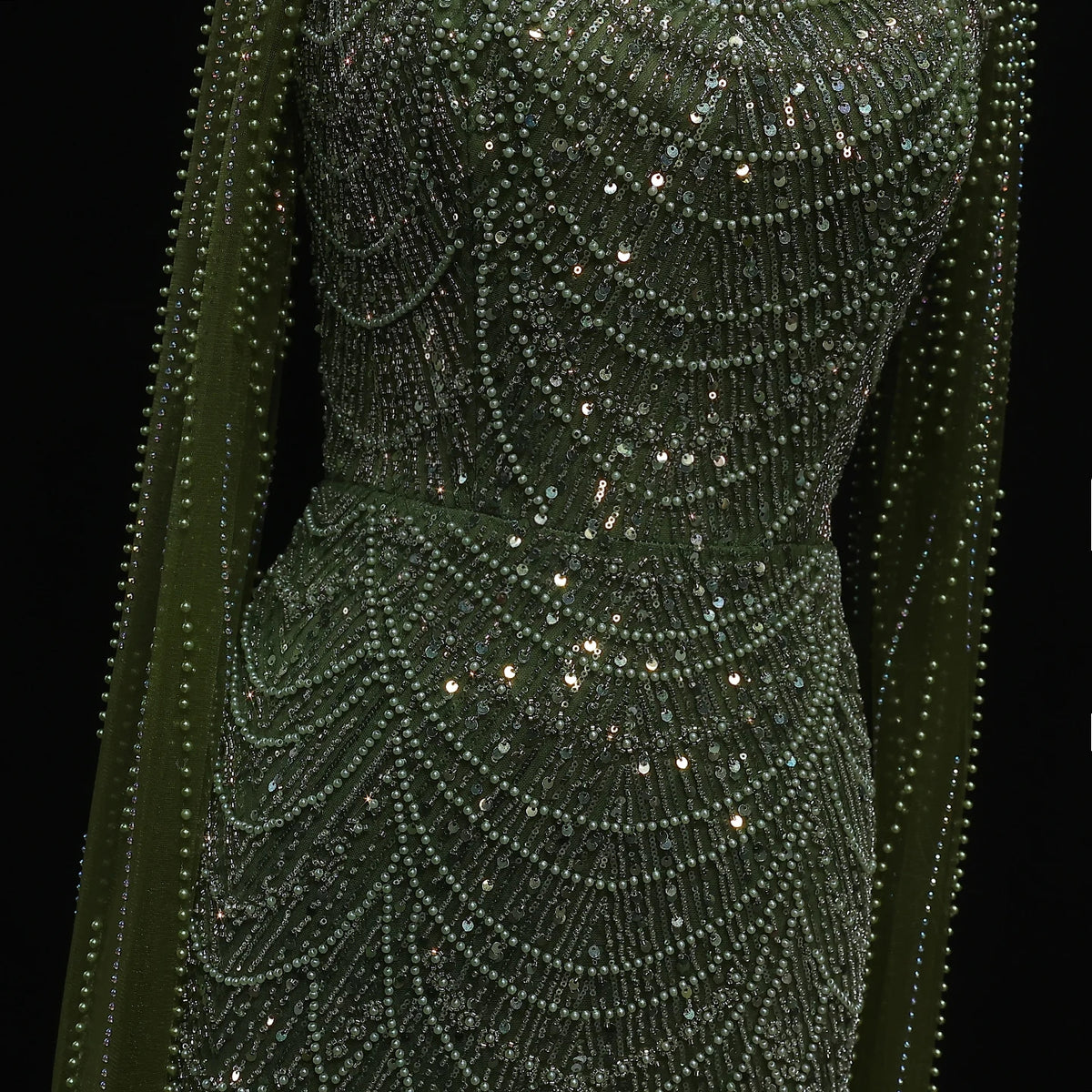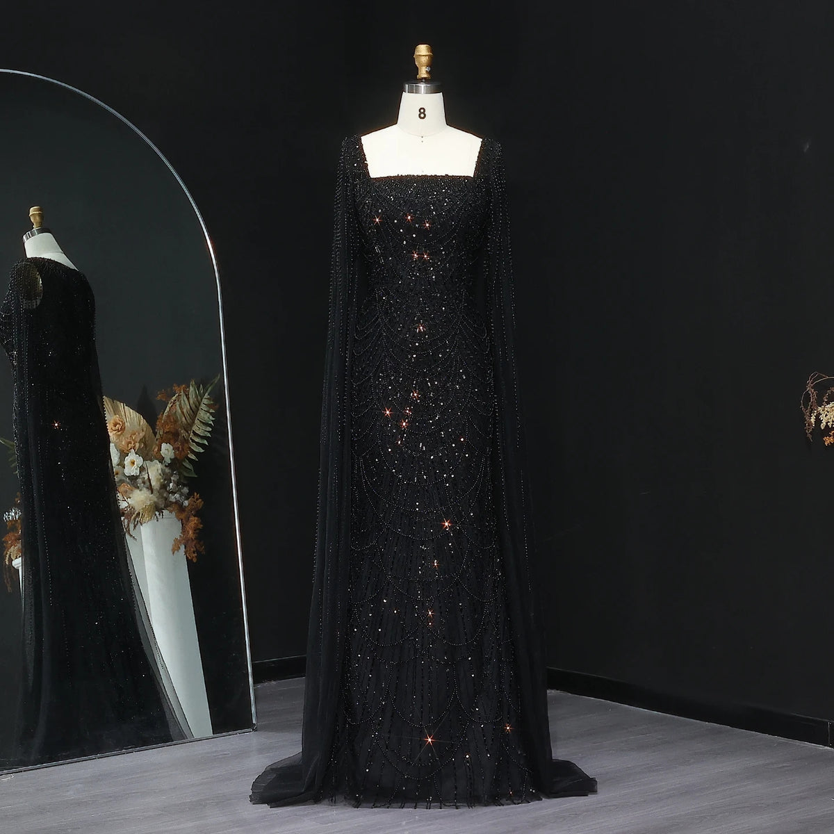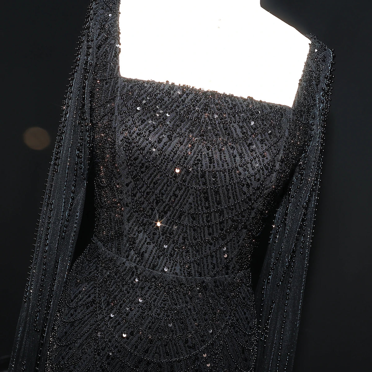 Experience elegance and glamour with our Luxury Beaded Blue Mermaid Evening Dress. The intricate beading and cape sleeves add a touch of luxury and sophistication to this stunning dress. Stand out at any event and feel confident in this timeless and figure-flattering silhouette.