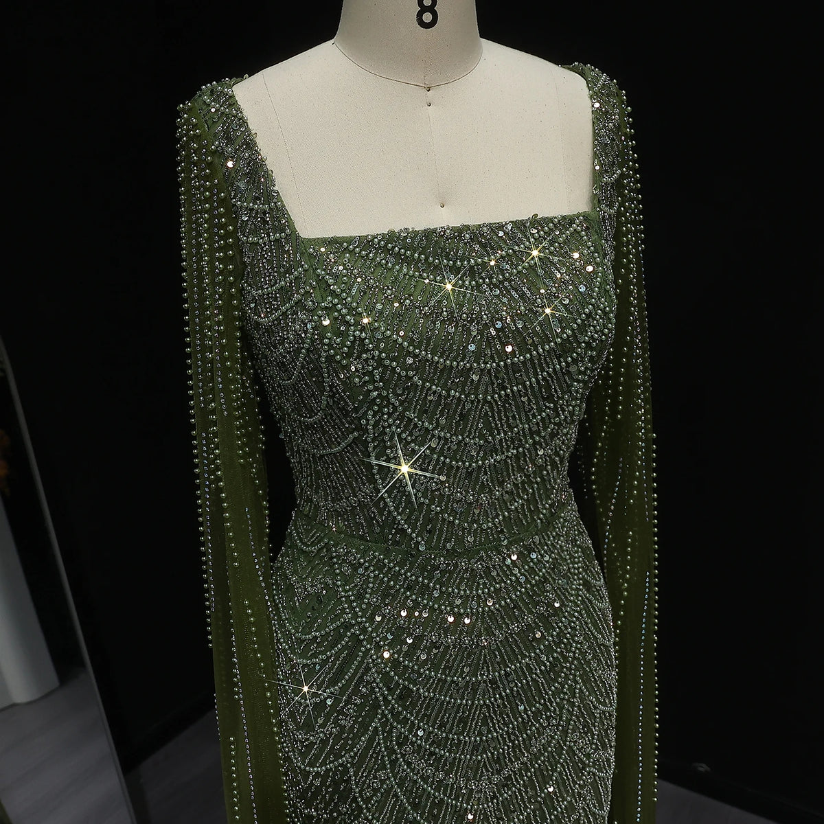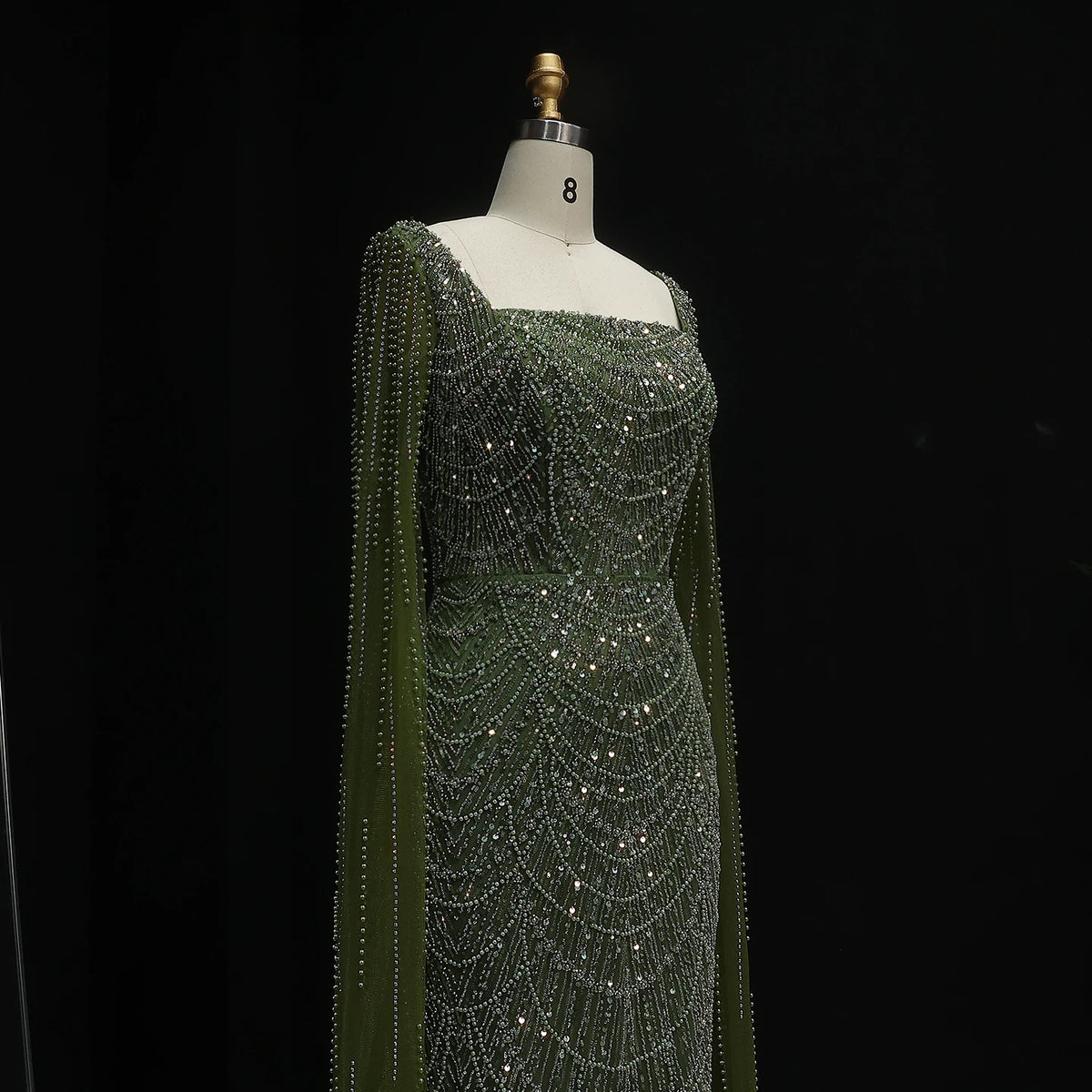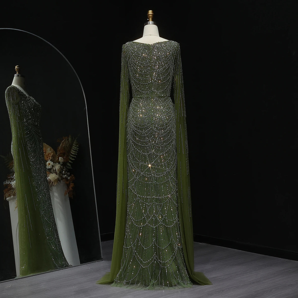 Luxury Beaded Blue Mermaid Evening Dress with Cape Sleeves SS690