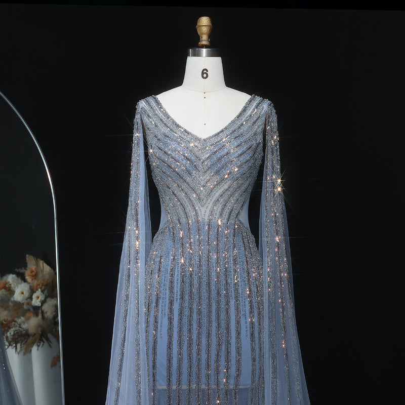 Blue Beaded Evening Dress with Cape Sleeves SS032