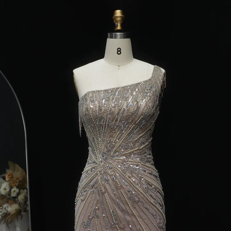 Champagne One Shoulder Tassel Mermaid Evening Dress SS031