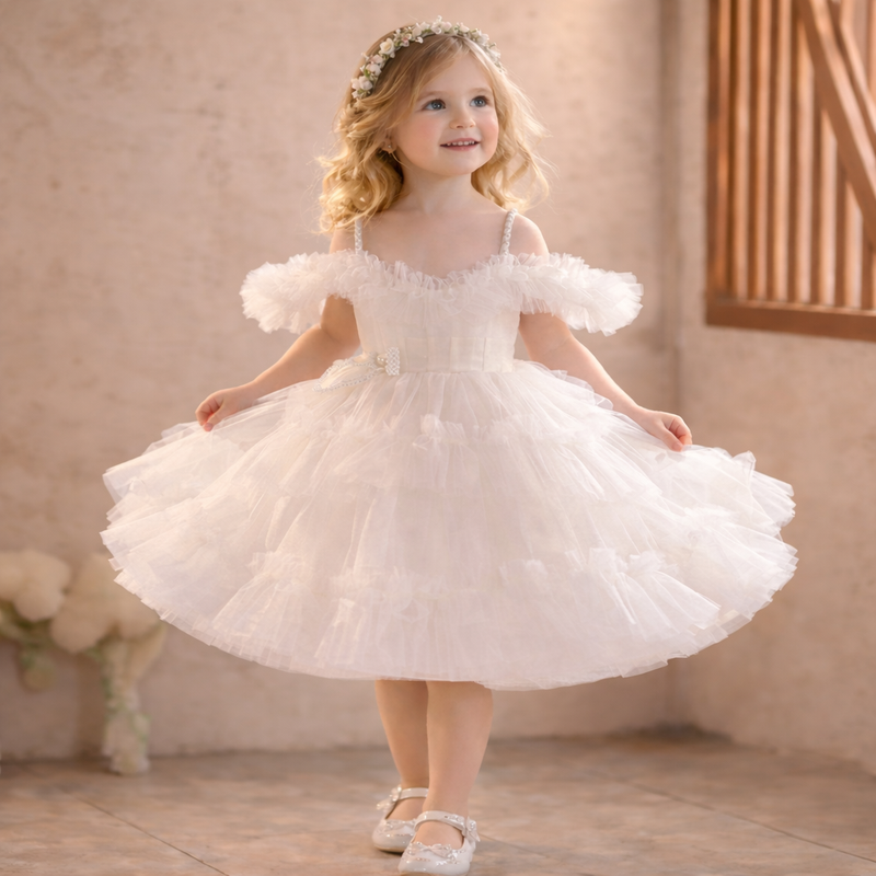 Off-Shoulder Applique Tiered Tulle Flower Girl Dress D322