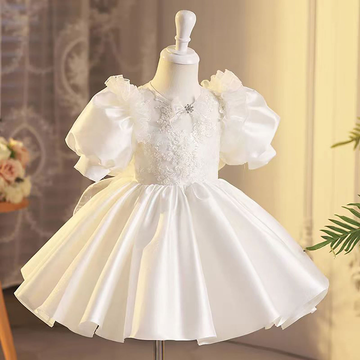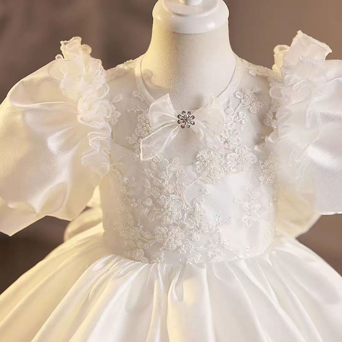 Embroidered Lace Satin Flower Girl Dress With Bow D088