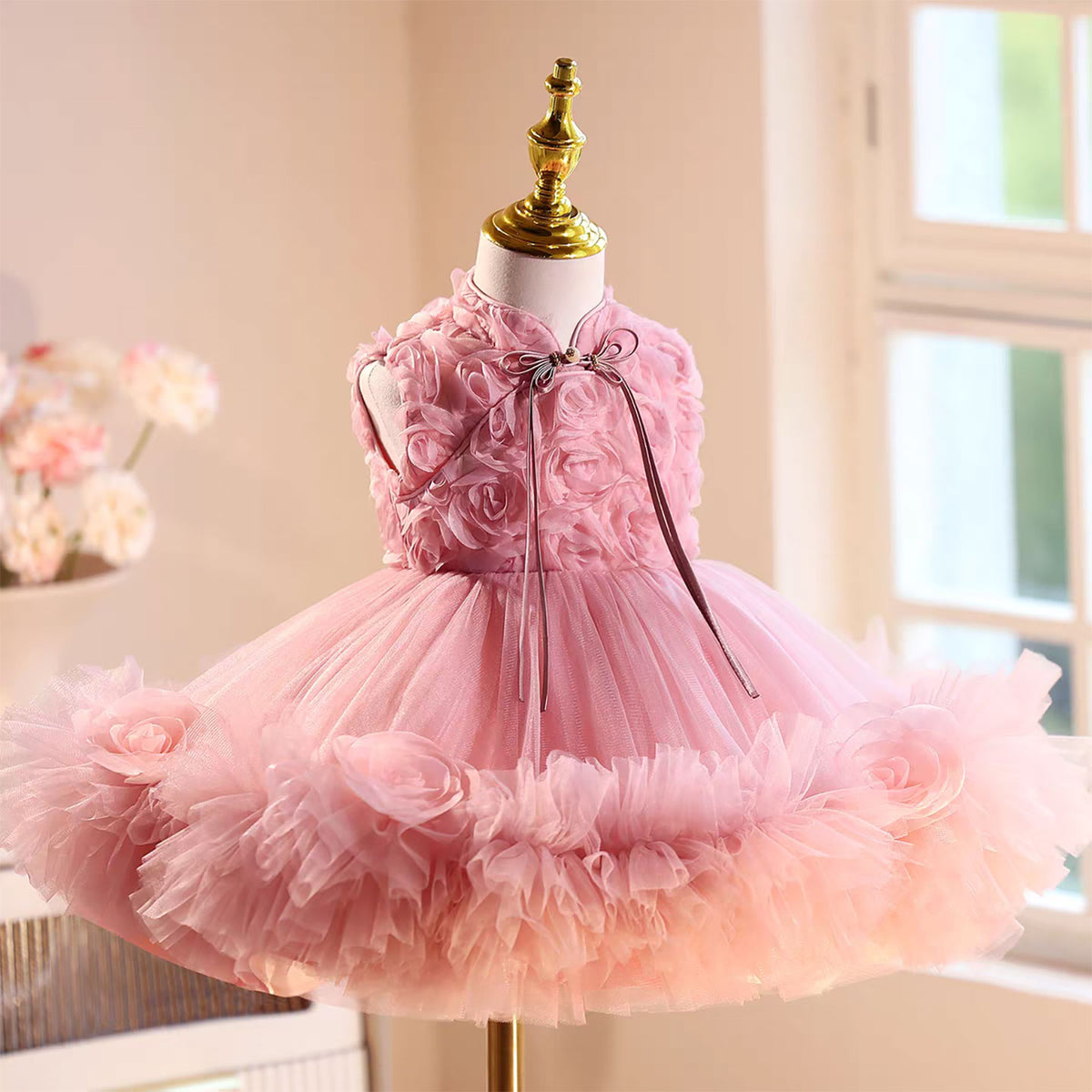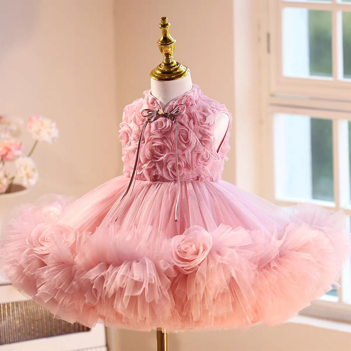 Mandarin Neckline Sleeveless Pink Tulle Flower Girl Dress J559