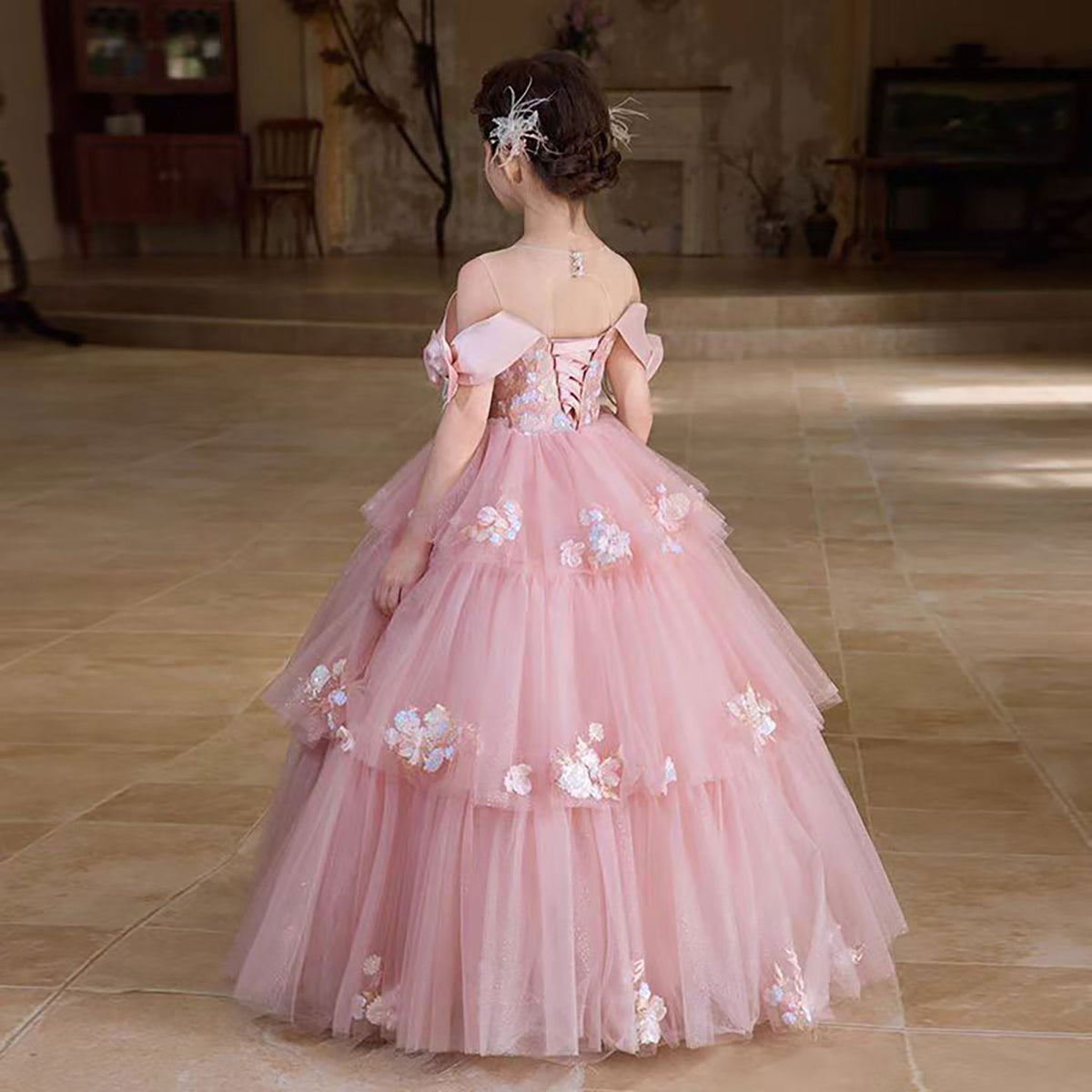 Off-Shoulder Applique Tiered Tulle Flower Girl Dress D322