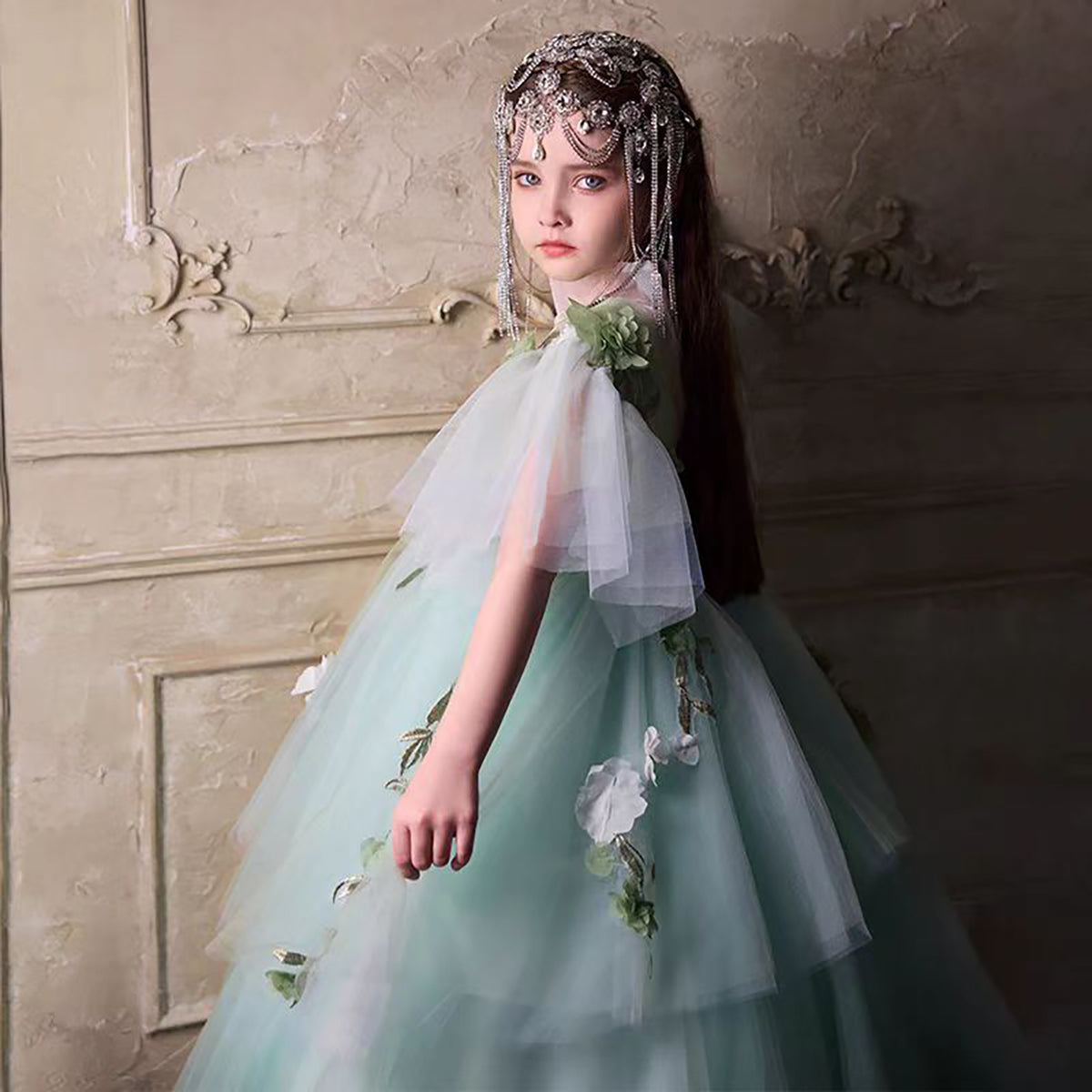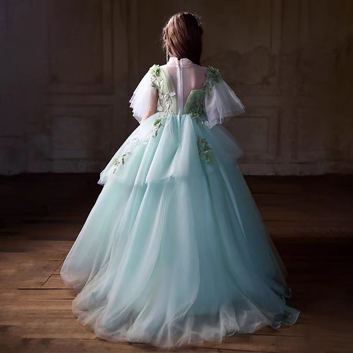 Soft Romantic High Collar Applique Flower Girl Dress Wedding Birthday Party Beauty Pageant Ball J214