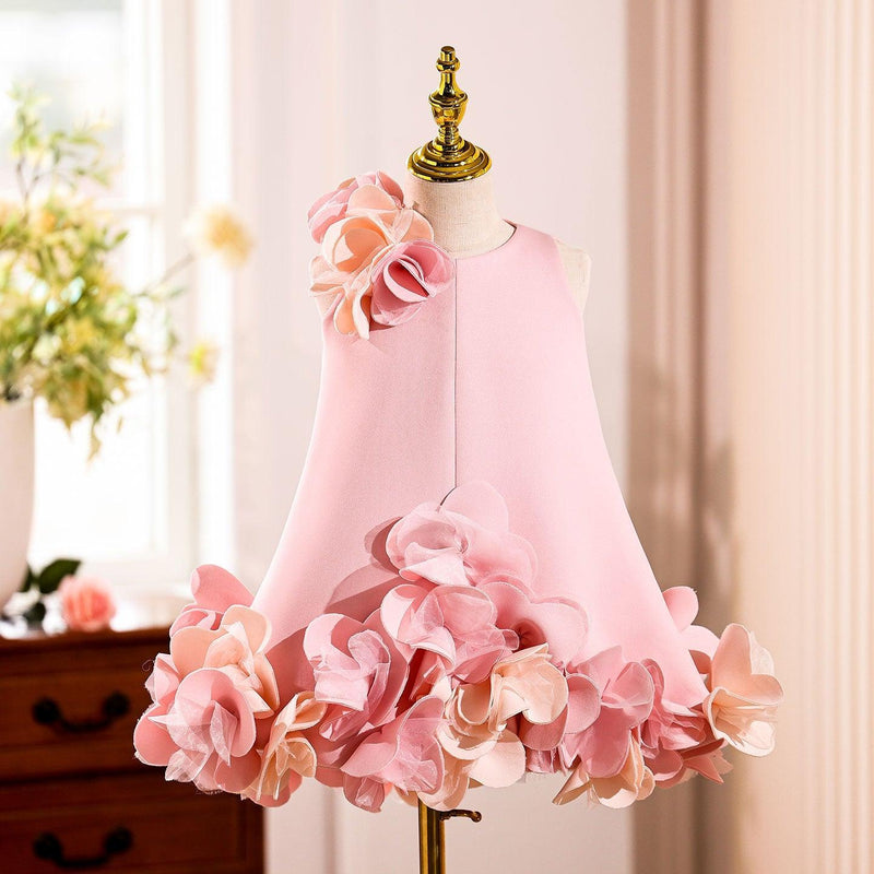 Pink Dubai Girl Dress 3D Flowers Arabic Princess Kids J384