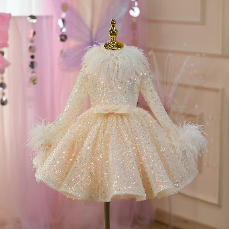 Luxury Champagne Girl Dress Feathers Sequined Dubai Kids J320