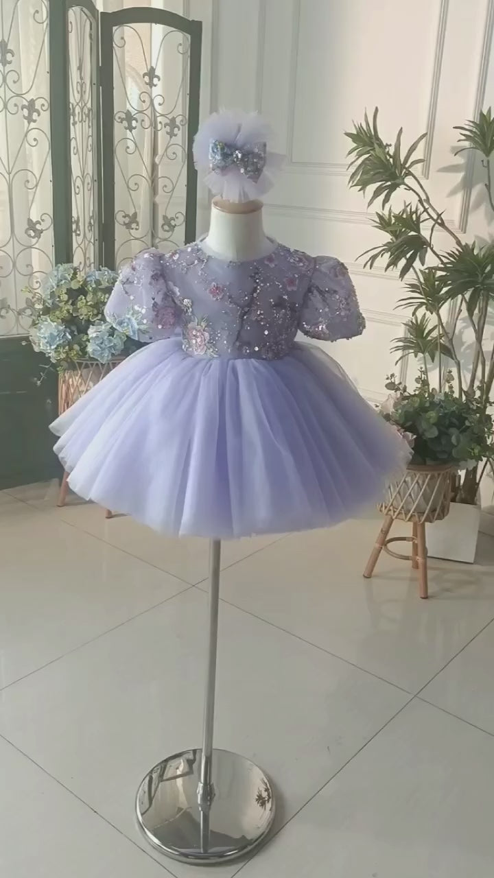 Lilac Knee Length 1st Birthday Girl Dress Puffy Sleeve J307