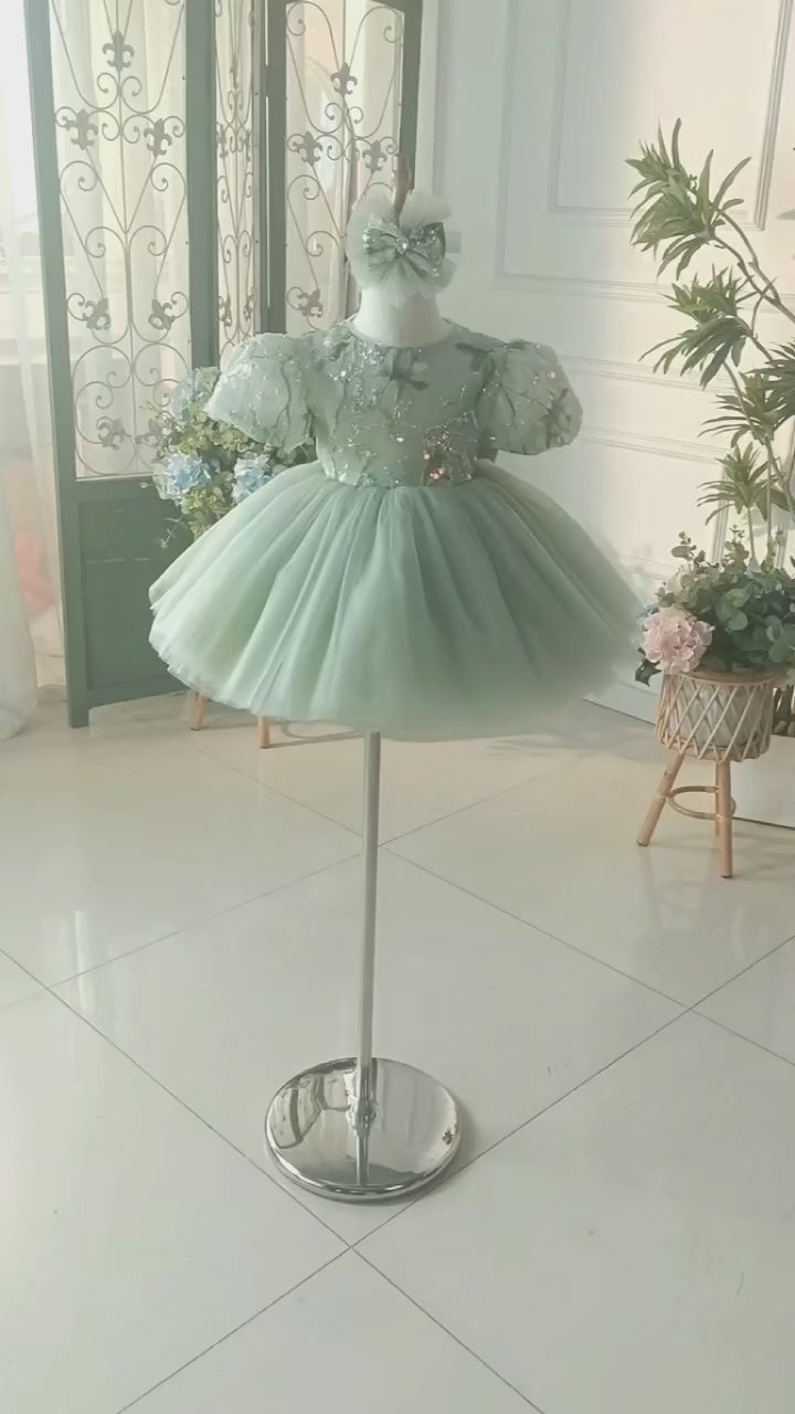 Green Knee Length Baby 1st Birthday Girl Dress J310
