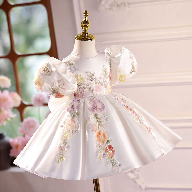 White Beaded Puff Sleeve Flower Girl Dress First Communion Ball Gown J581