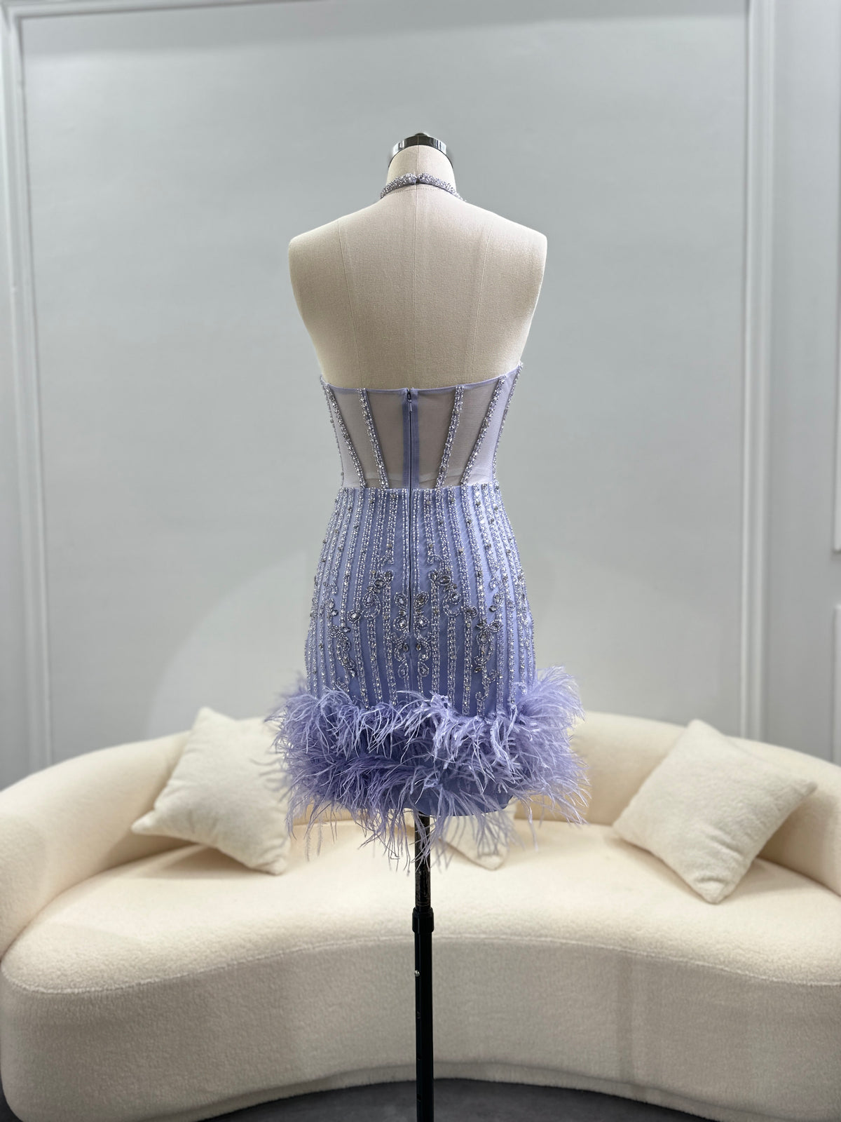 Experience luxury and elegance in our Dreamy Vow Luxury Feathers Nude Short Mini Cocktail Prom Dresses. With a halter neckline and feather embellishments, this lilac gown is perfect for weddings and homecoming parties. Made with high-quality materials, it's both comfortable and stylish. Make a statement at your next event.