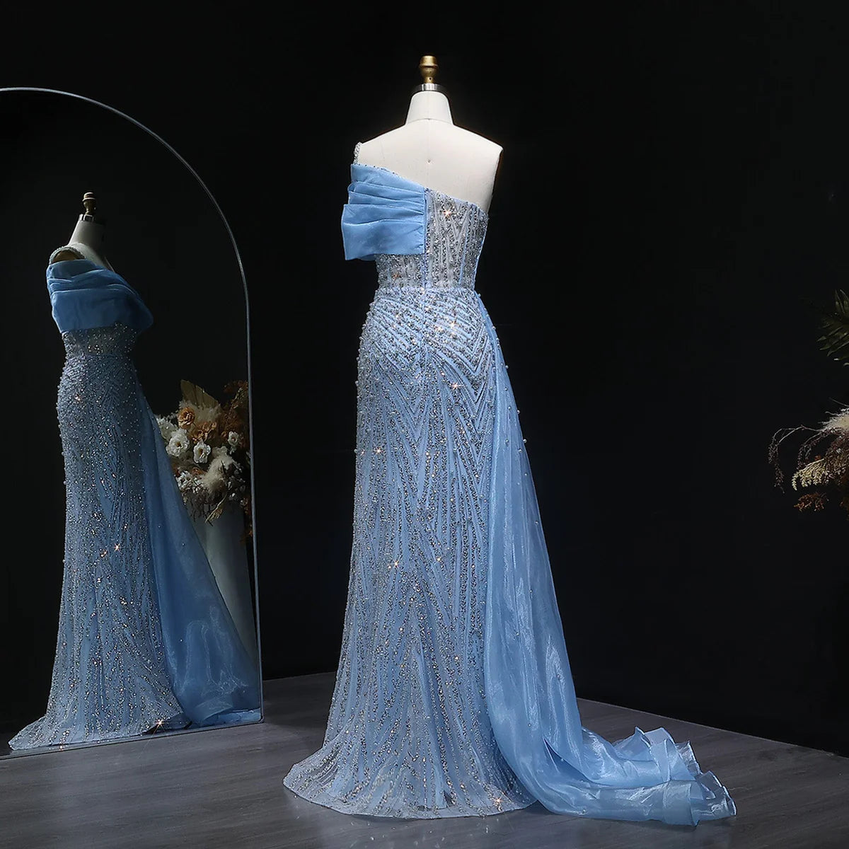 Luxury One Shoulder Blue Evening Dress with Overskirt SS644