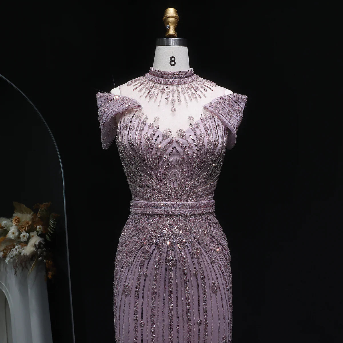 This elegant evening dress is adorned with meticulously crafted crystal beadwork that catches the light beautifully. Featuring a sheer cape, the design adds an ethereal touch while enhancing movement and grace. Perfect for upscale events, this dress combines refined details with sophisticated silhouette to elevate your formal wardrobe.